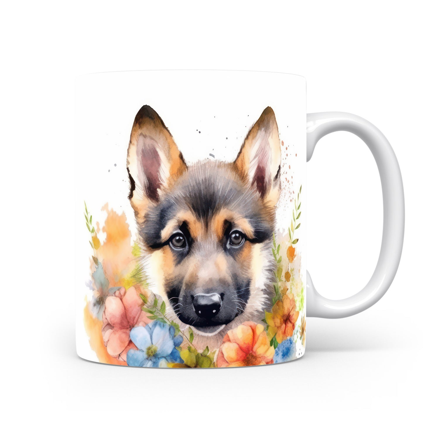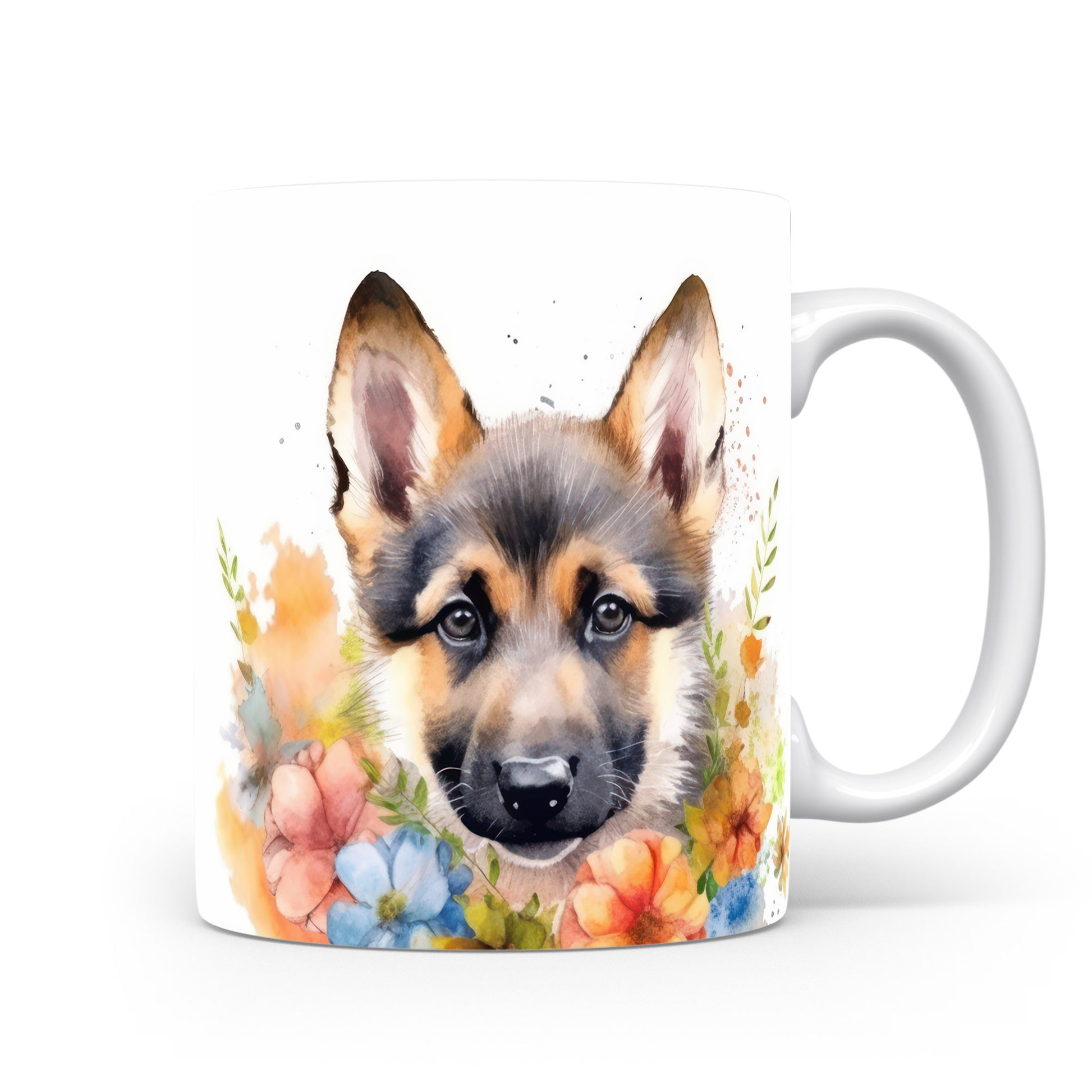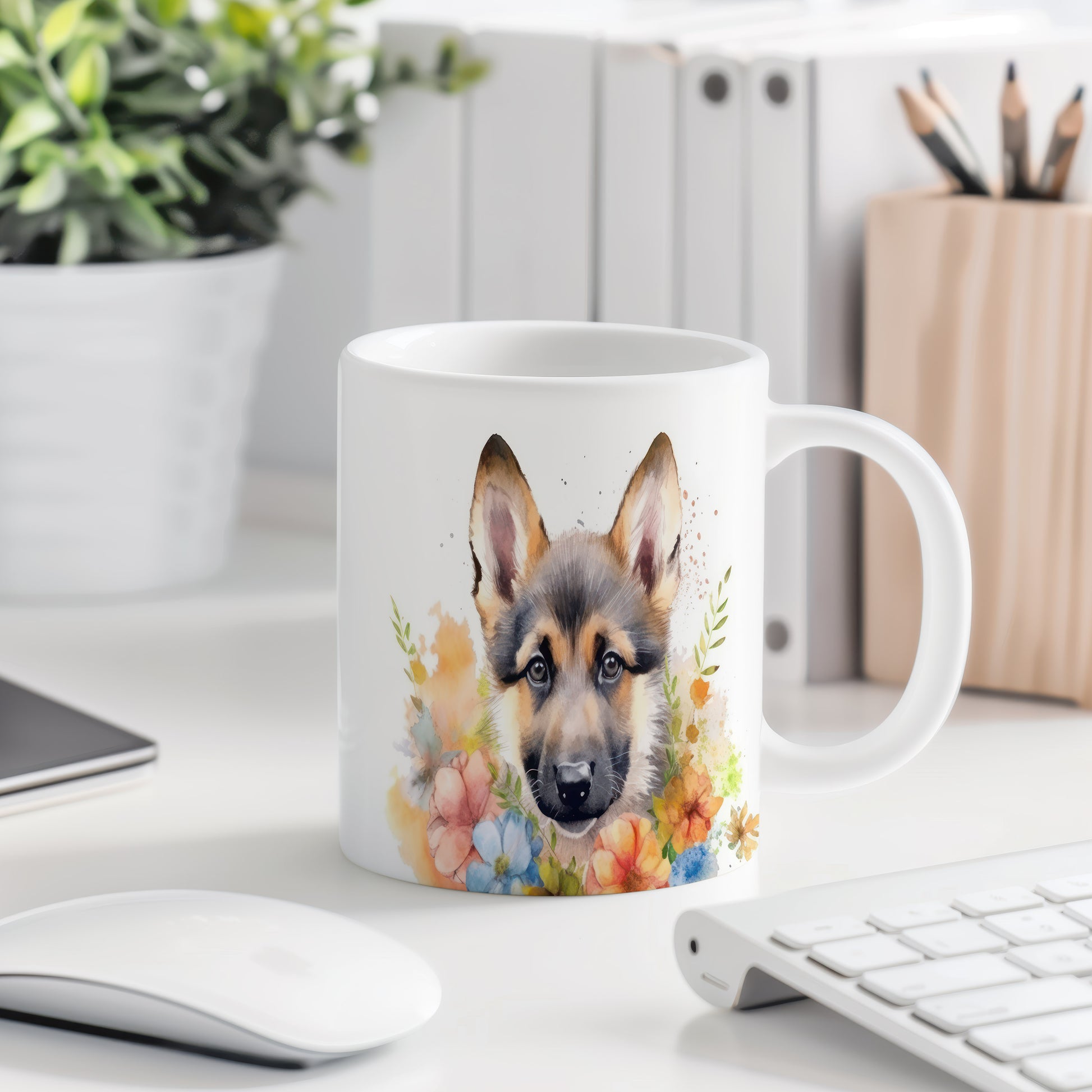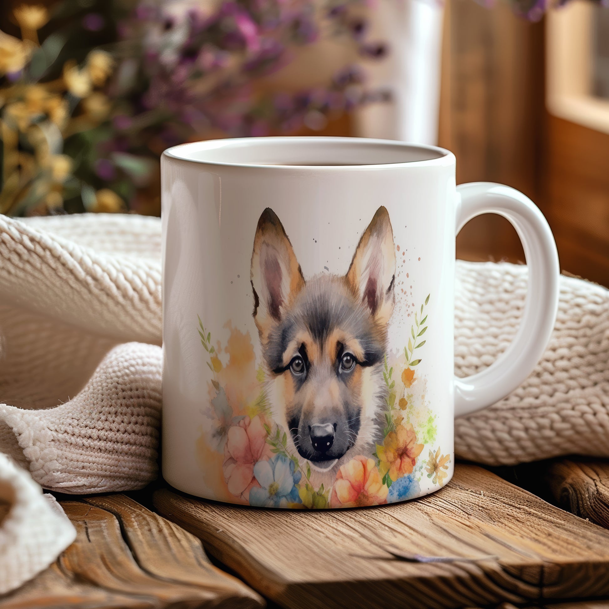 Hrnek s německým ovčákem a květinami – výrazným designem
