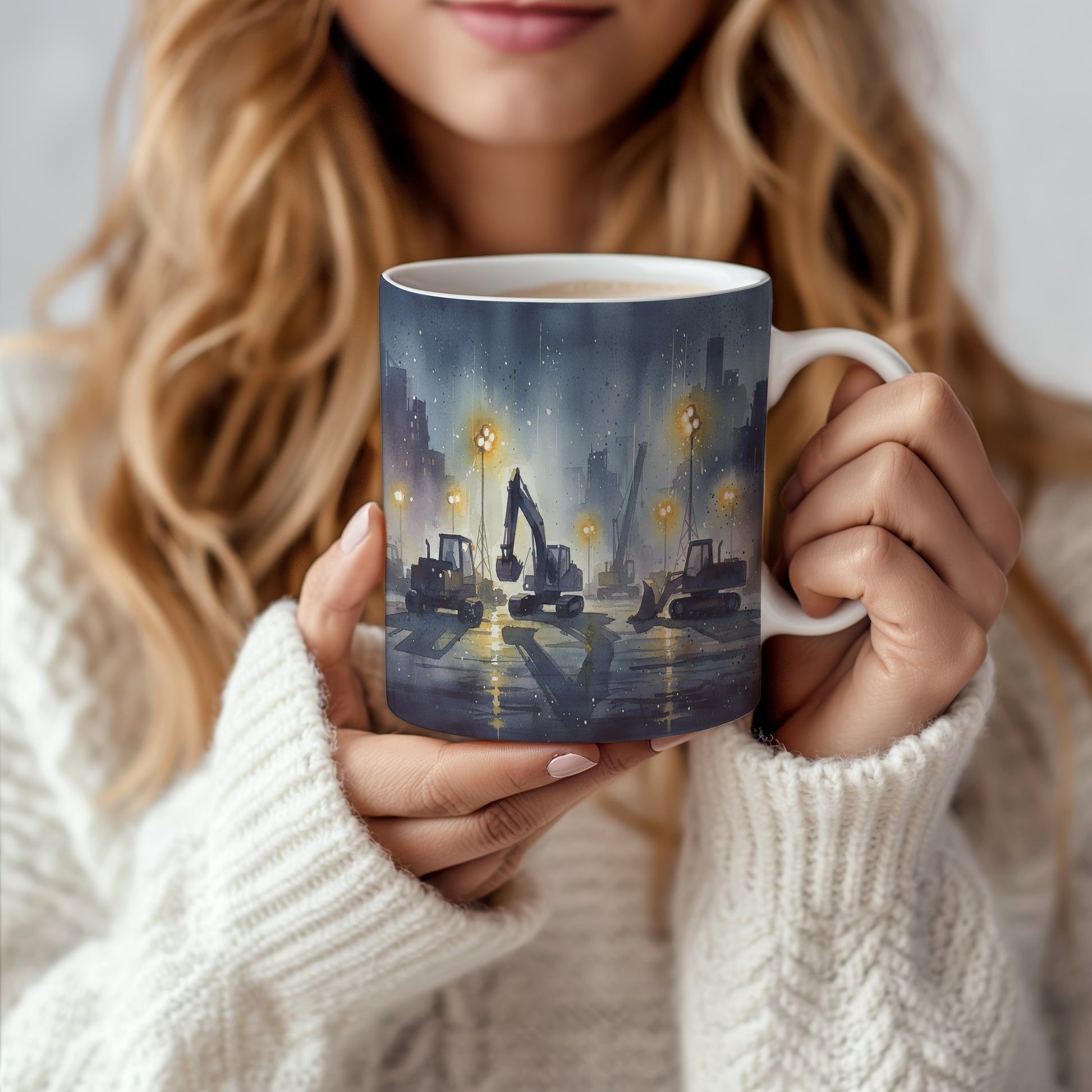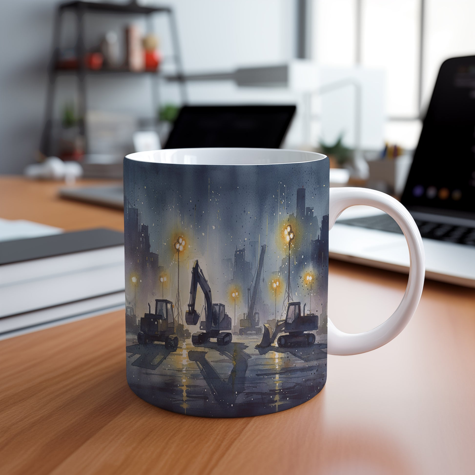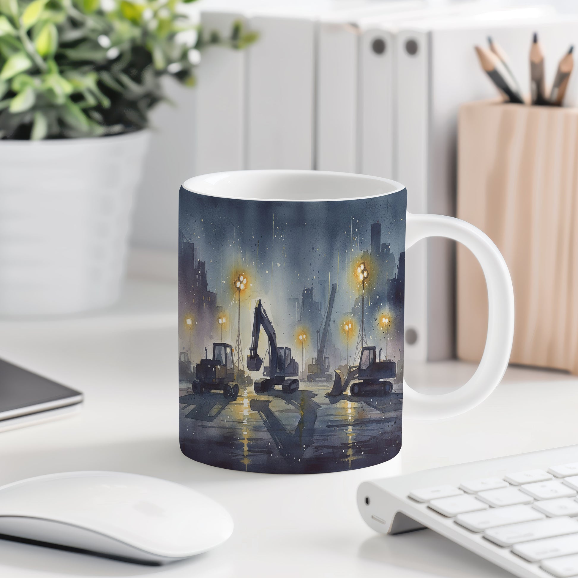 Objevte kouzlo nočního staveniště s jemně osvětlenými stavebními stroji v akvarelovém provedení. Hrnek 330 ml – vhodný do myčky i mikrovlnky.