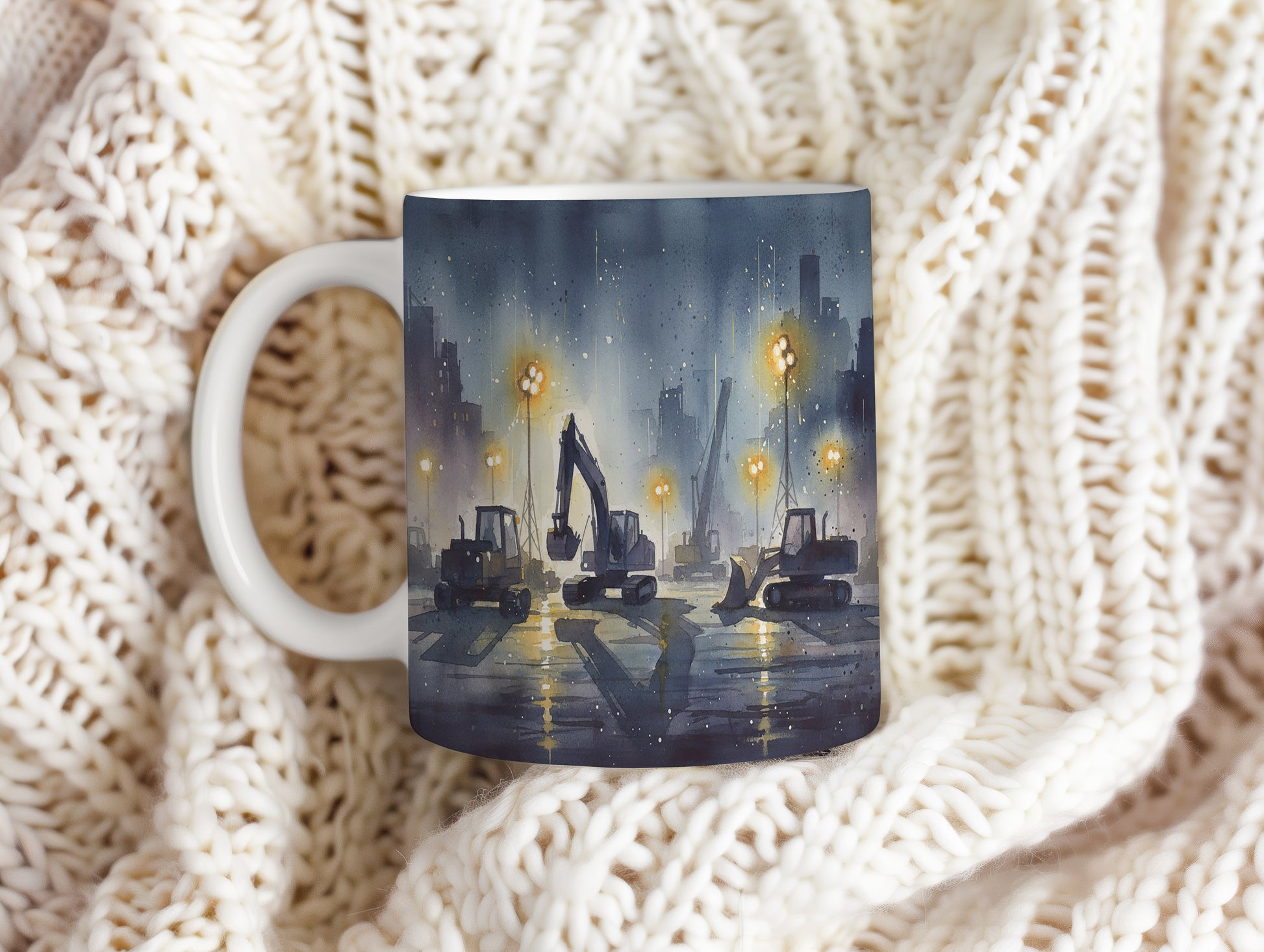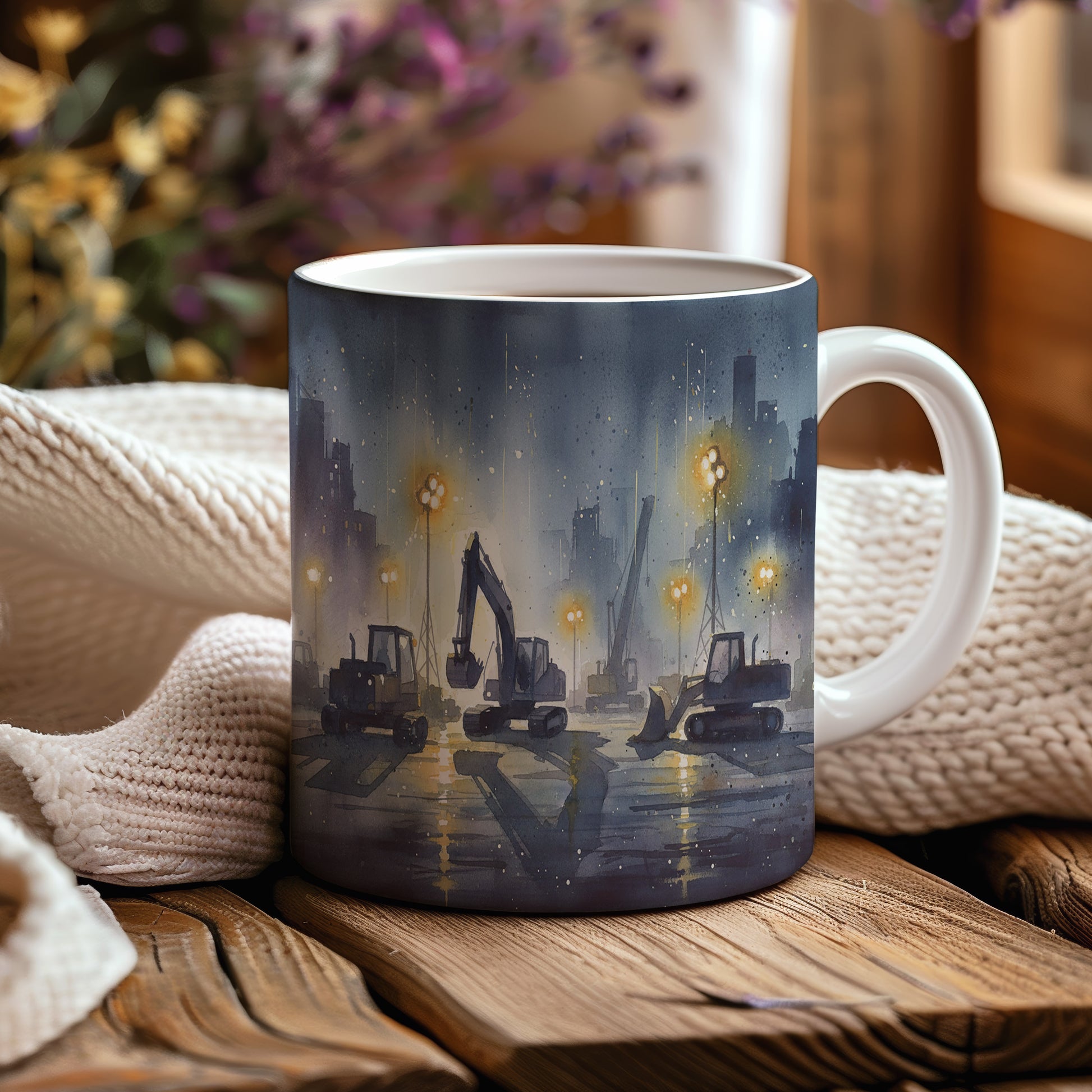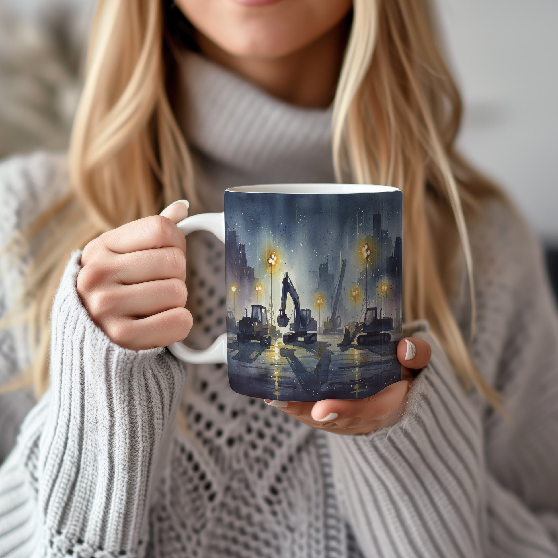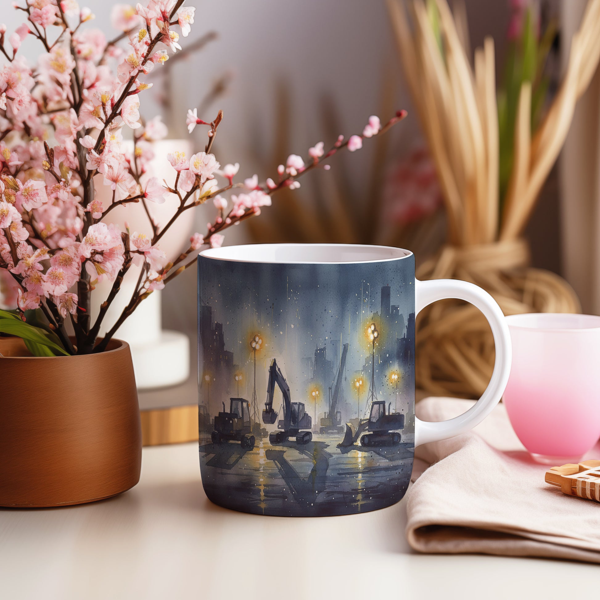 Objevte kouzlo nočního staveniště s jemně osvětlenými stavebními stroji v akvarelovém provedení. Hrnek 330 ml – vhodný do myčky i mikrovlnky.