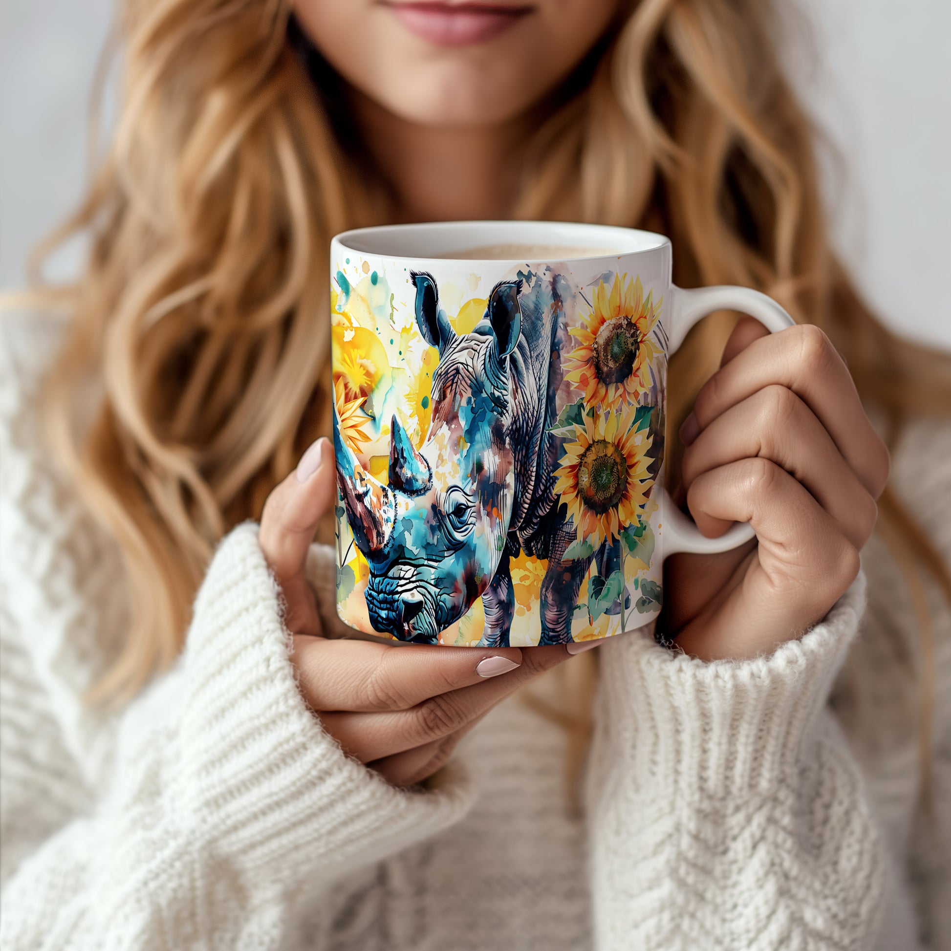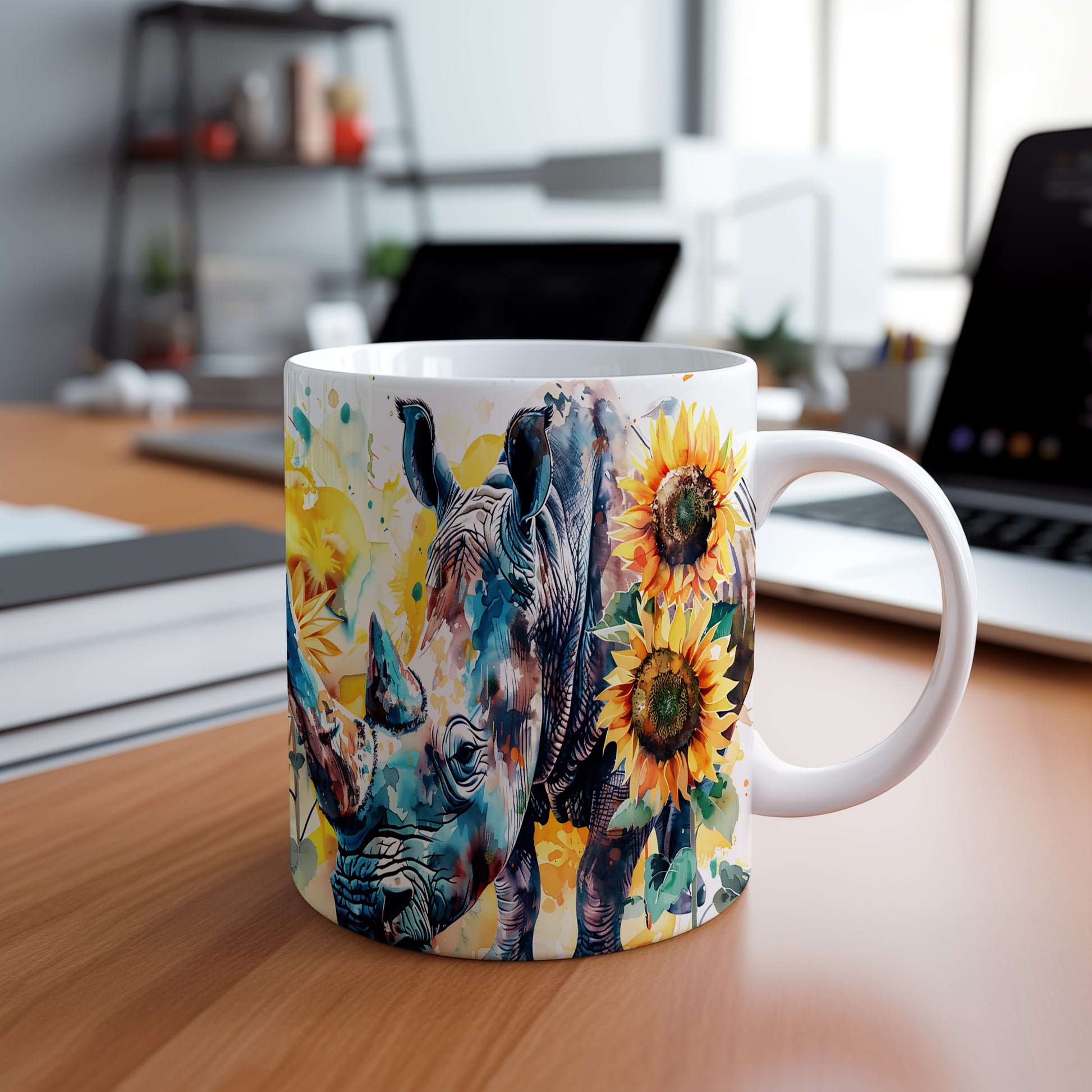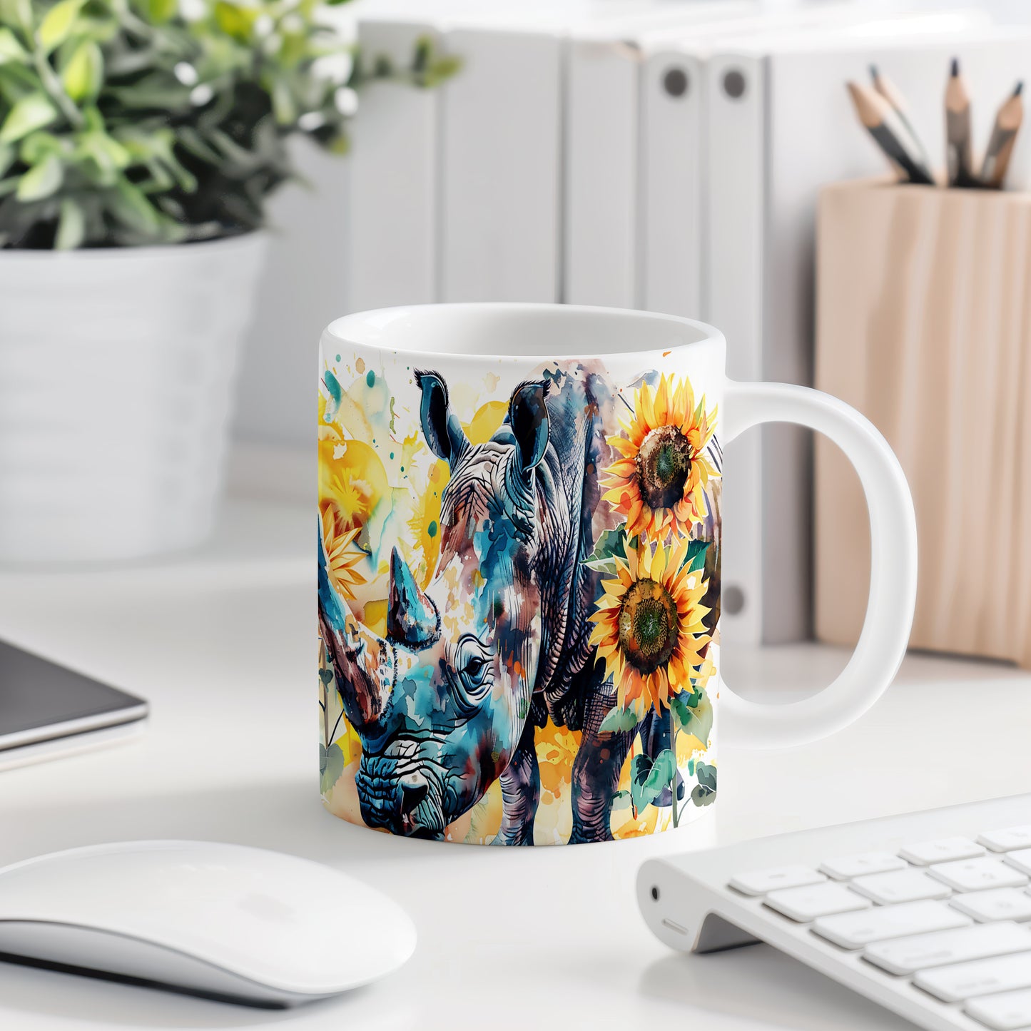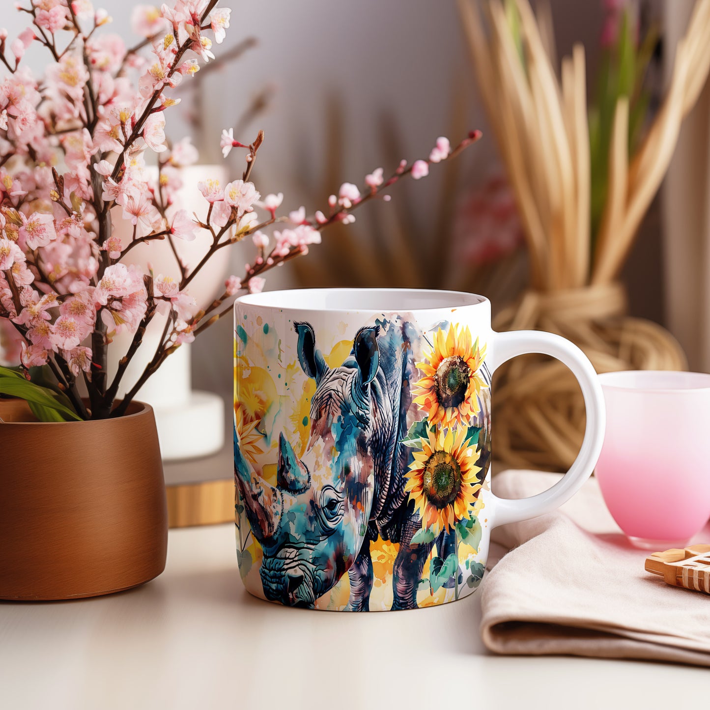 Hrnek s nosorožcem a slunečnicemi přináší veselý a barevný motiv. Je ideální pro milovníky přírody a zvířat, skvělý tip na dárek pro přátele nebo rodinu. Materiál: keramika. Objem: 330 ml. Vhodné do myčky i mikrovlnky. Tento hrnek vám zpříjemní každé ráno a dodá pozitivní energii.