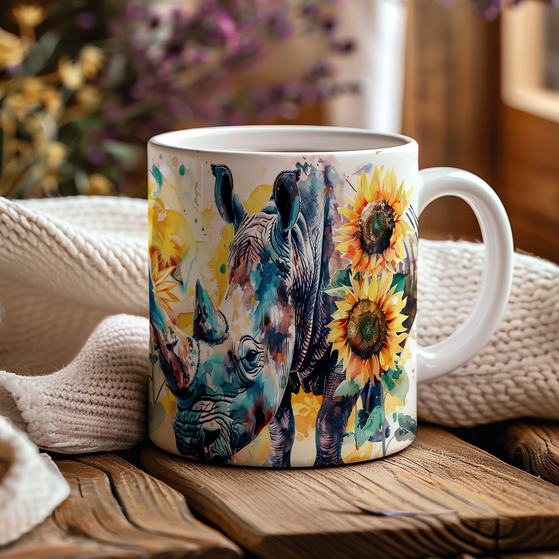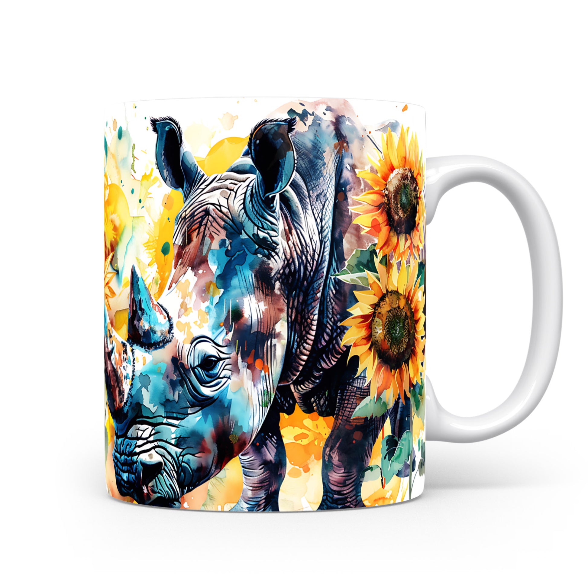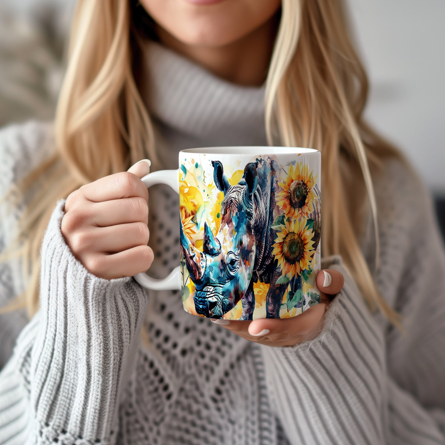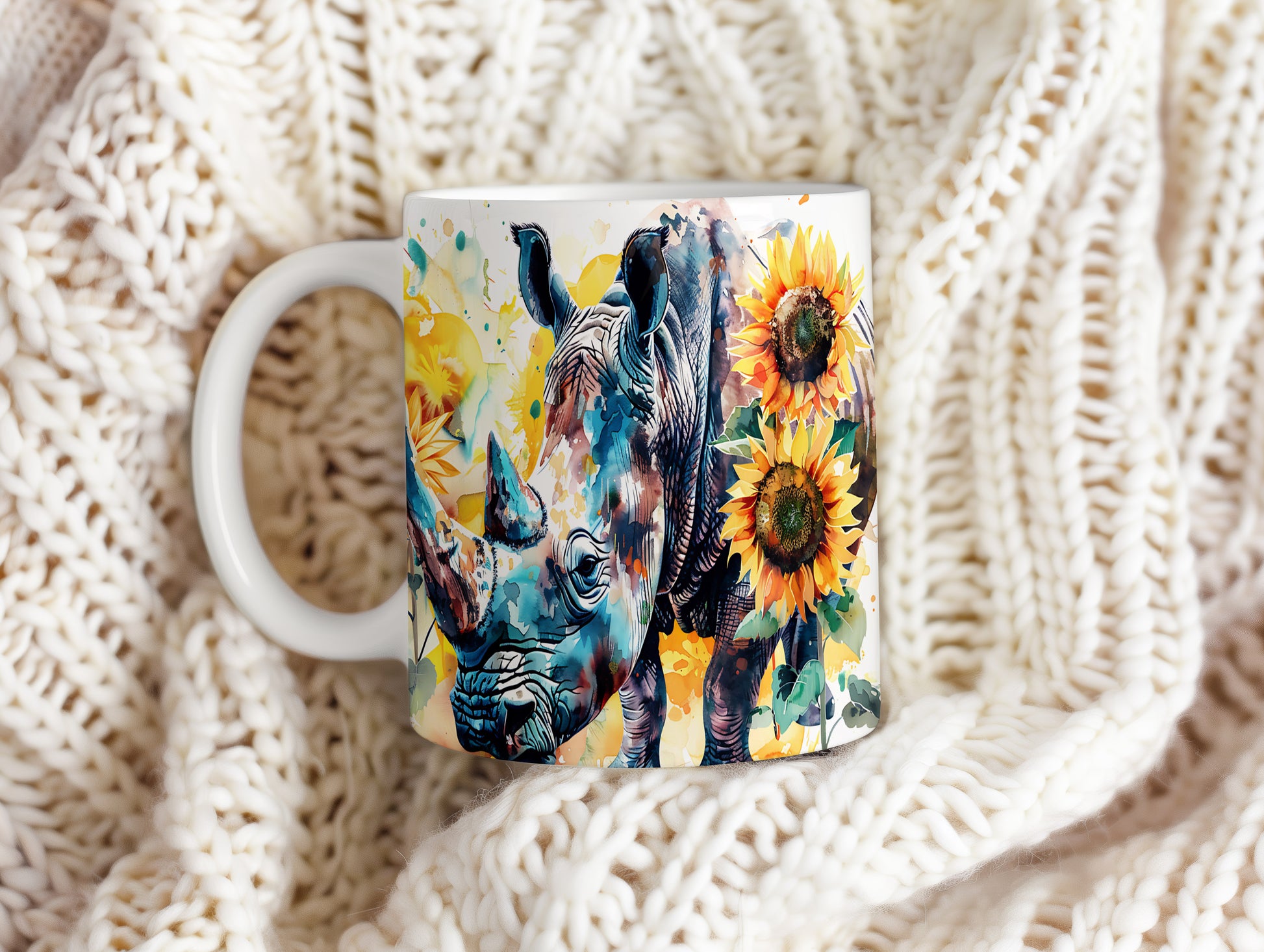 Hrnek s nosorožcem a slunečnicemi přináší veselý a barevný motiv. Je ideální pro milovníky přírody a zvířat, skvělý tip na dárek pro přátele nebo rodinu. Materiál: keramika. Objem: 330 ml. Vhodné do myčky i mikrovlnky. Tento hrnek vám zpříjemní každé ráno a dodá pozitivní energii.