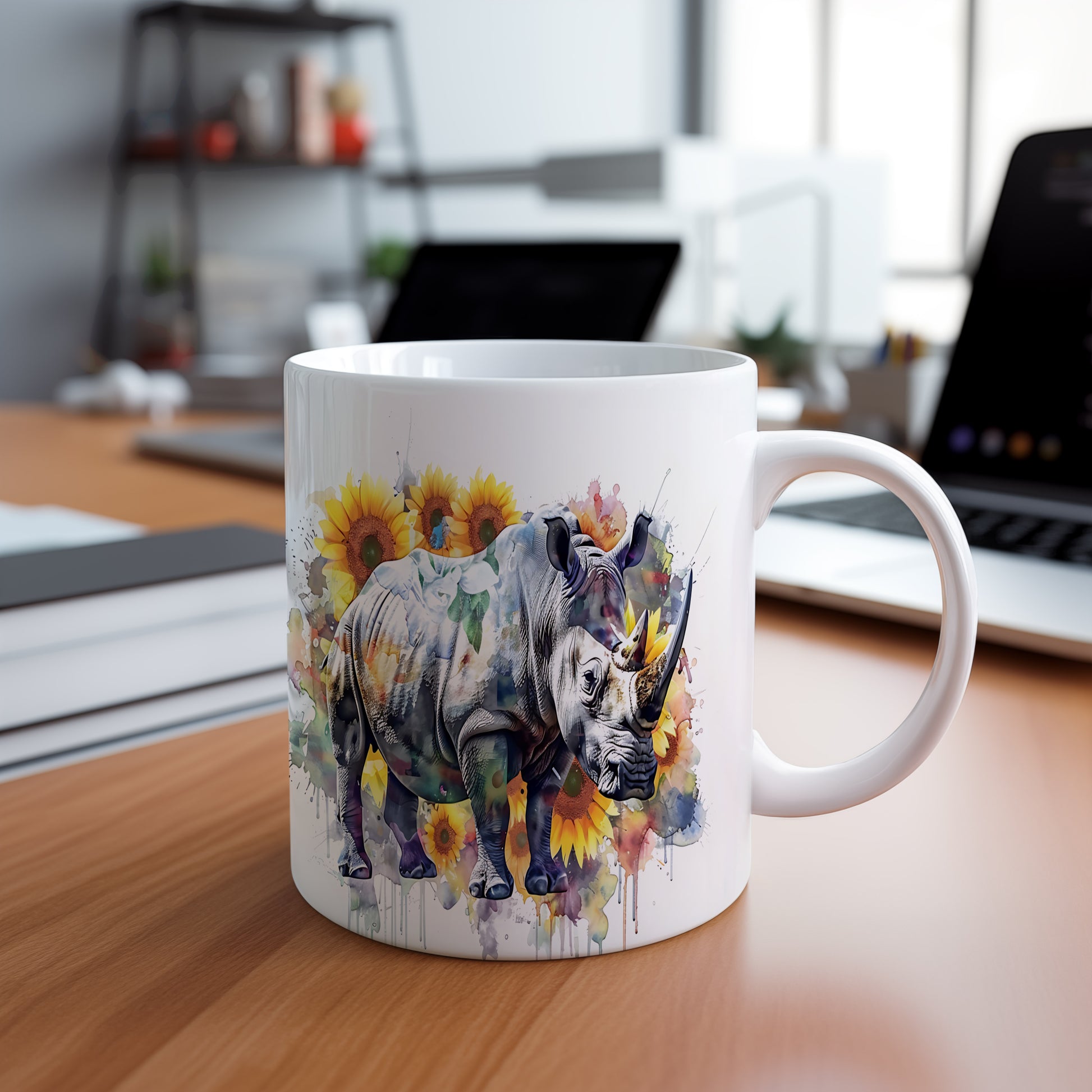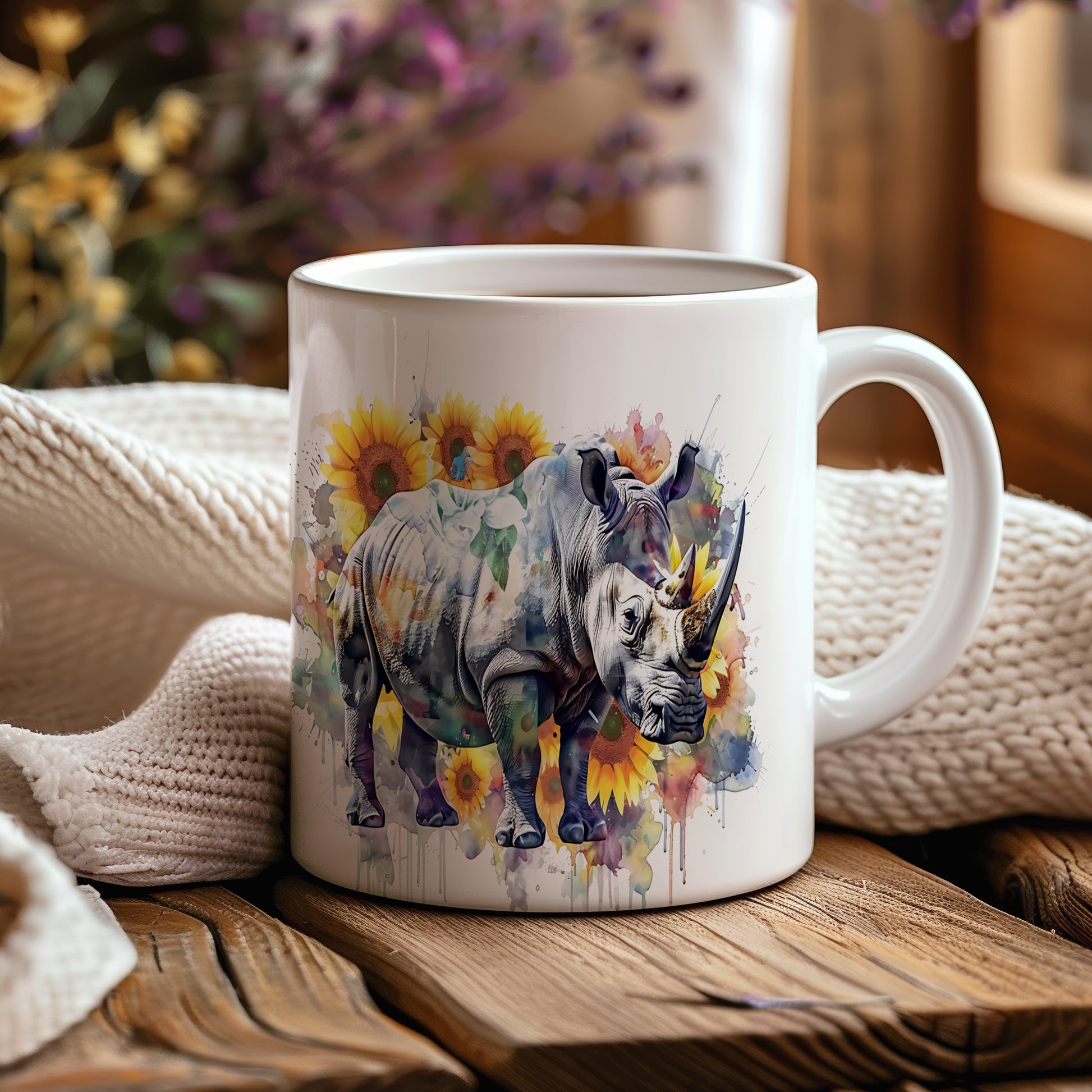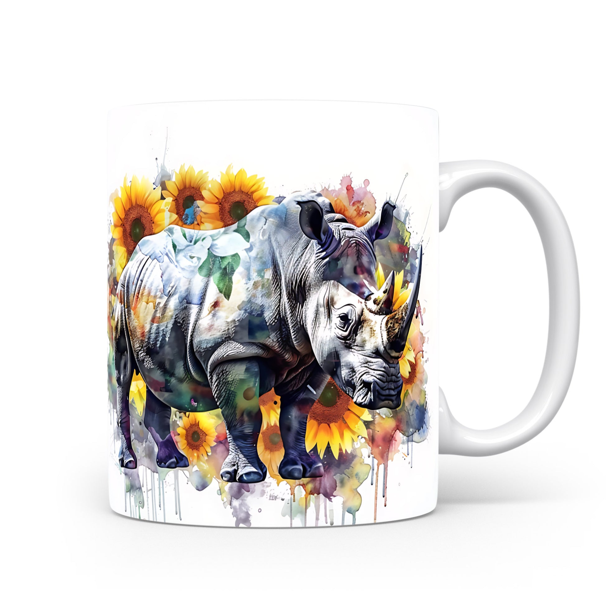 Tento hrnek s motivem nosorožce a slunečnic je skvělým kouskem pro milovníky přírody. Je ideální jako dárek pro přátele nebo rodinu, kteří ocení originální design. Materiál: keramika. Objem: 330 ml. Vhodné do myčky i mikrovlnky. Používání tohoto hrnku přináší radost a oživí každé pití.