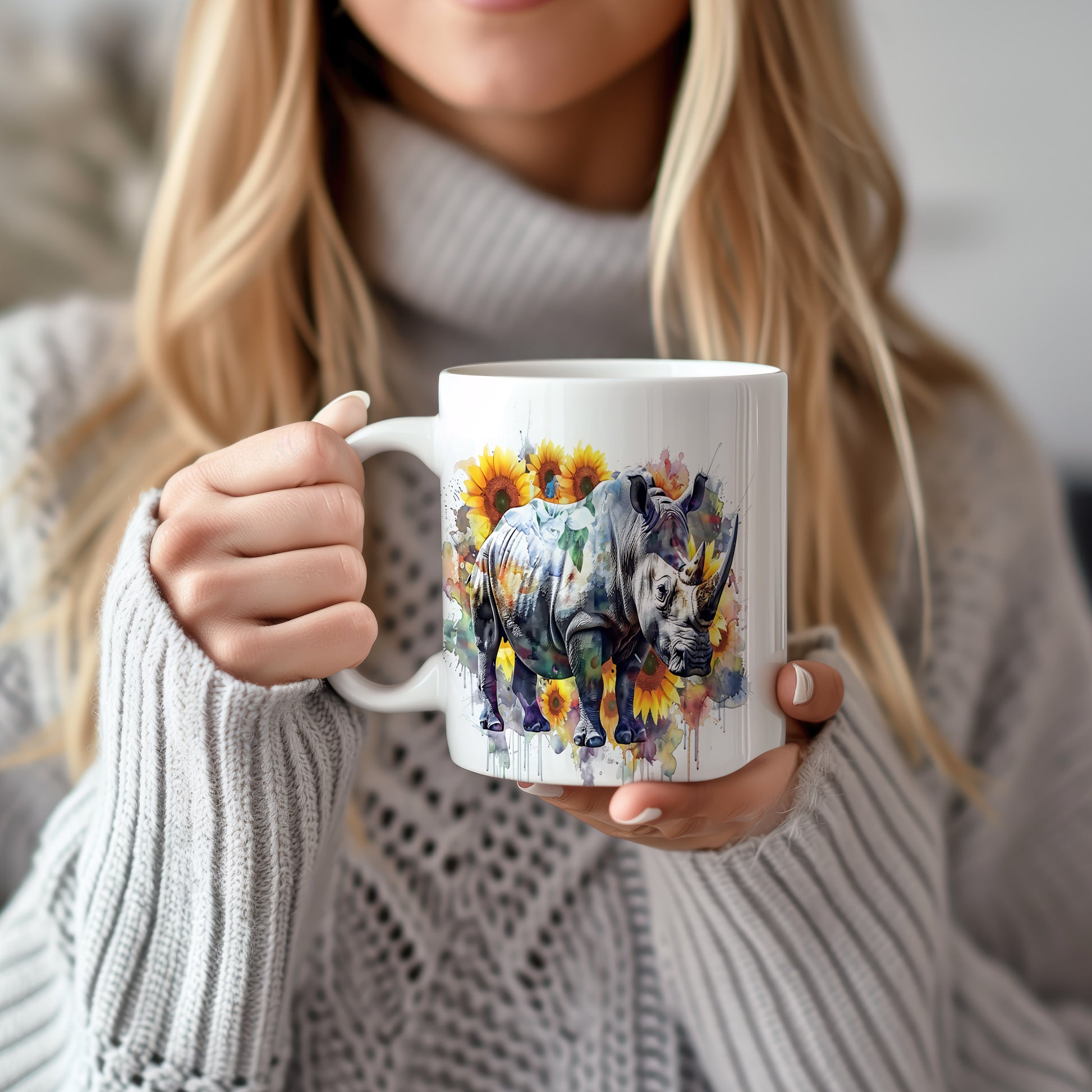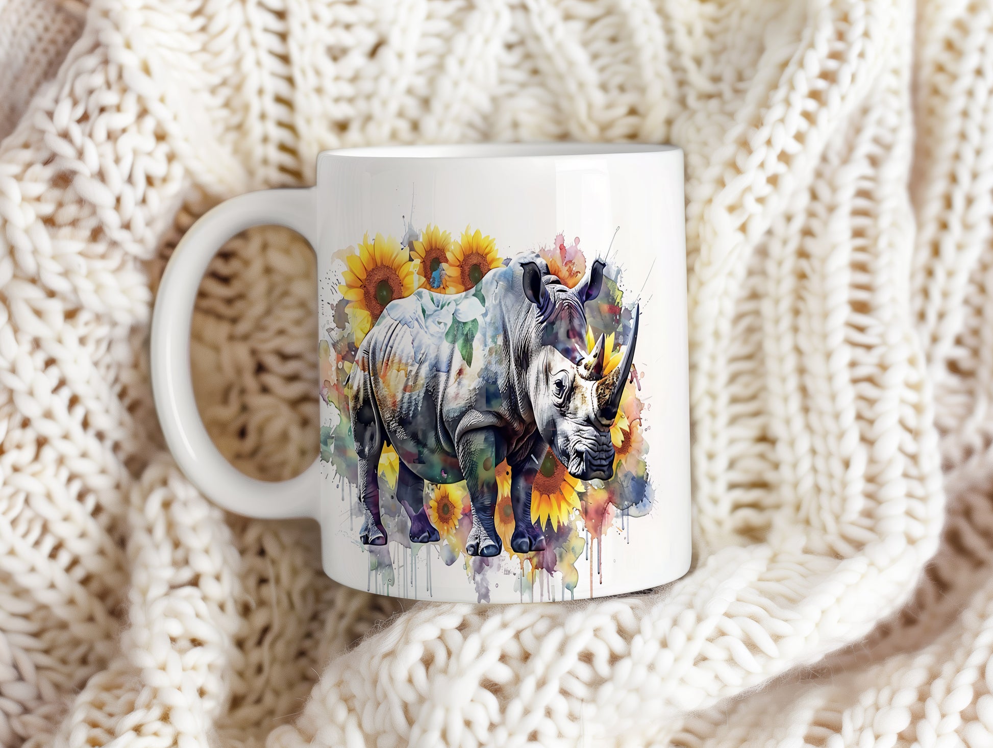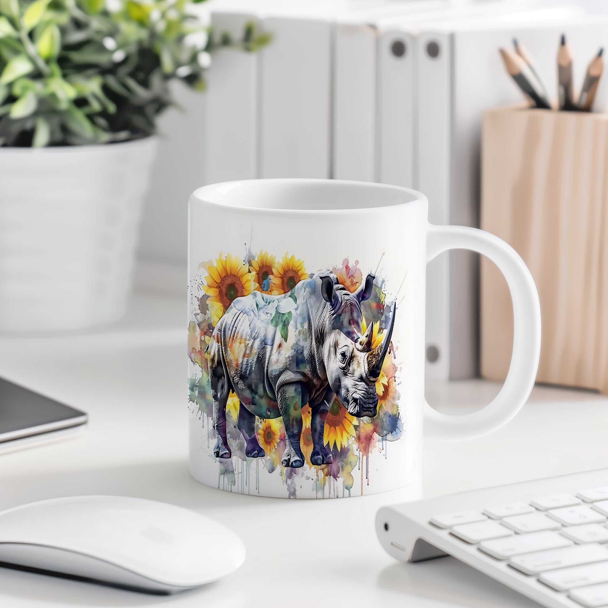 Tento hrnek s motivem nosorožce a slunečnic je skvělým kouskem pro milovníky přírody. Je ideální jako dárek pro přátele nebo rodinu, kteří ocení originální design. Materiál: keramika. Objem: 330 ml. Vhodné do myčky i mikrovlnky. Používání tohoto hrnku přináší radost a oživí každé pití.