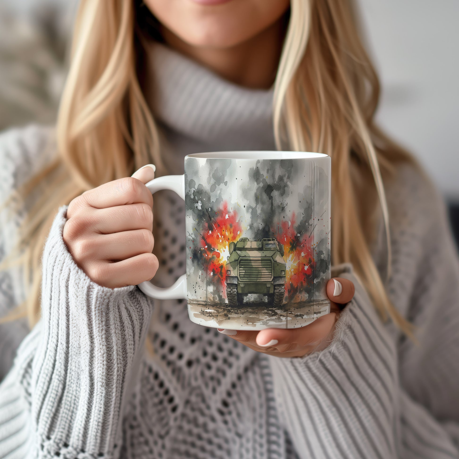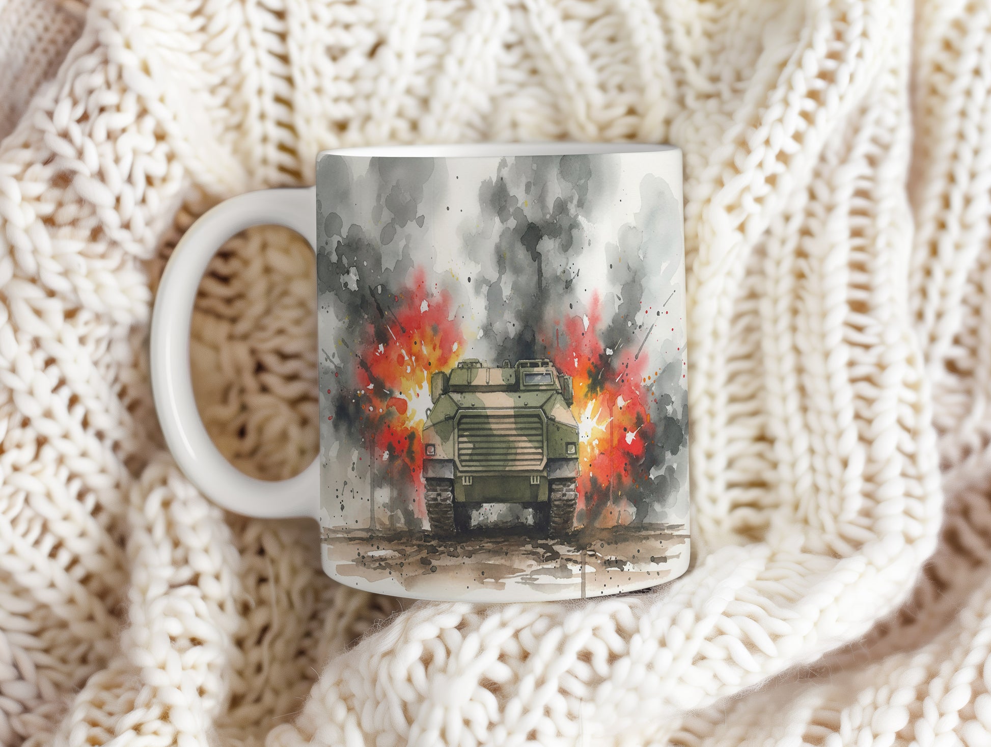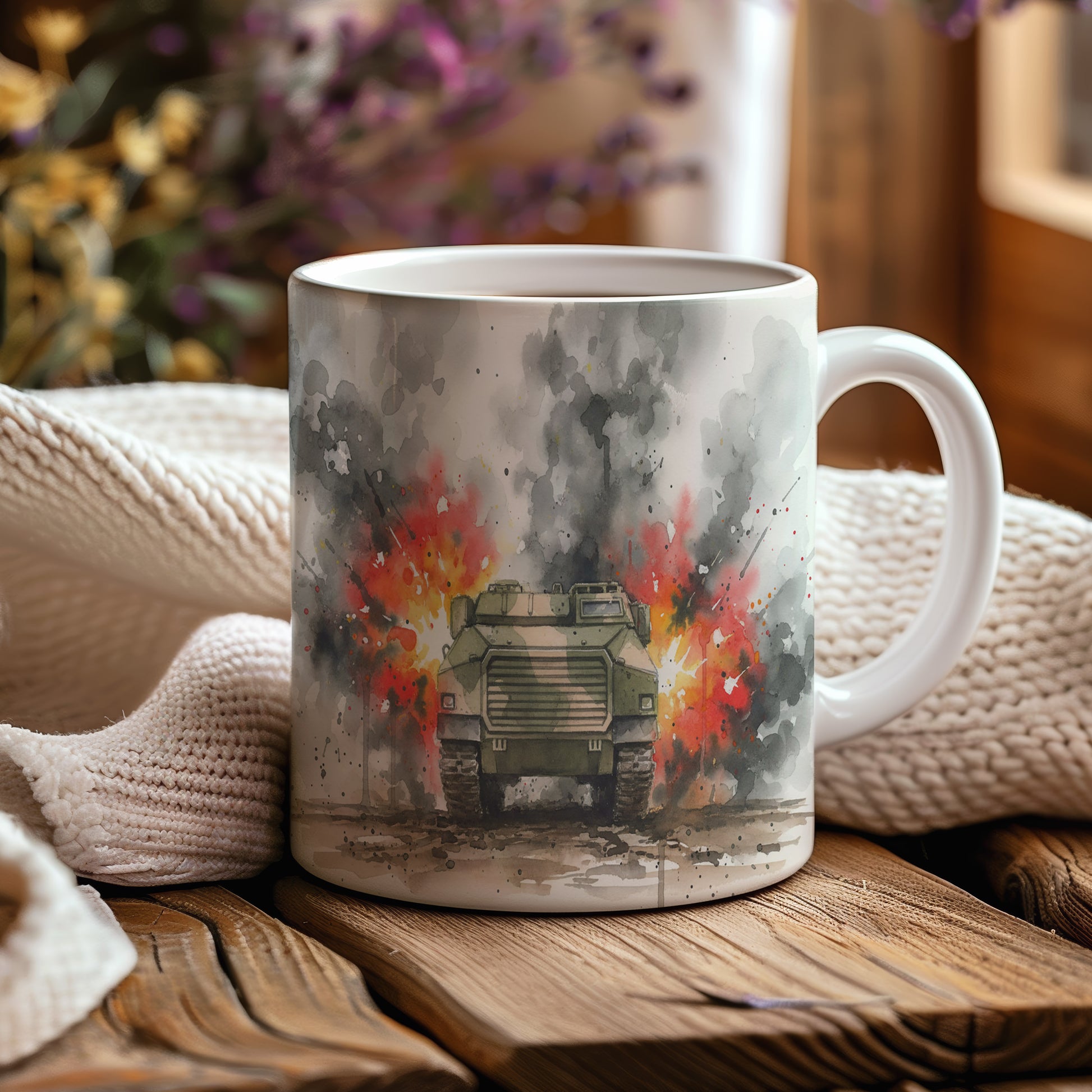 Unikátní hrnek s akvarelovým motivem obrněného vozu obklopeného dramatickými plameny. Skvělý doplněk pro milovníky vojenské techniky. Hrnek 330 ml – vhodný do myčky i mikrovlnky.