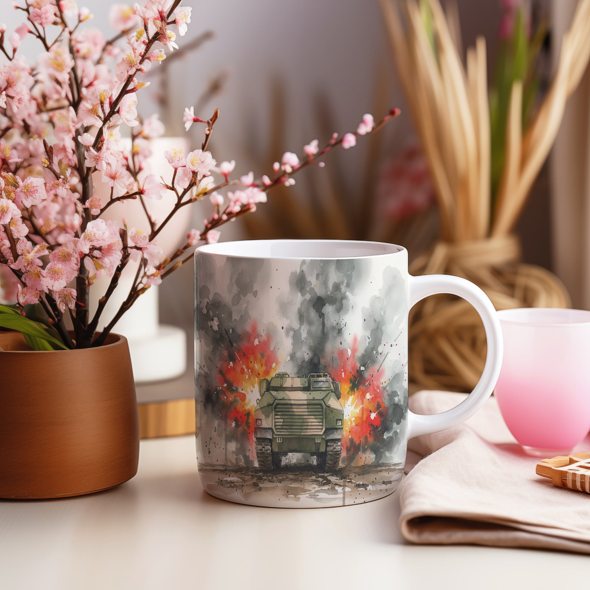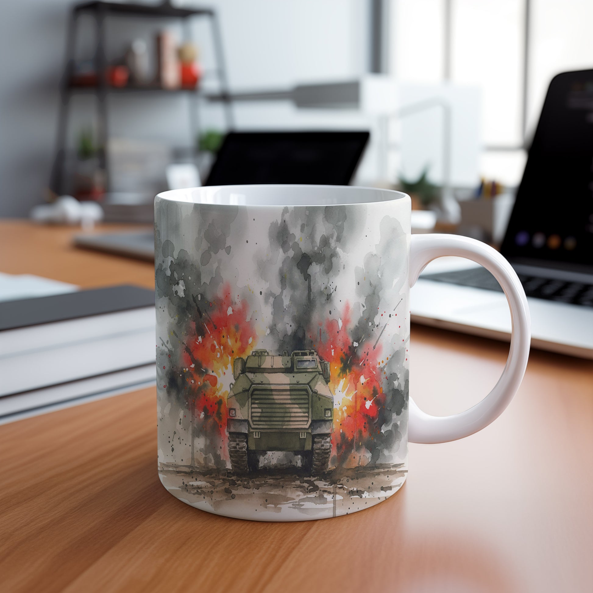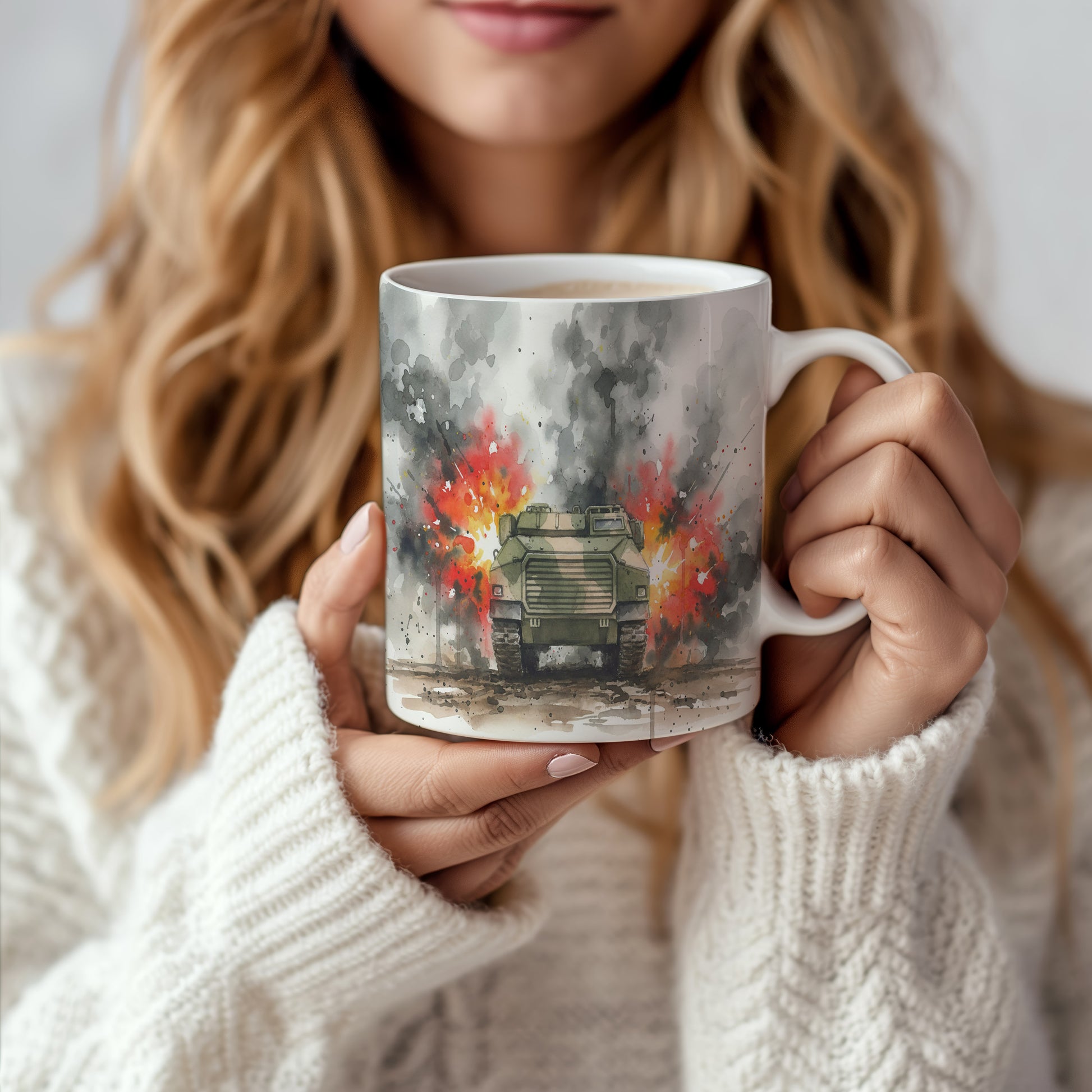 Unikátní hrnek s akvarelovým motivem obrněného vozu obklopeného dramatickými plameny. Skvělý doplněk pro milovníky vojenské techniky. Hrnek 330 ml – vhodný do myčky i mikrovlnky.