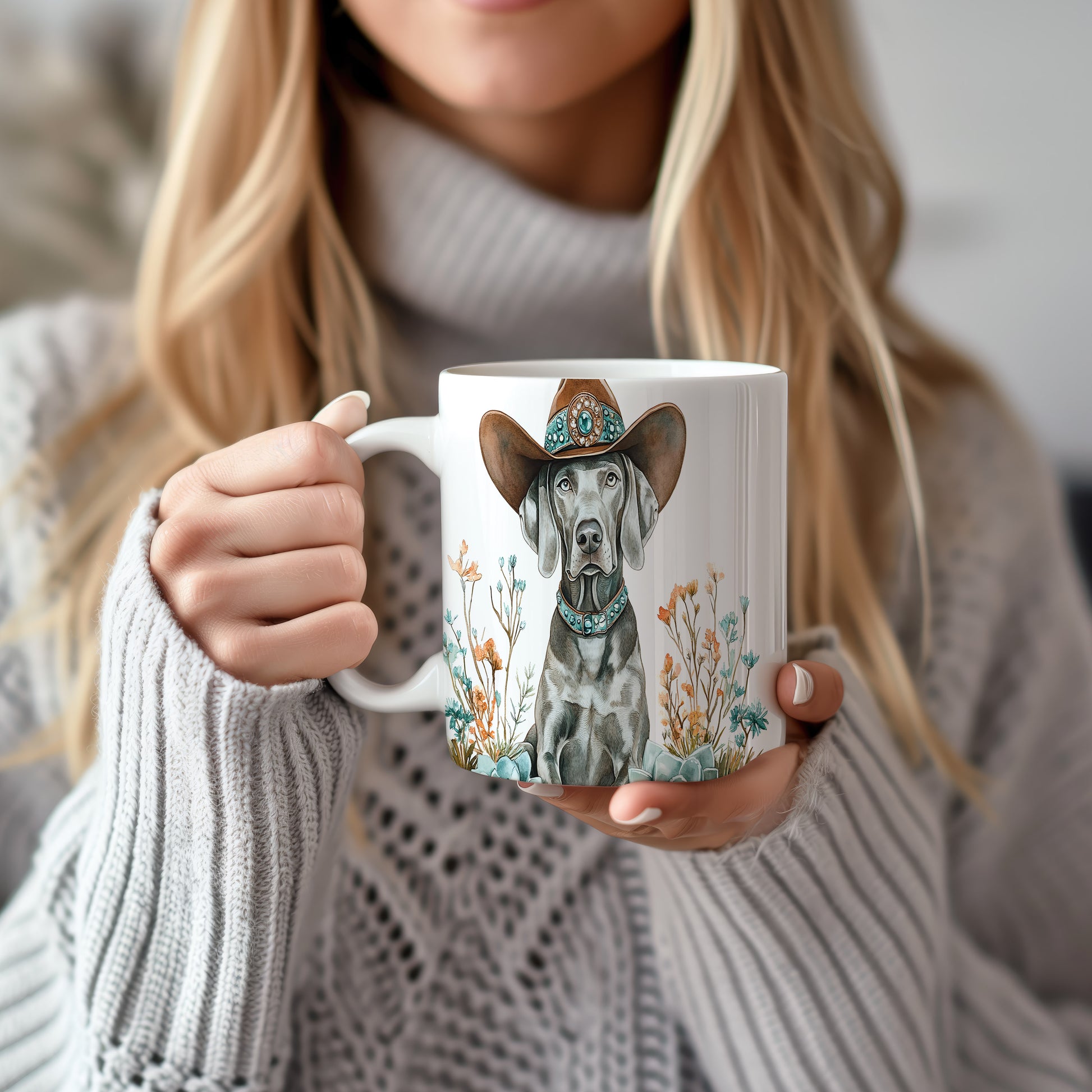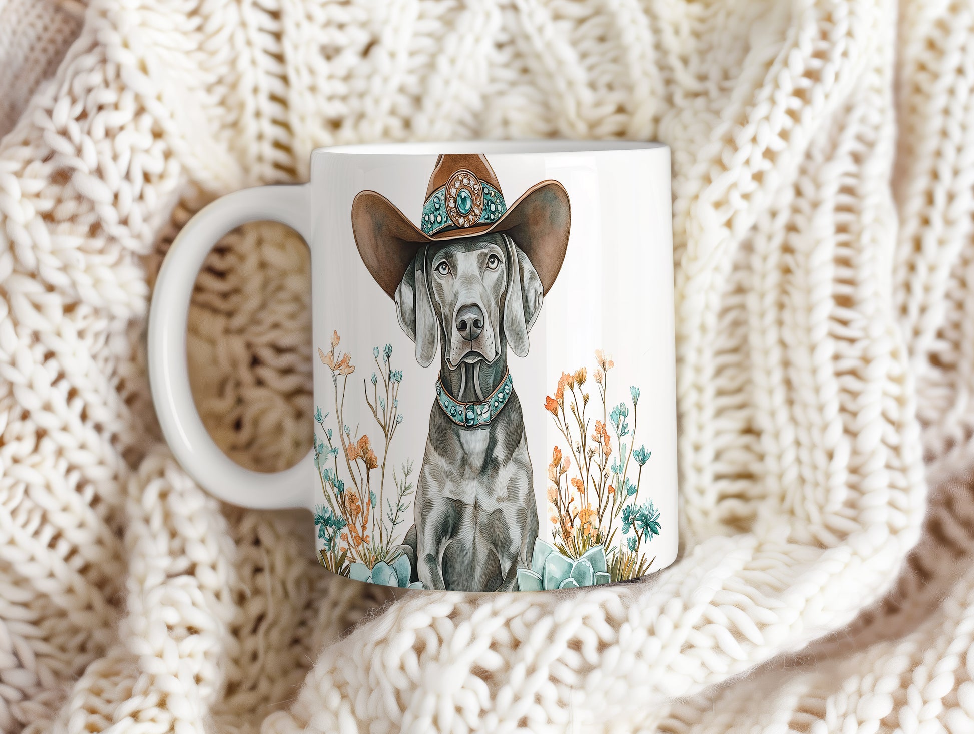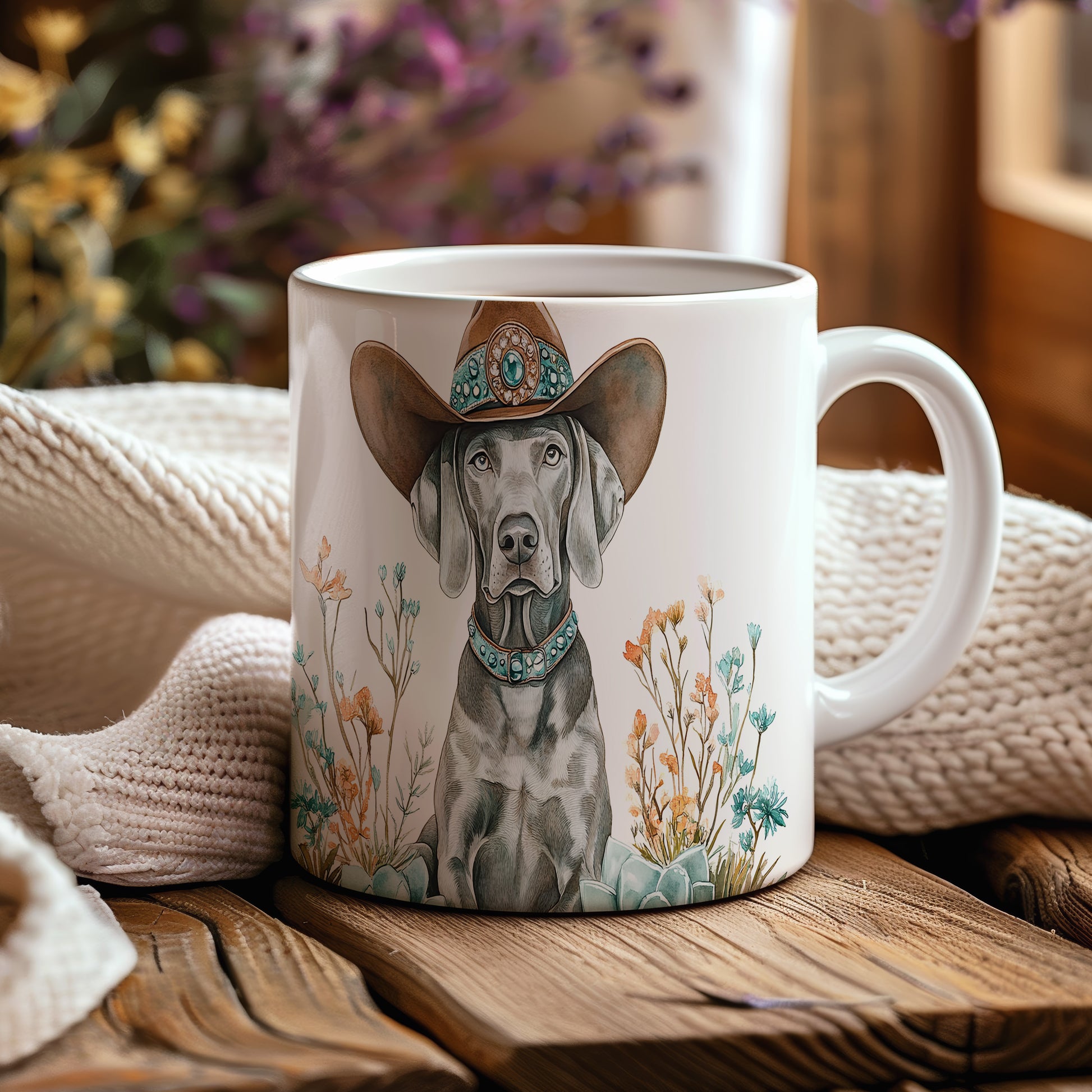 Hrnek s Vymarským ohařem a kovbojským kloboukem