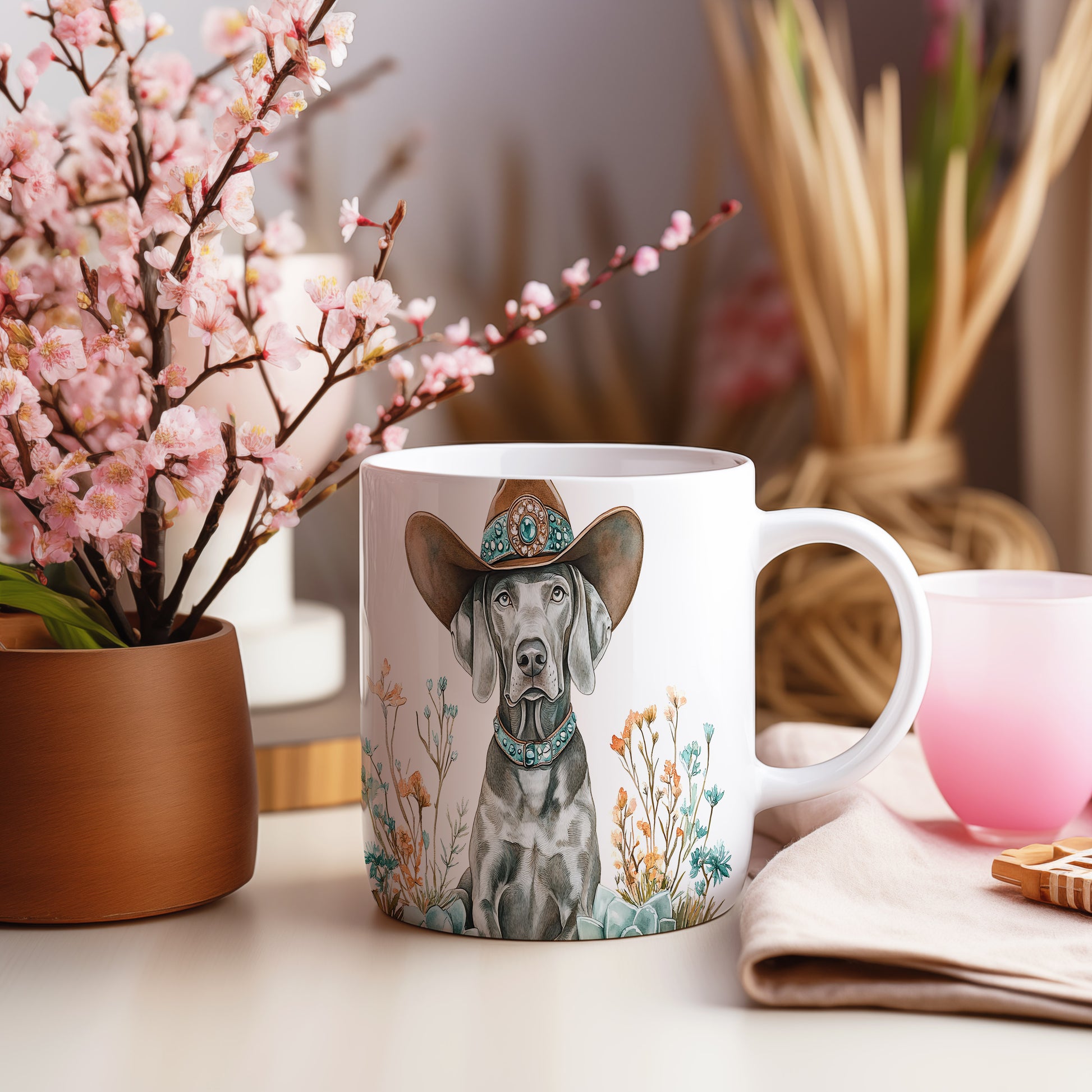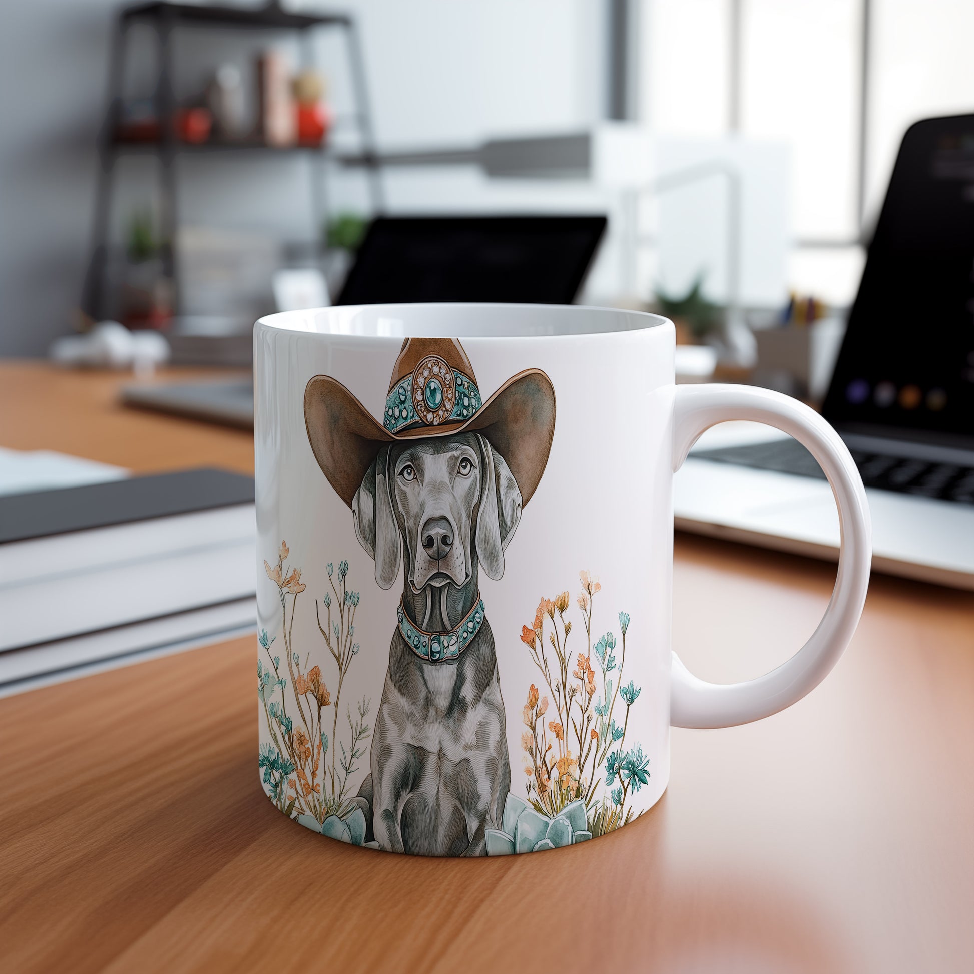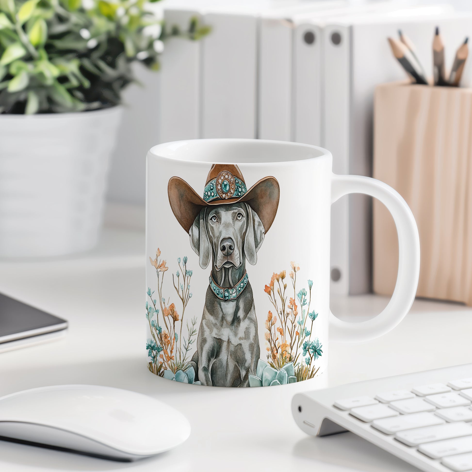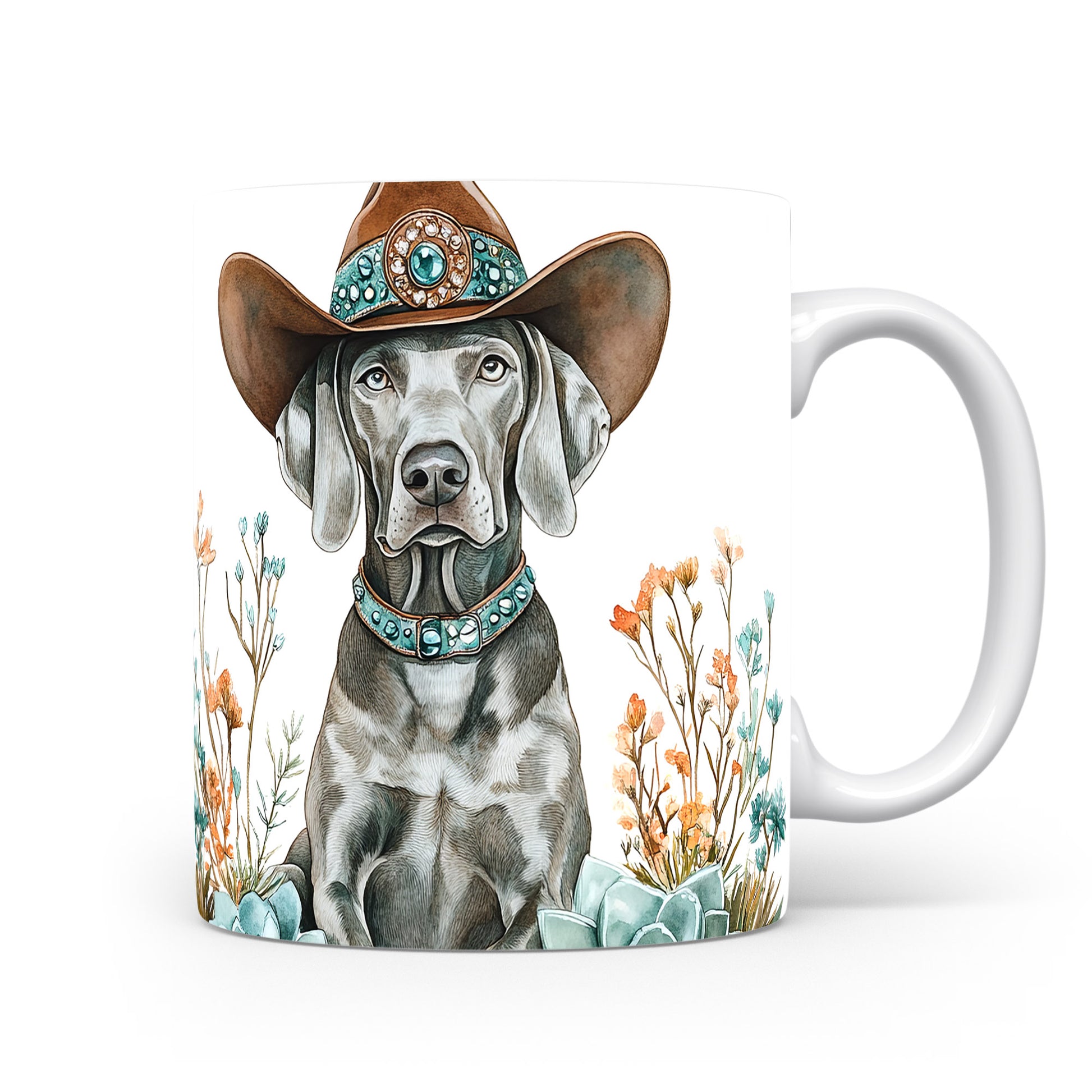 Hrnek s Vymarským ohařem a kovbojským kloboukem