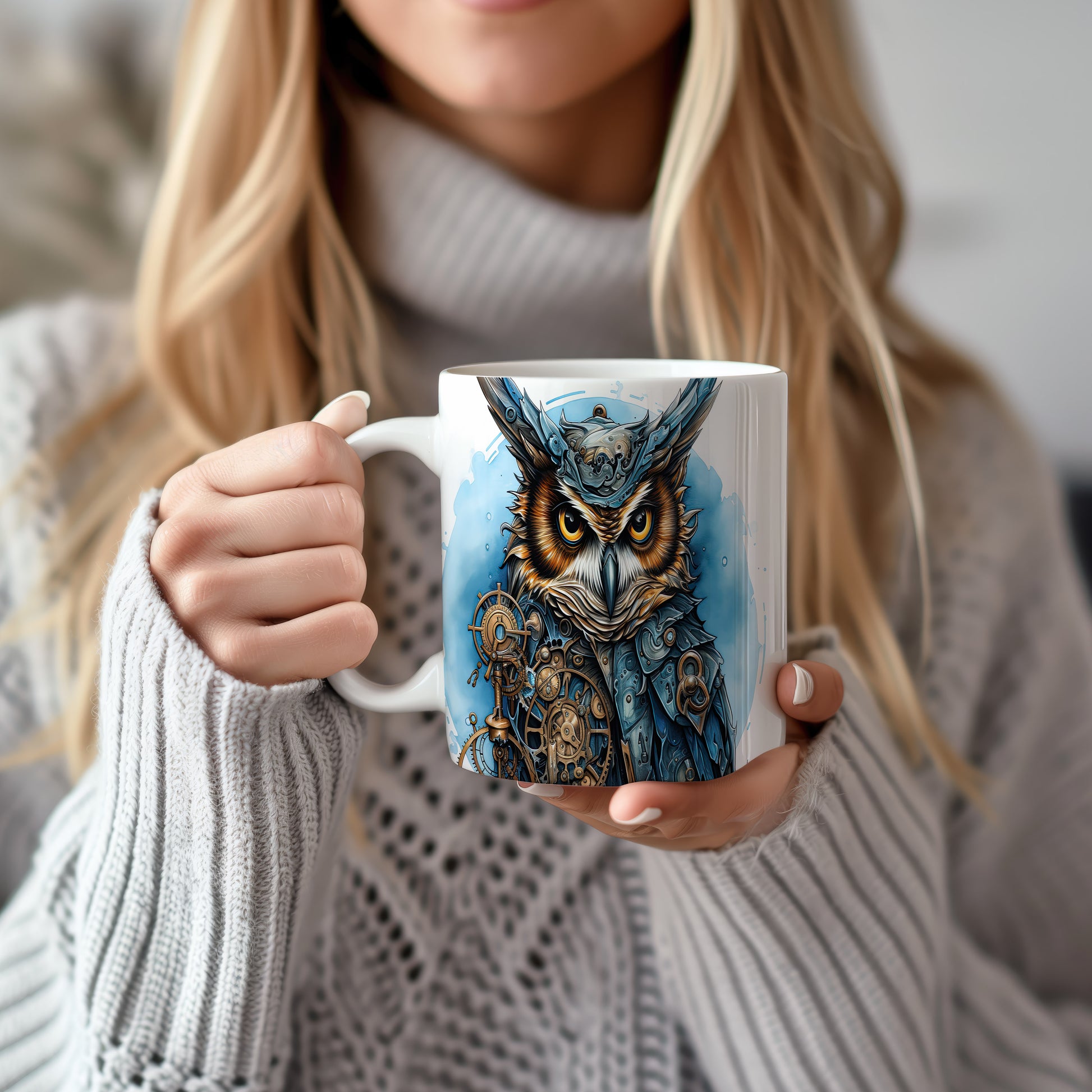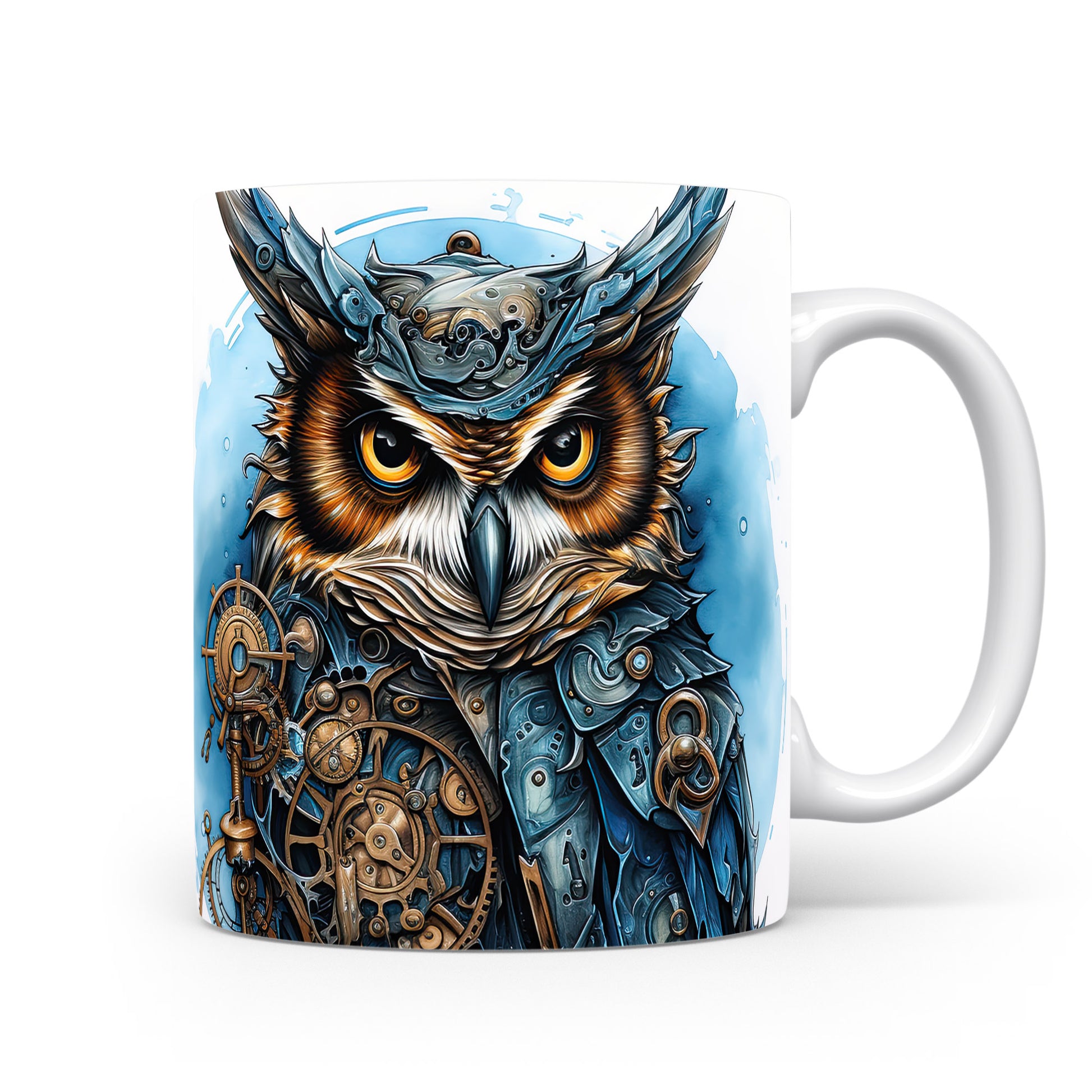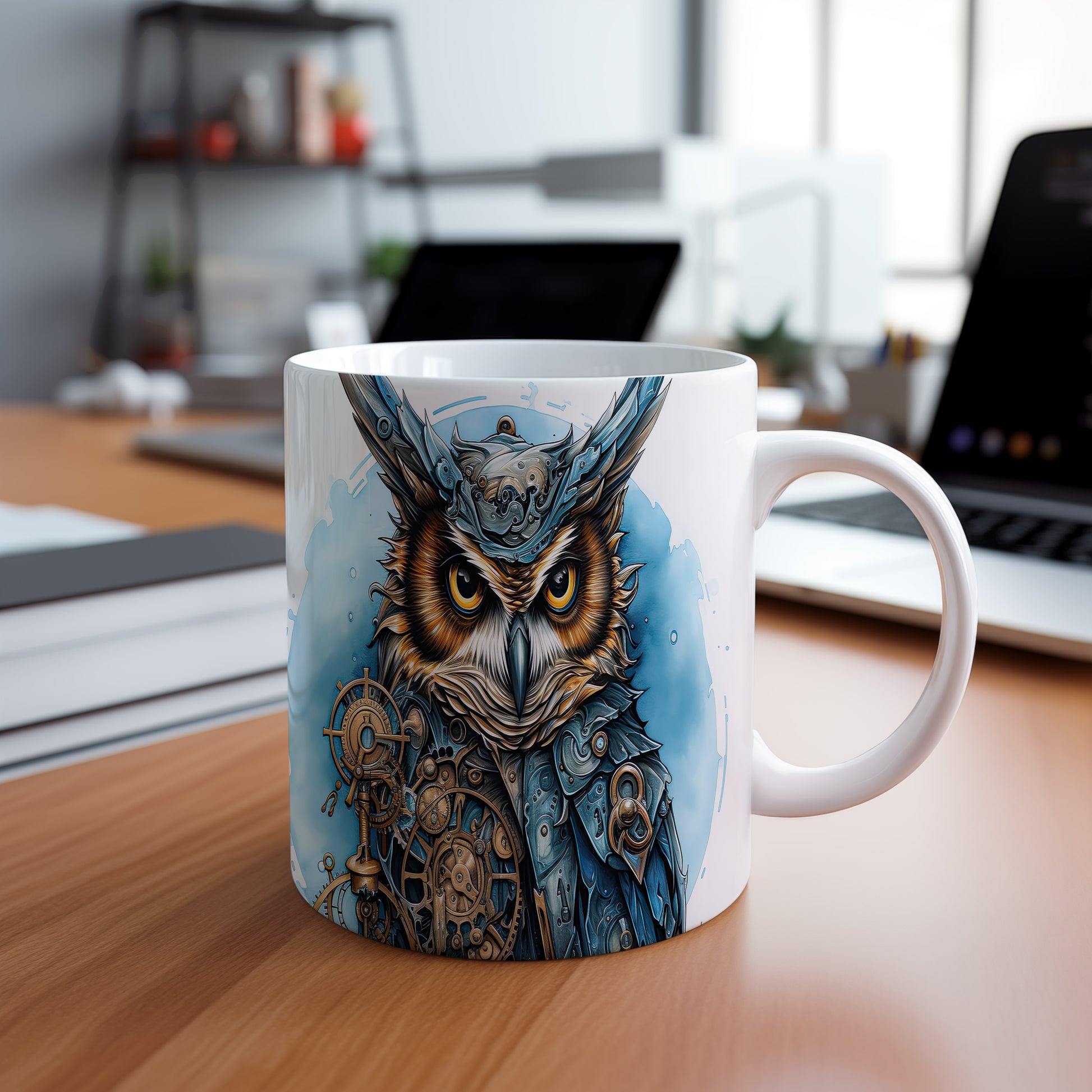 Hrnek s okřídlenou sovou v mechanickém stylu