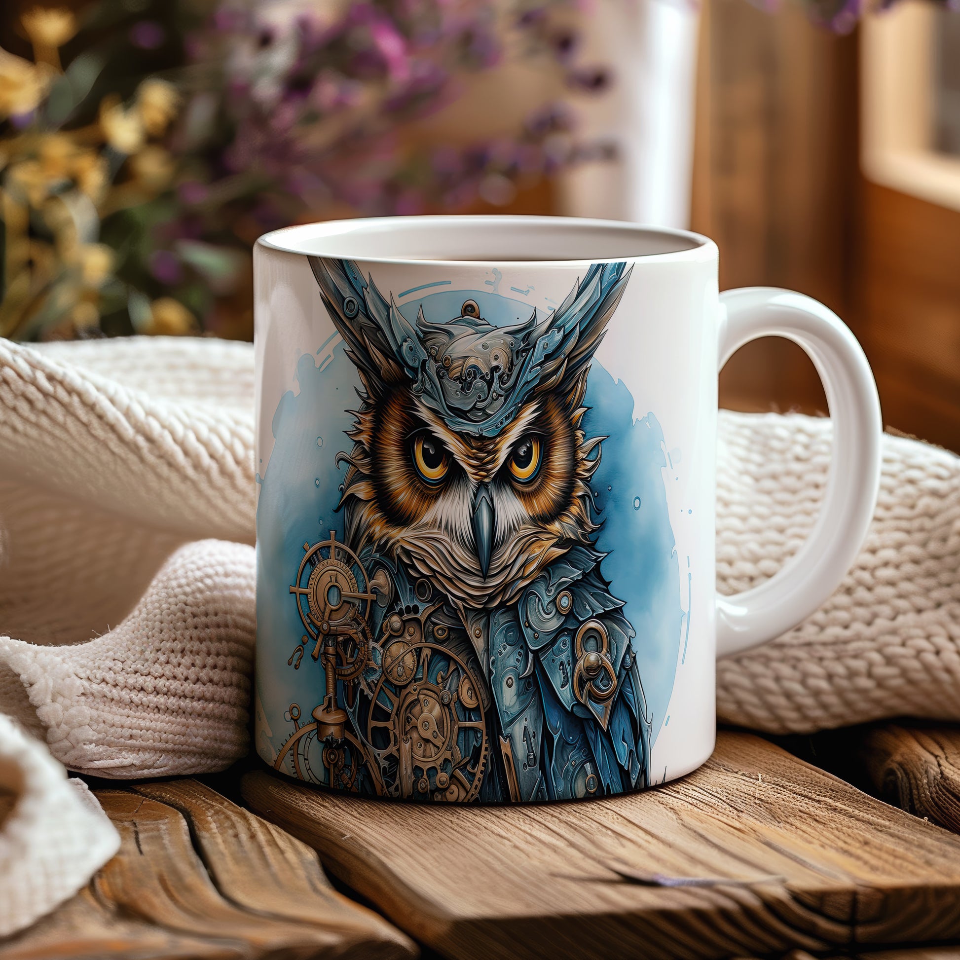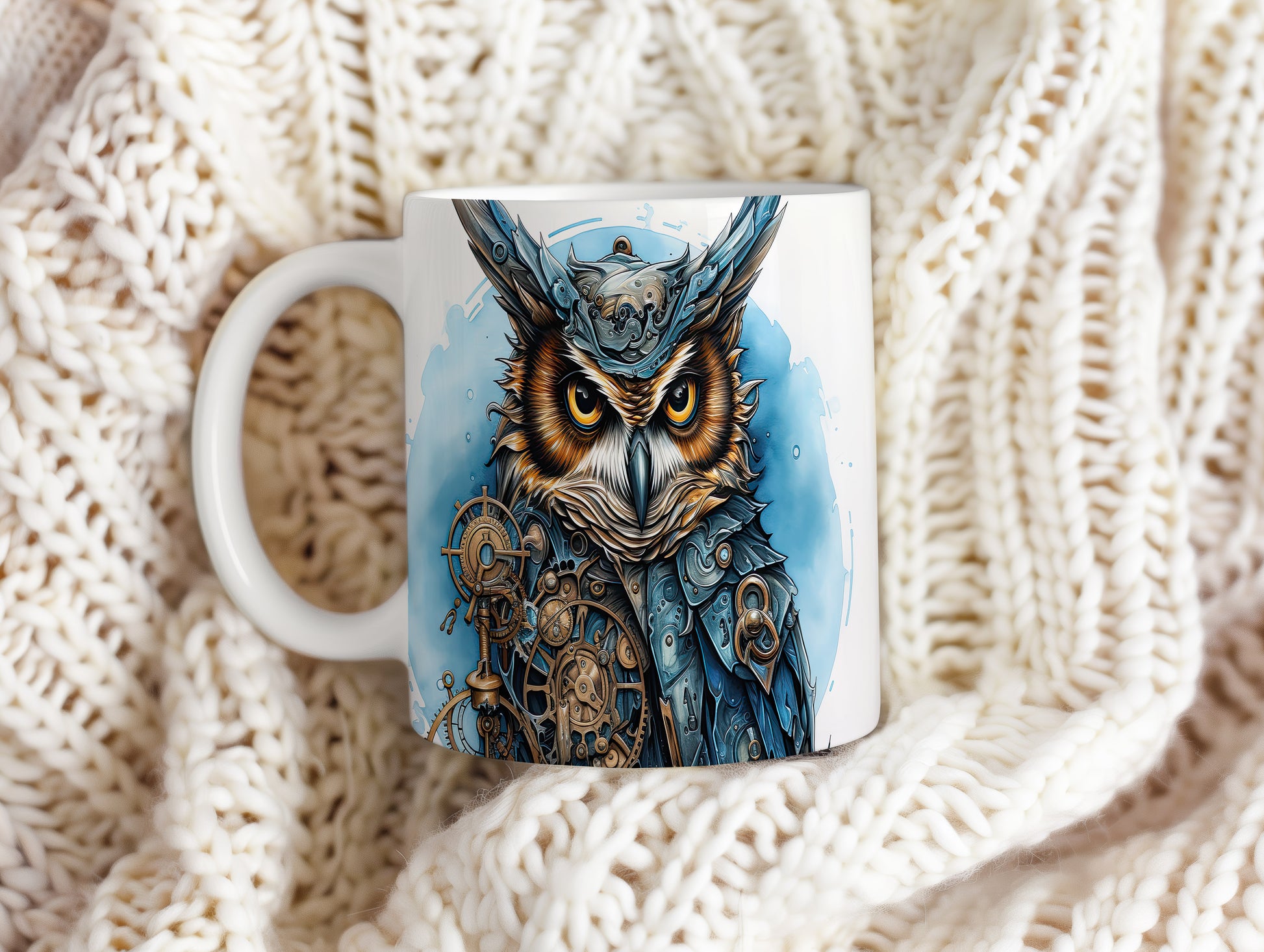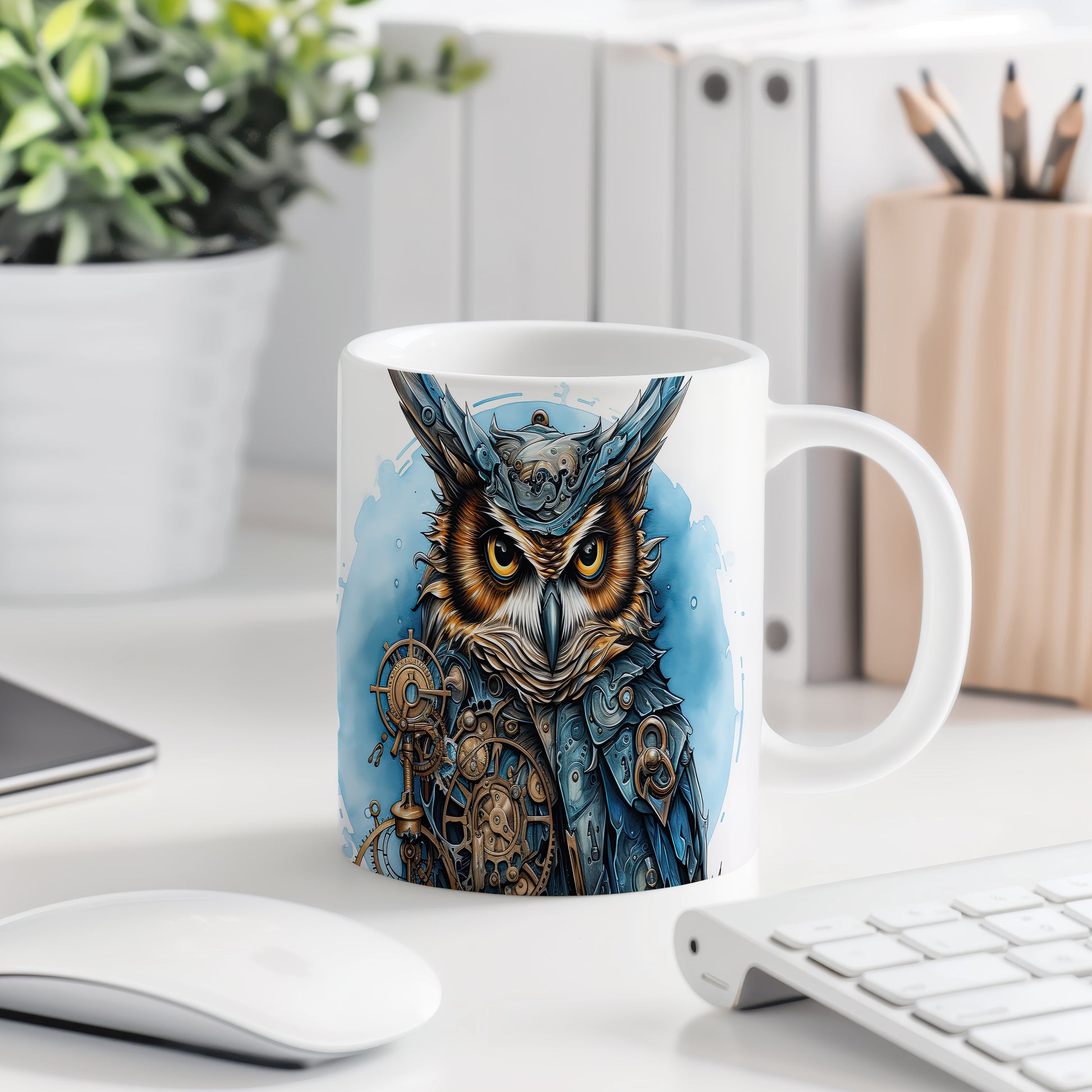 Hrnek s okřídlenou sovou v mechanickém stylu