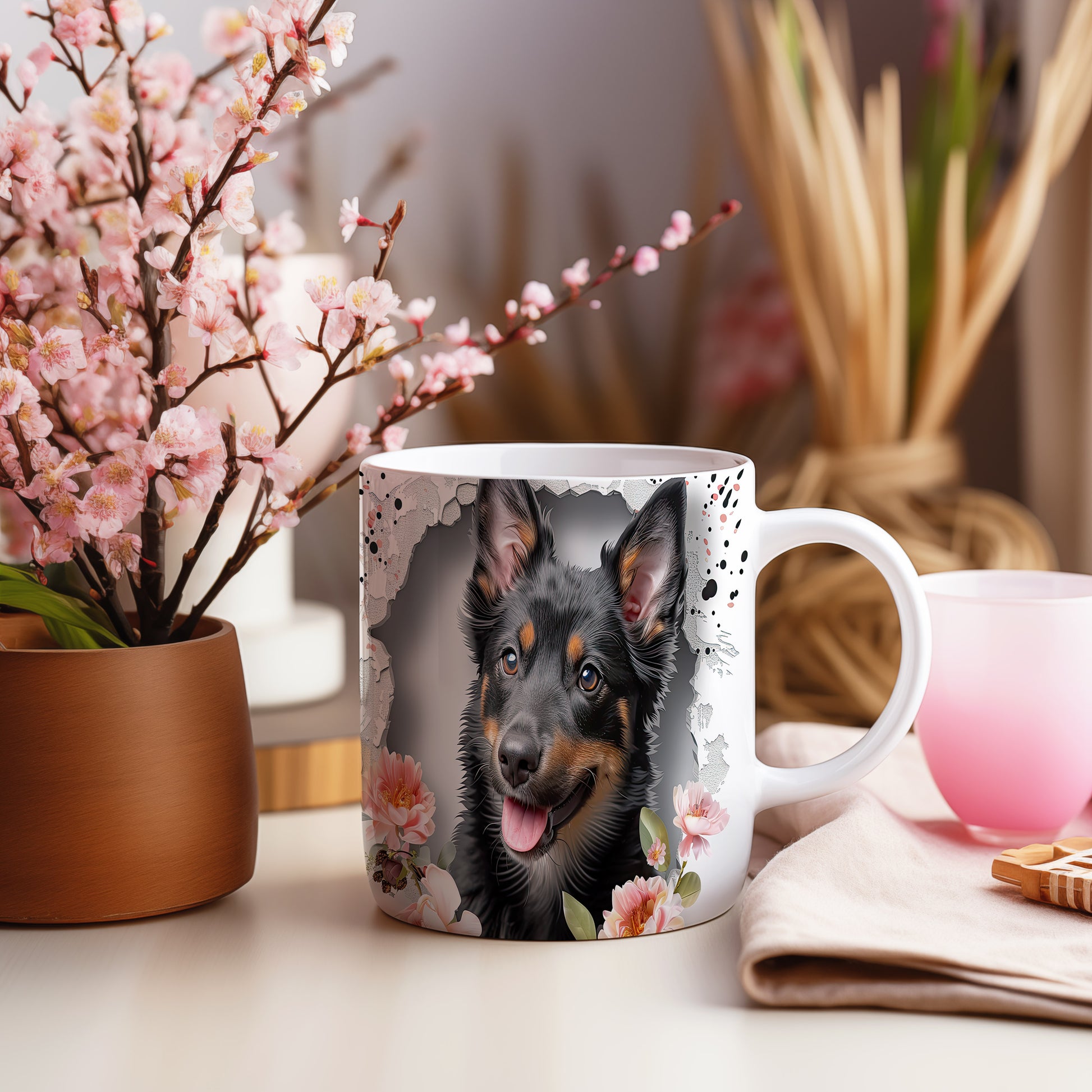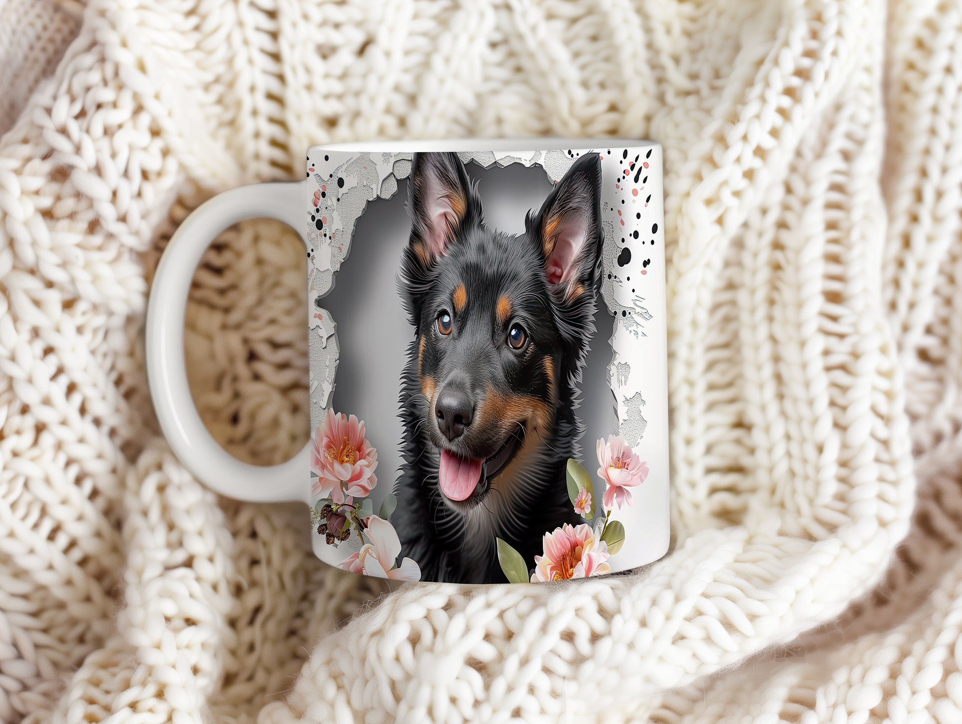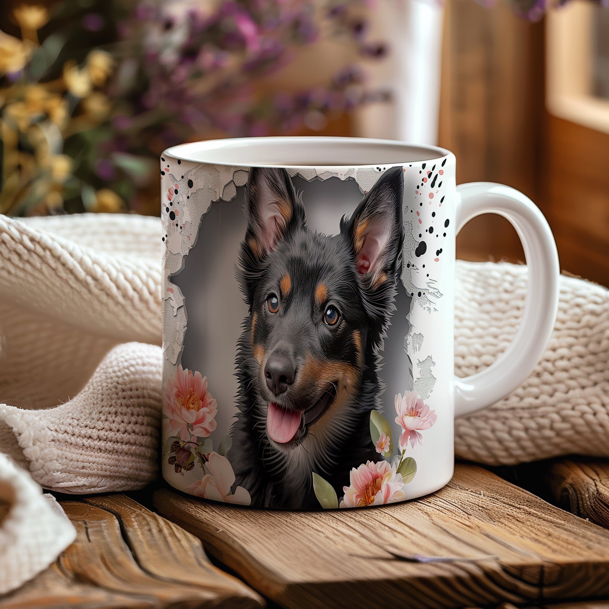 Hrnek s ovčákem a květinovým motivem