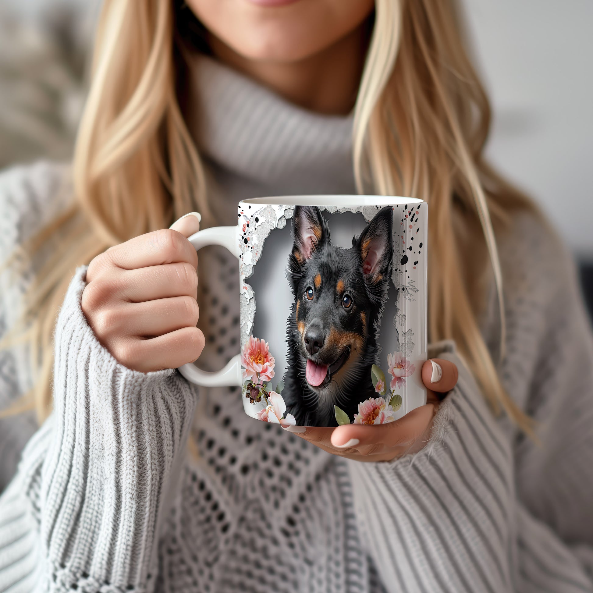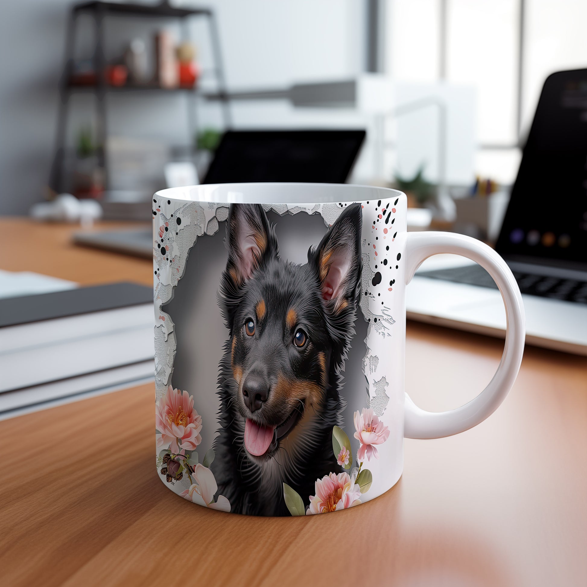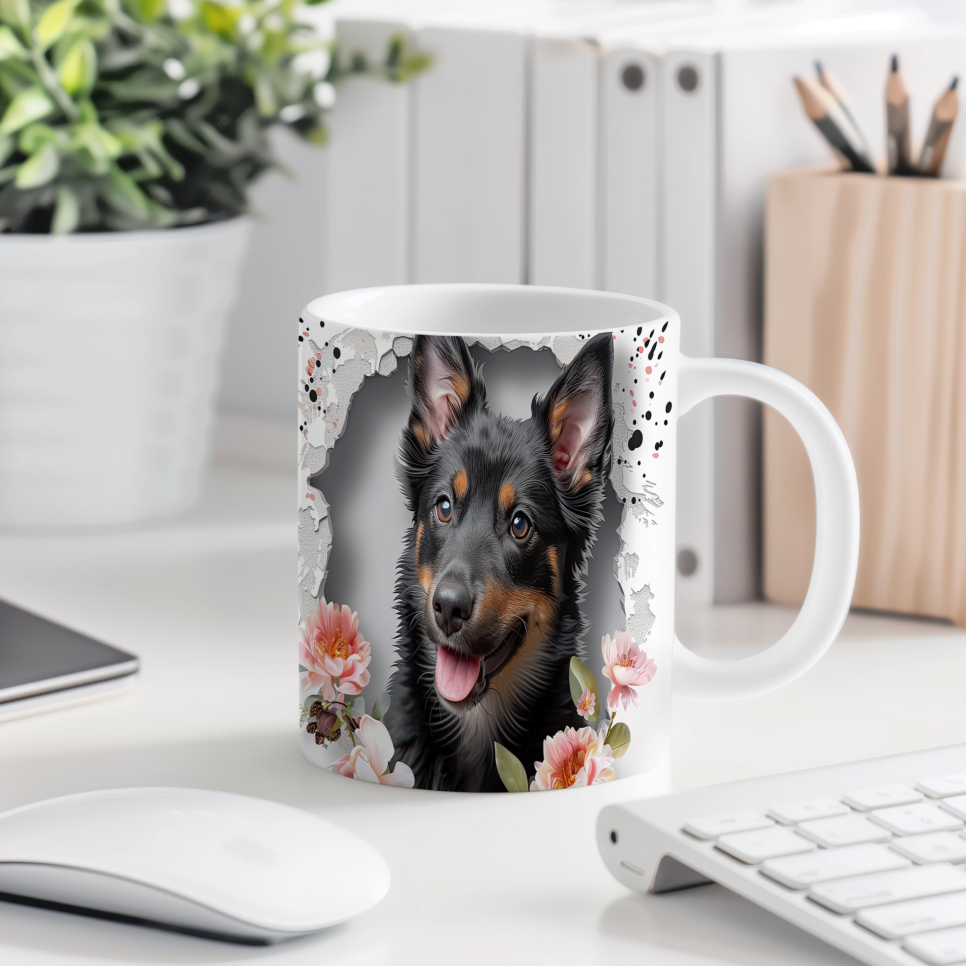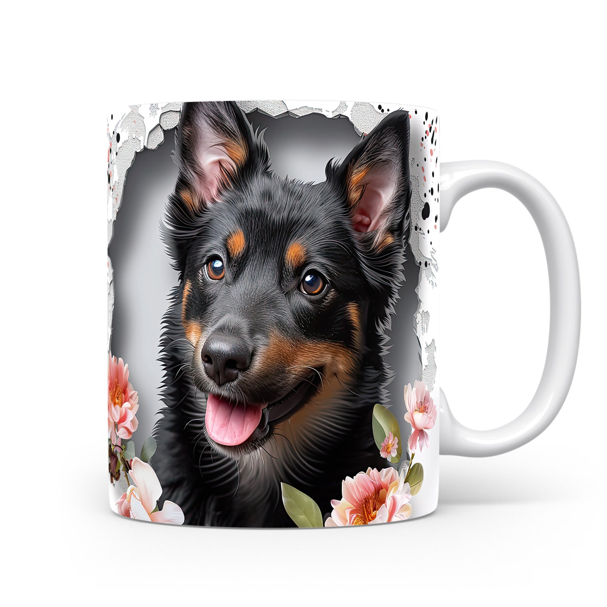 Hrnek s ovčákem a květinovým motivem