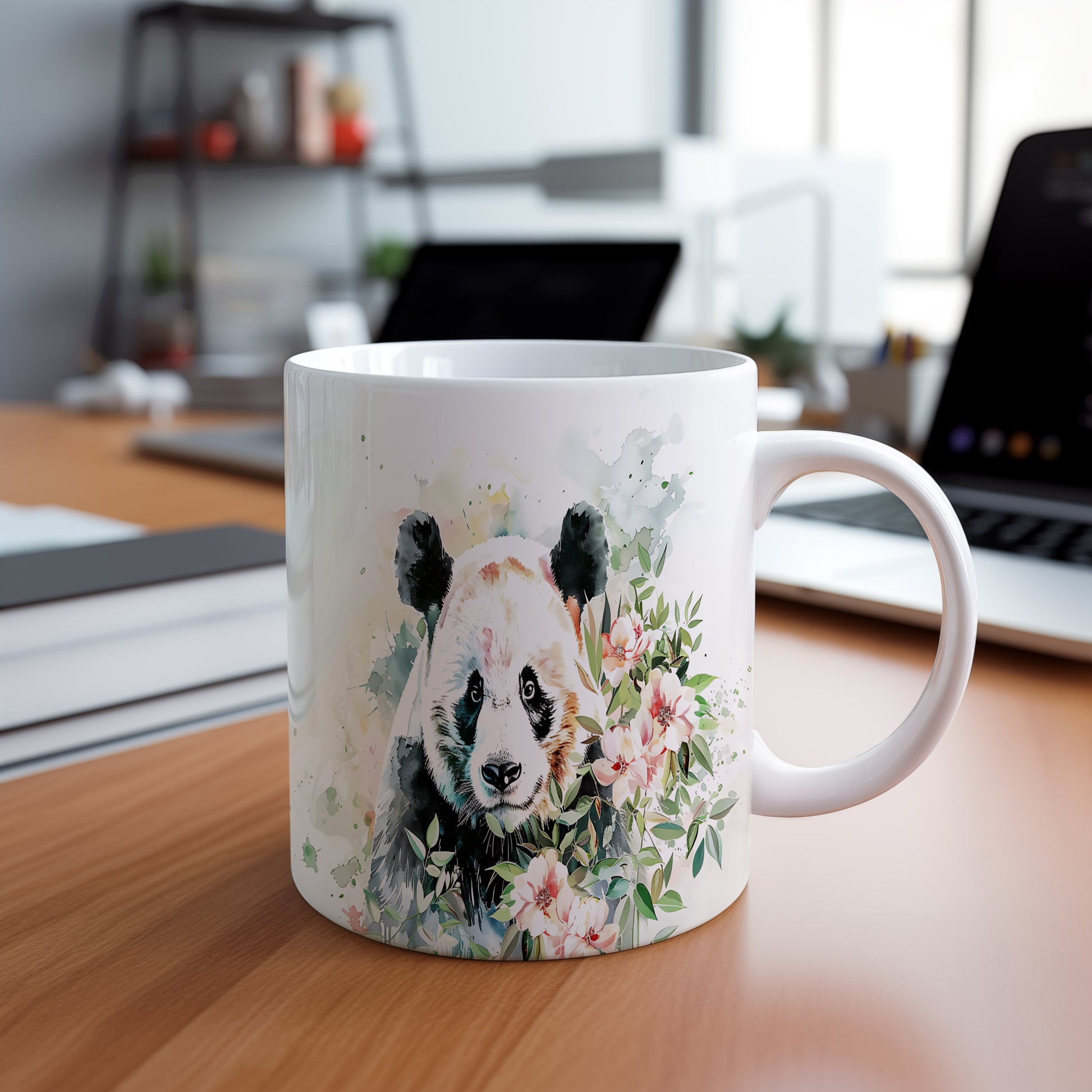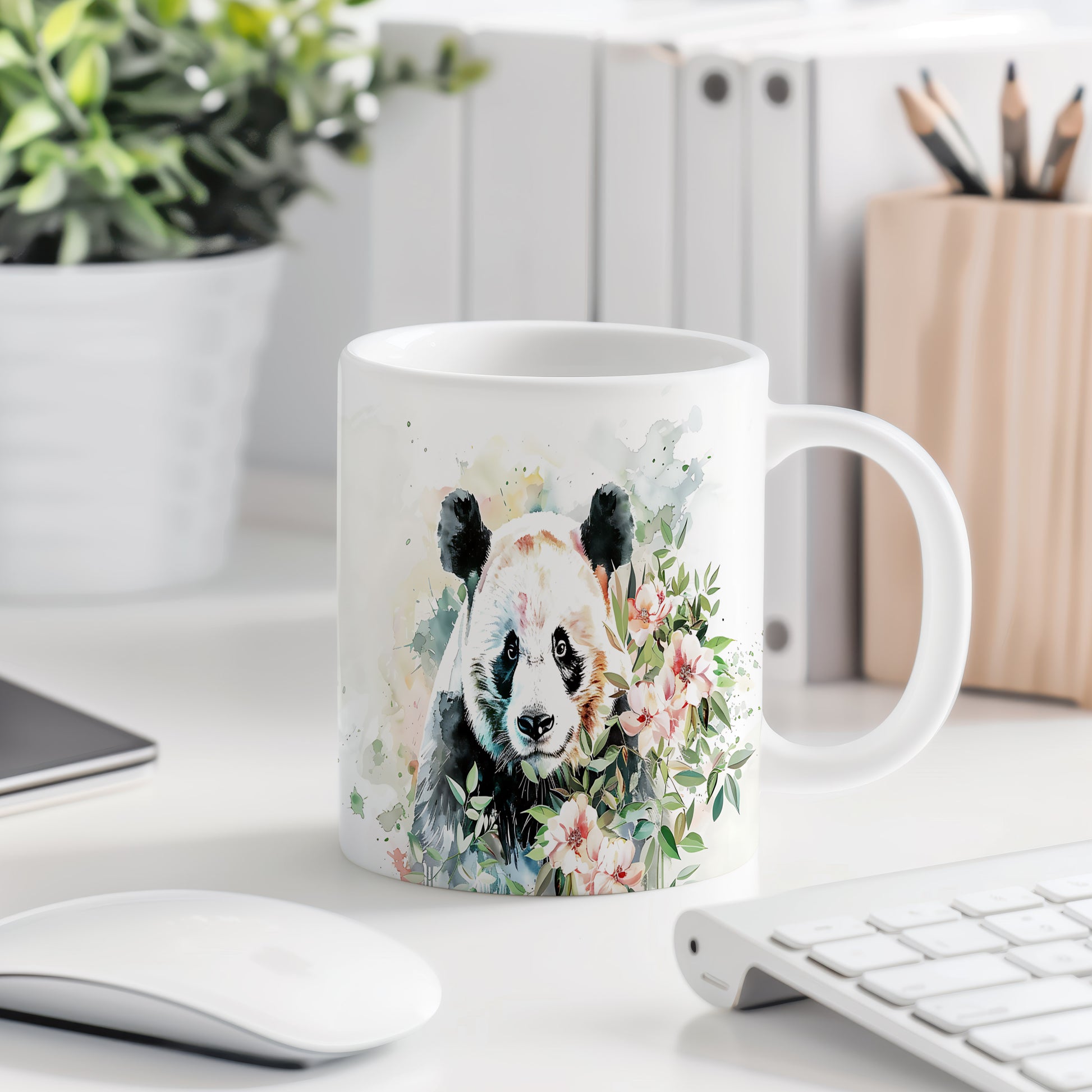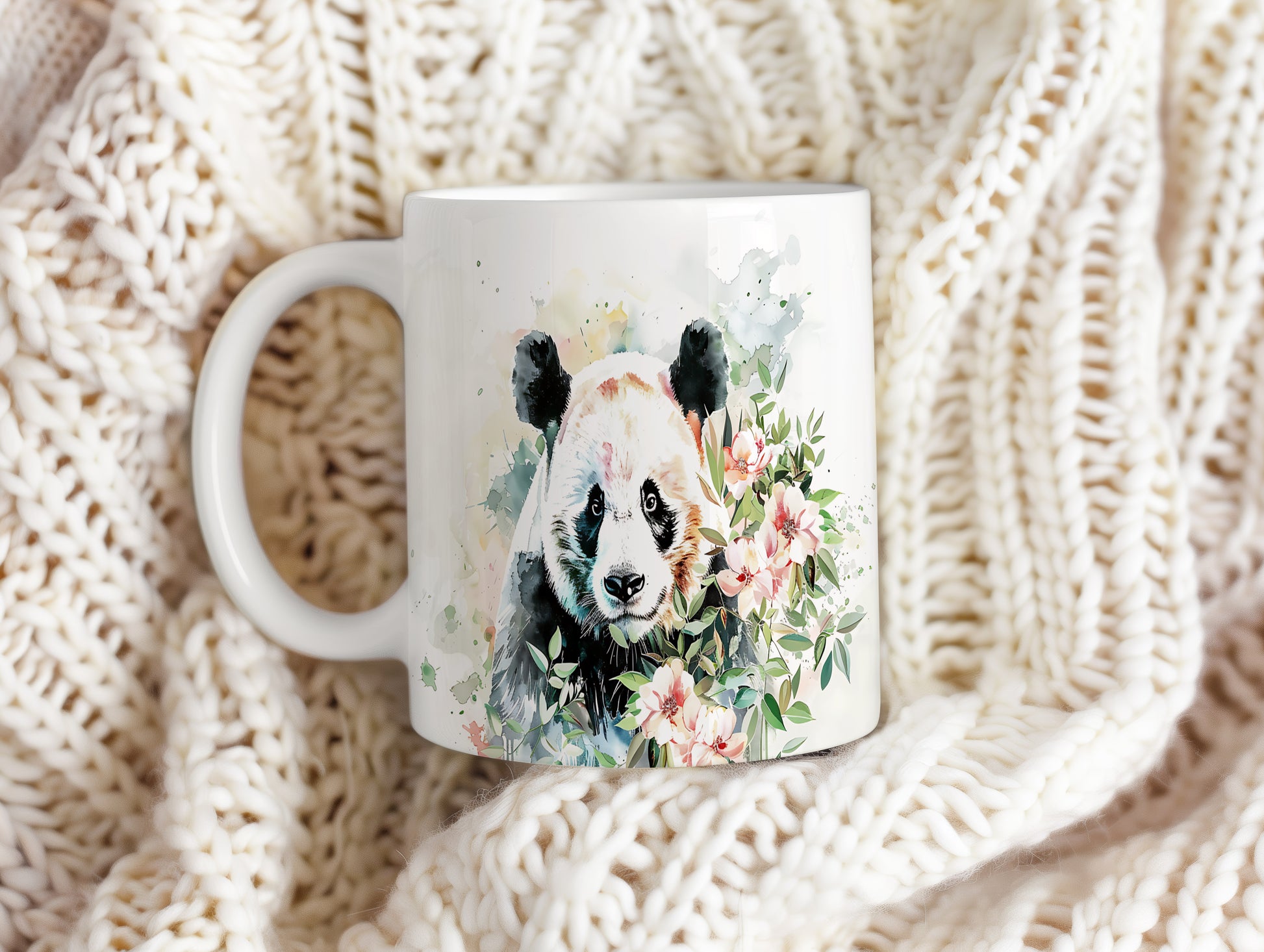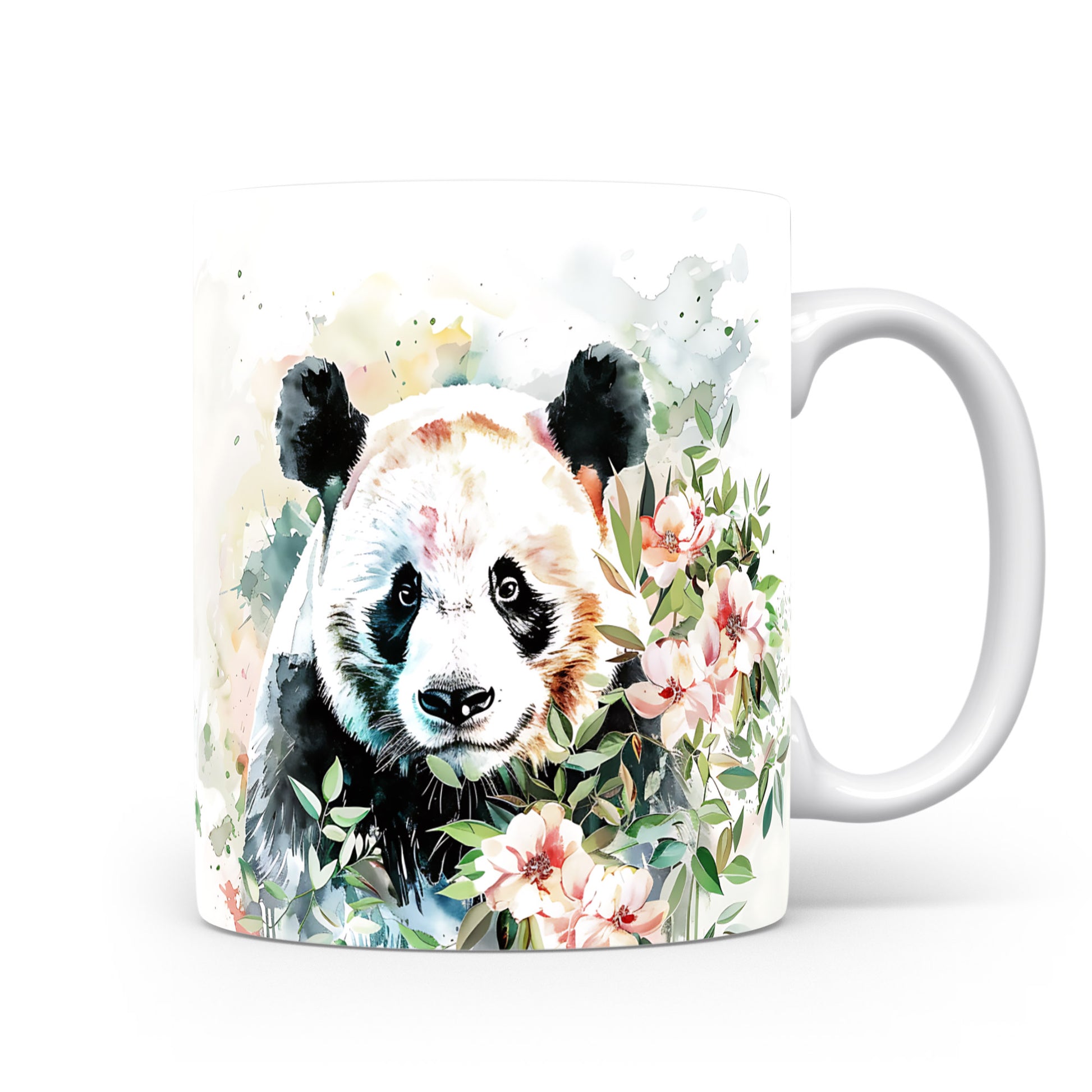 Hrnek s pandou a květinami – výrazným designem