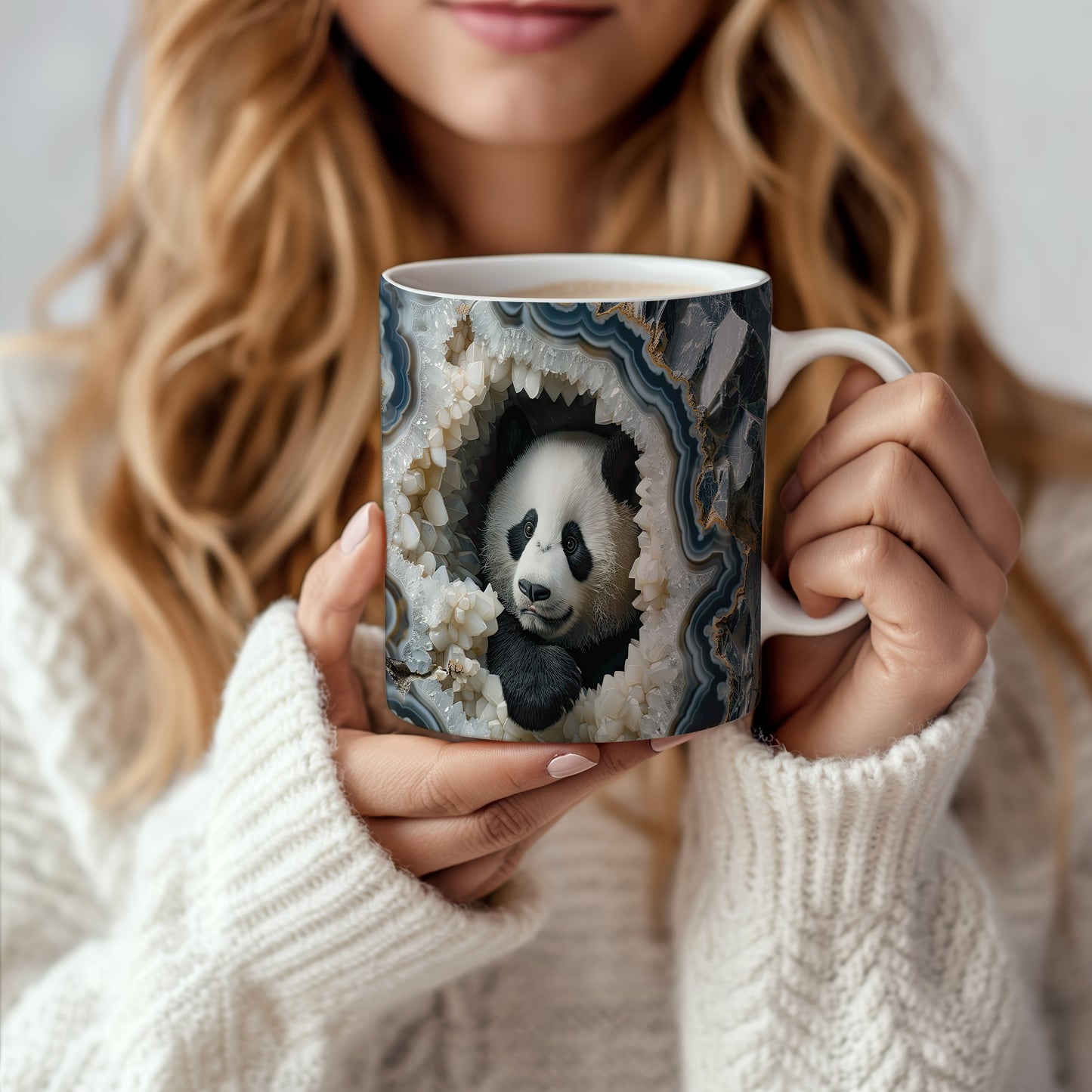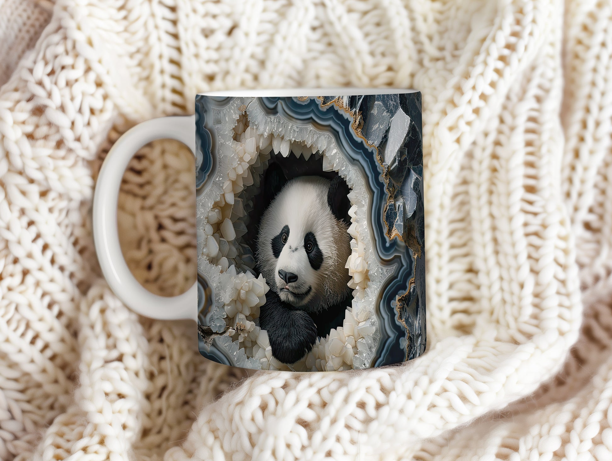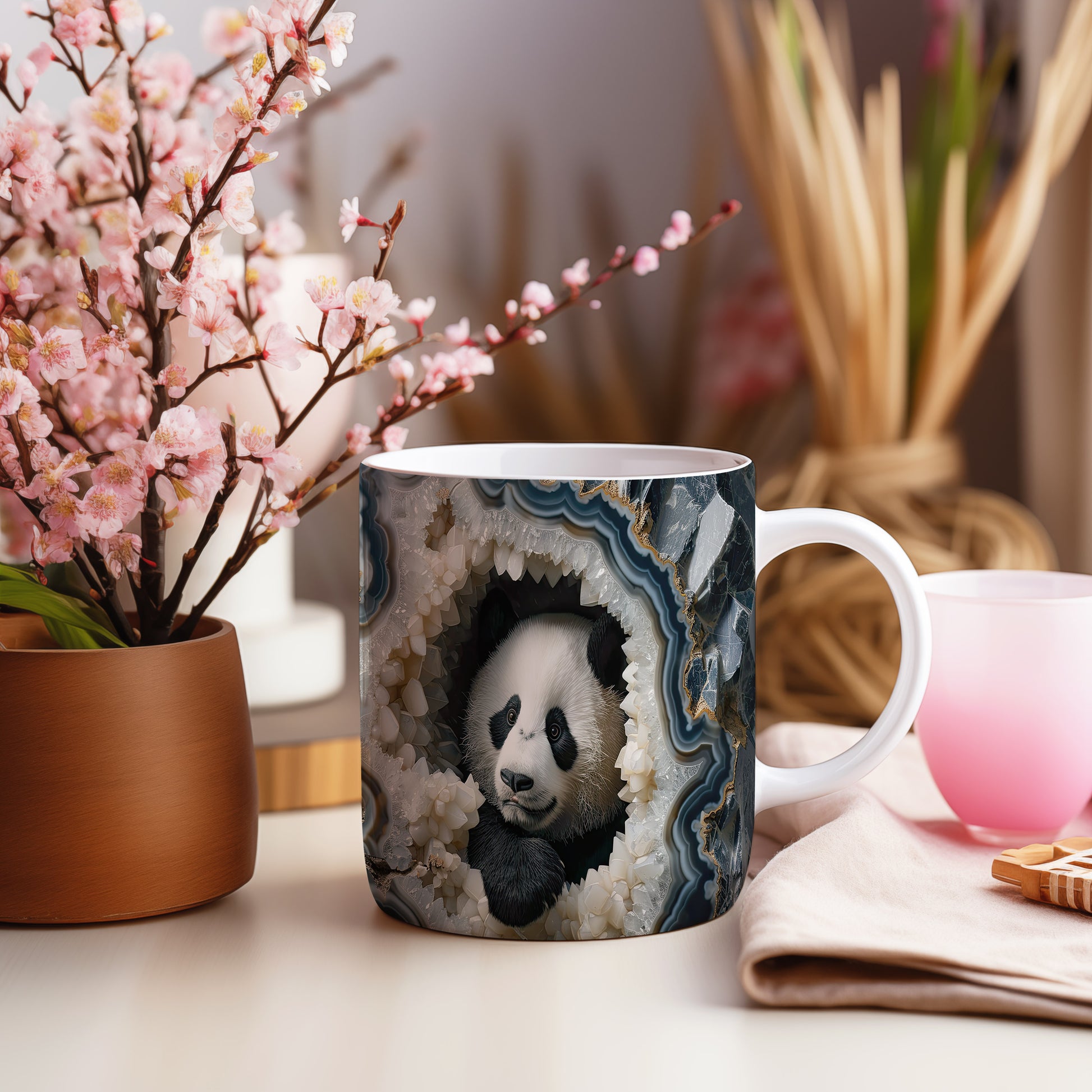 Hrnek s pandou v krystalové jeskyni – malířským vzhledem
