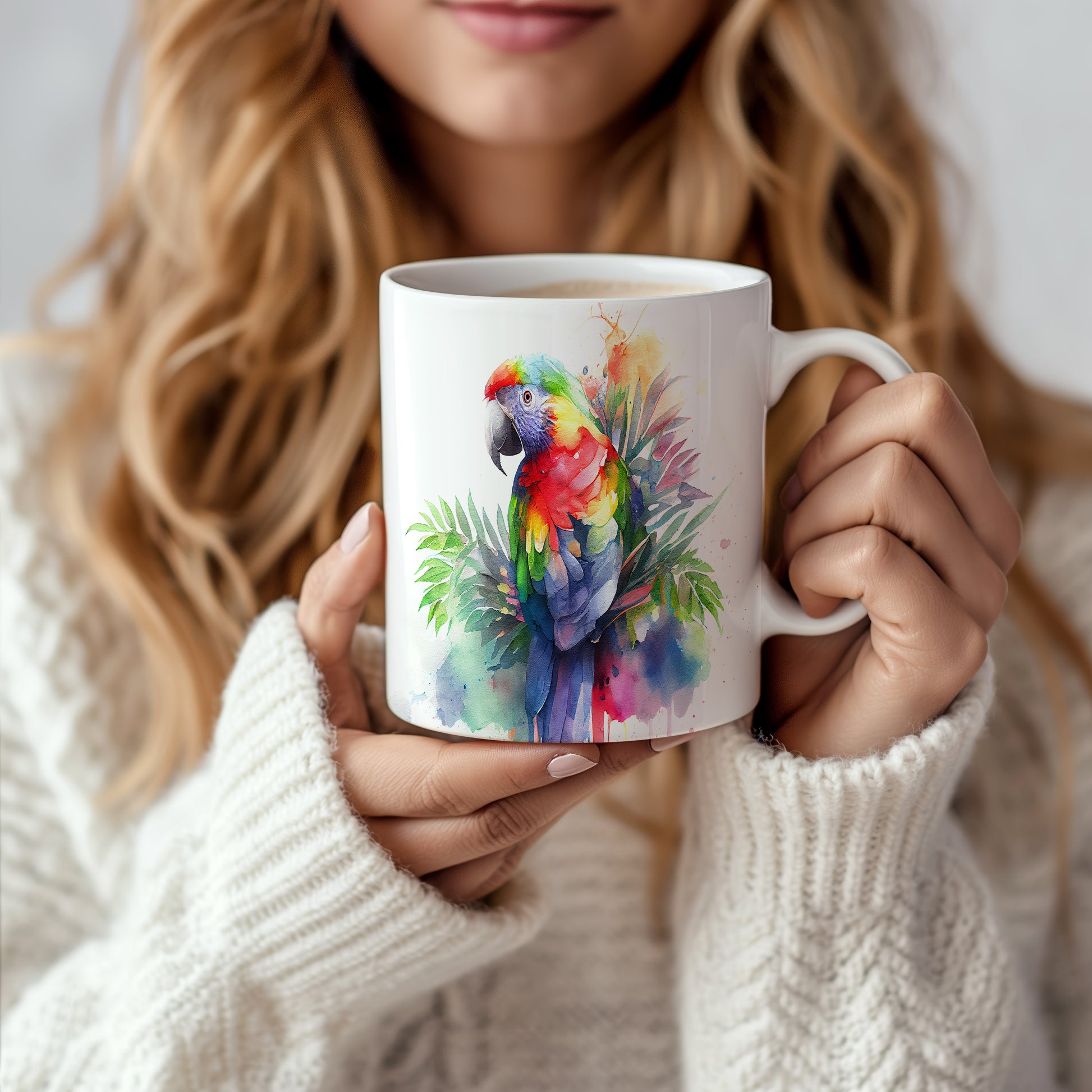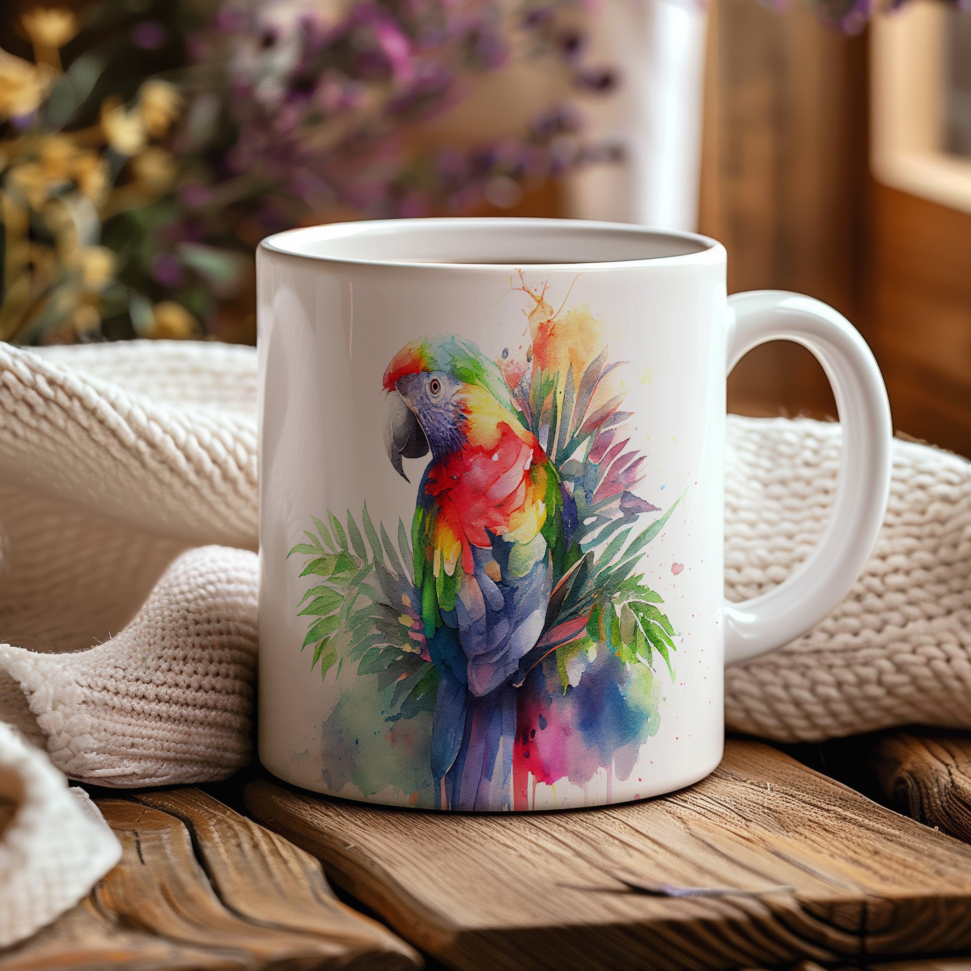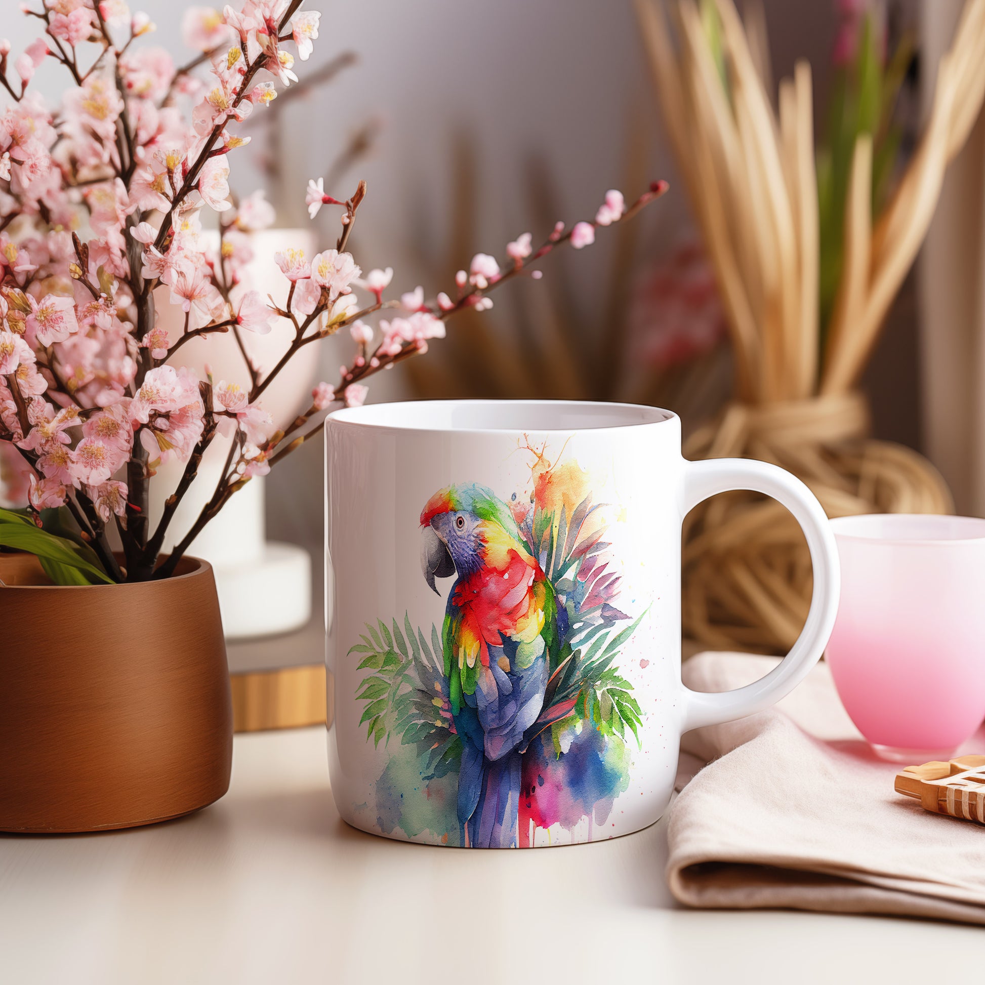 Hrnek s papouškem a zelenými listy v akvarelovém stylu
