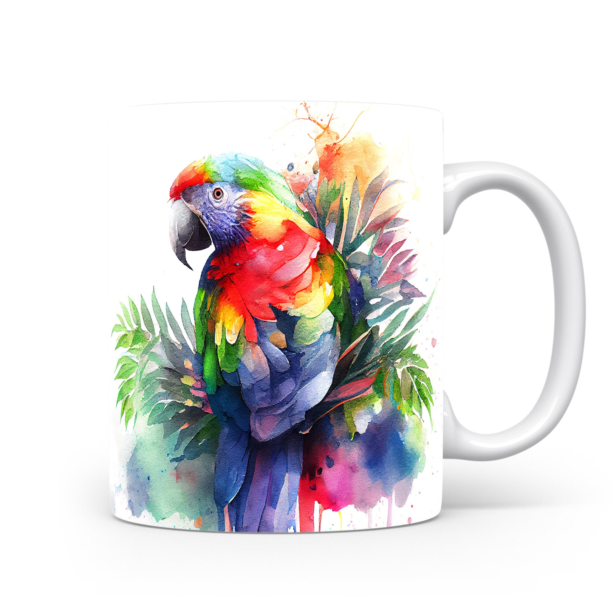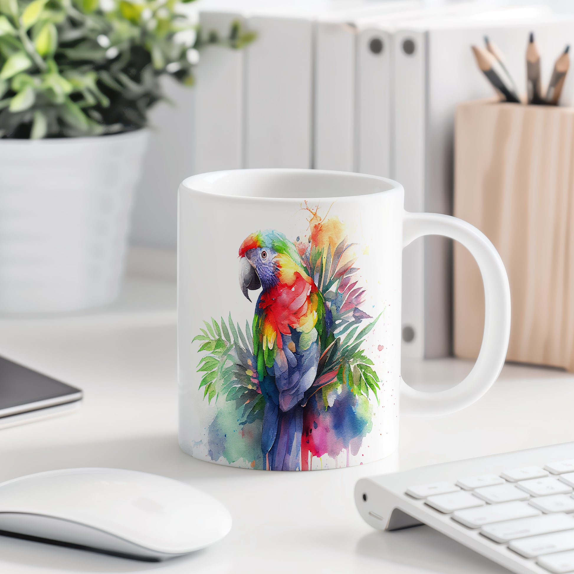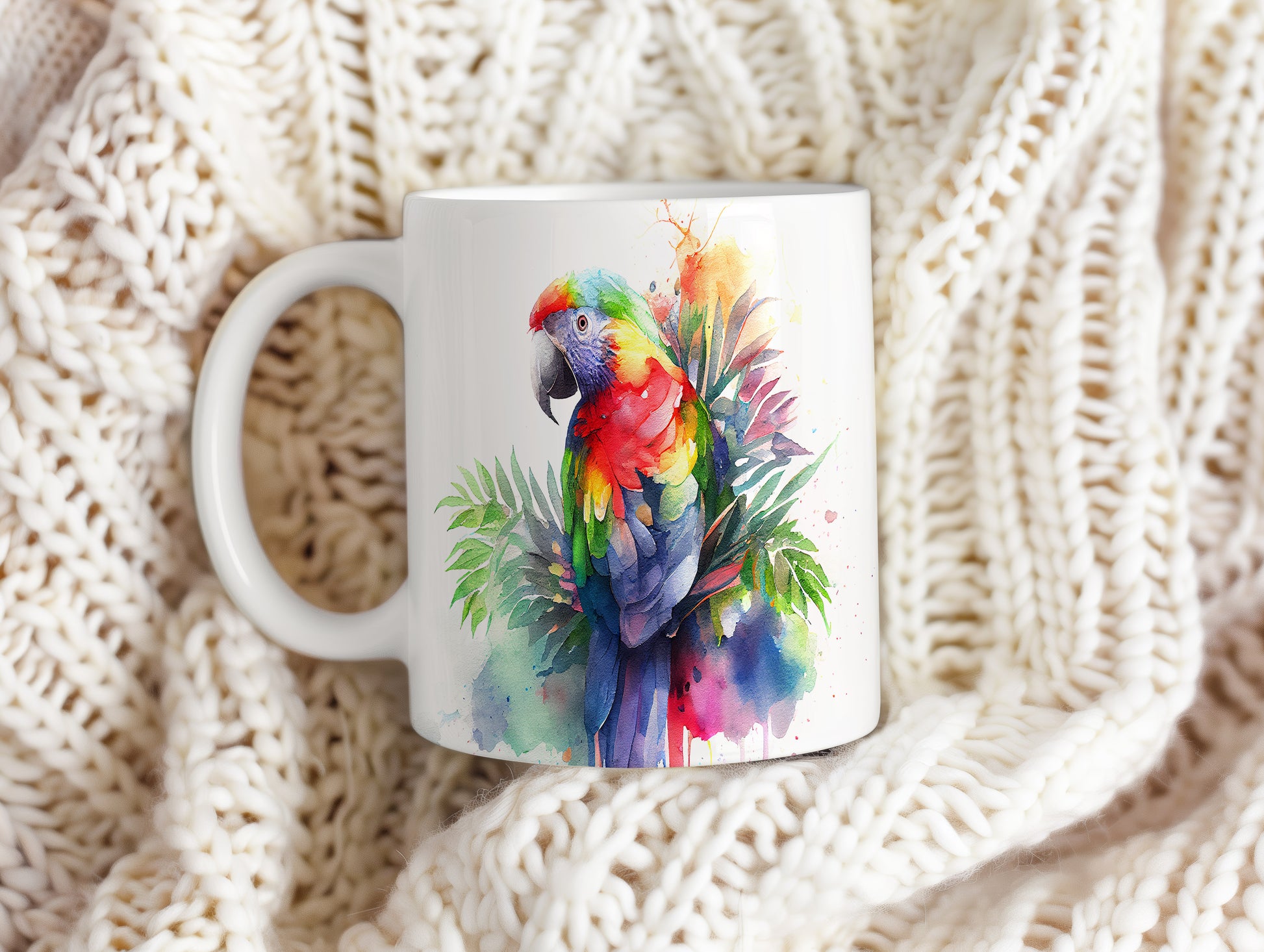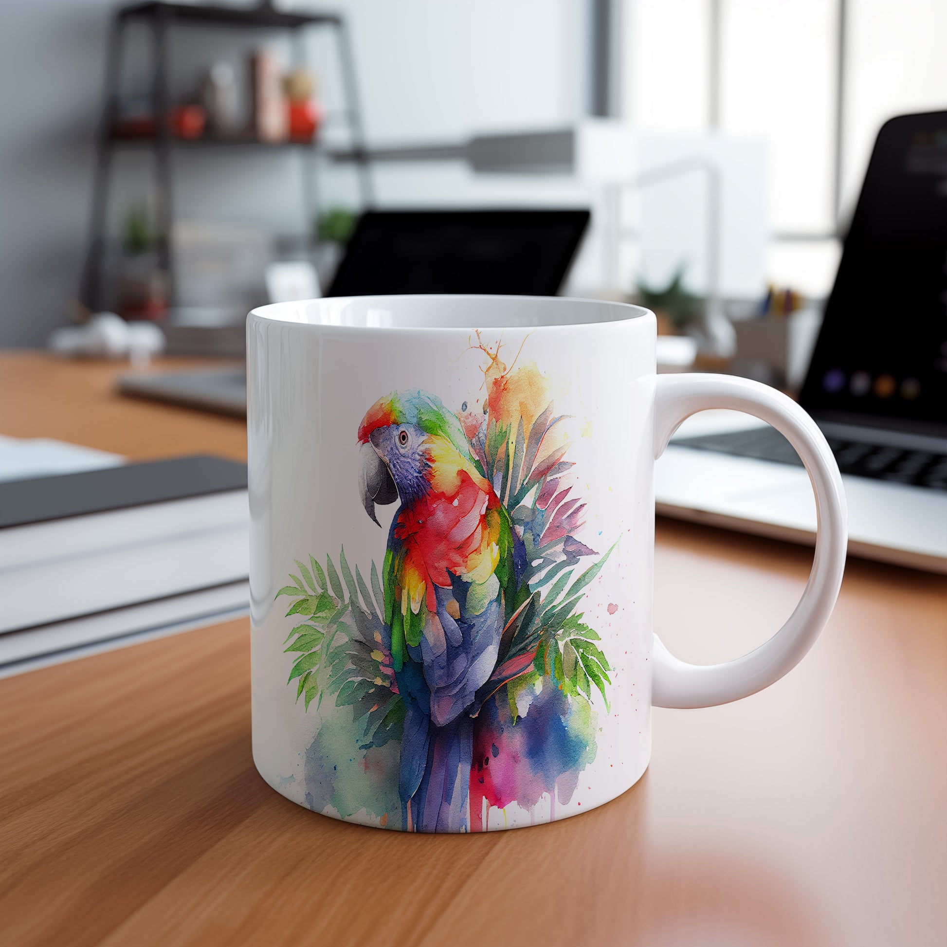 Hrnek s papouškem a zelenými listy v akvarelovém stylu