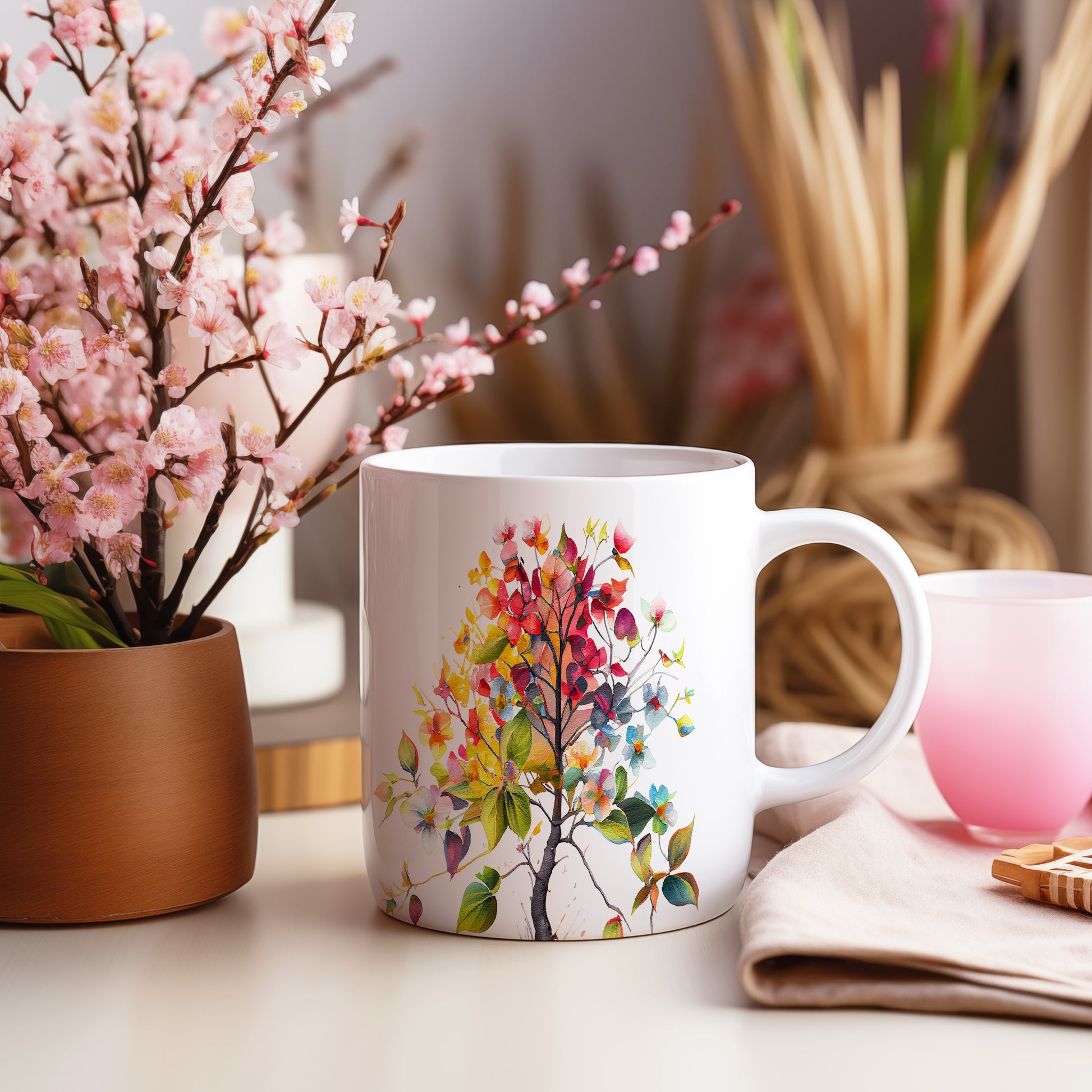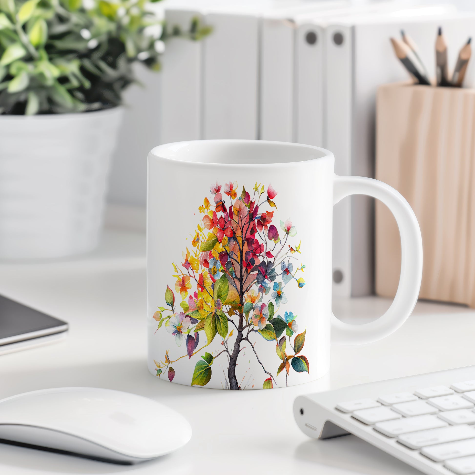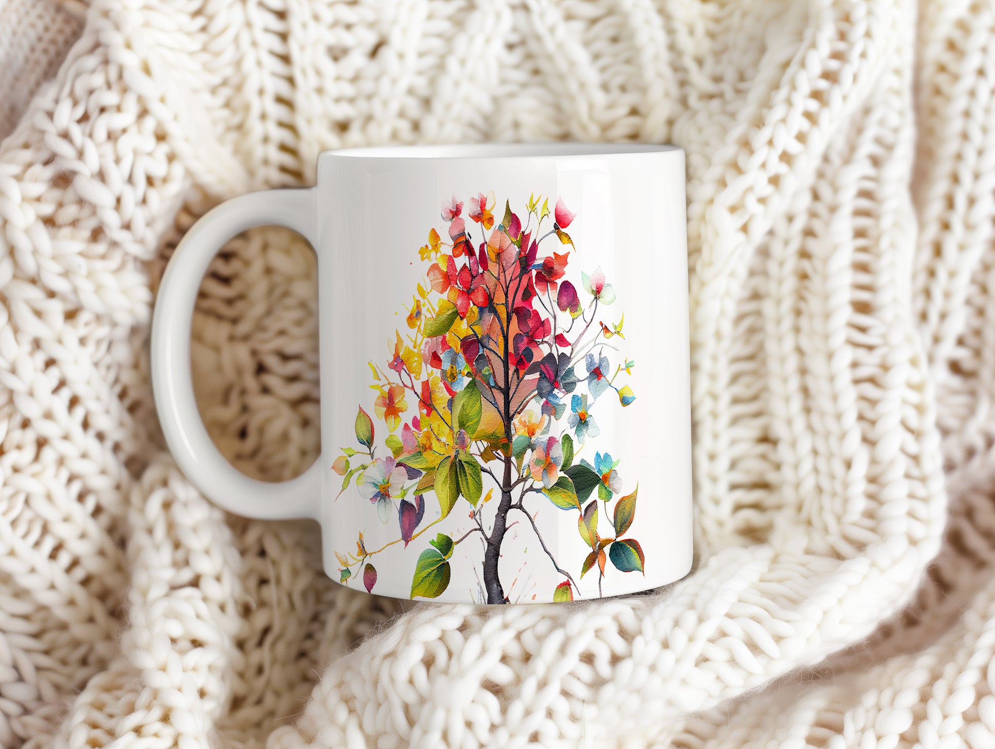 Hrnek s pestrobarevným stromem a květinami pro milovníky přírody
