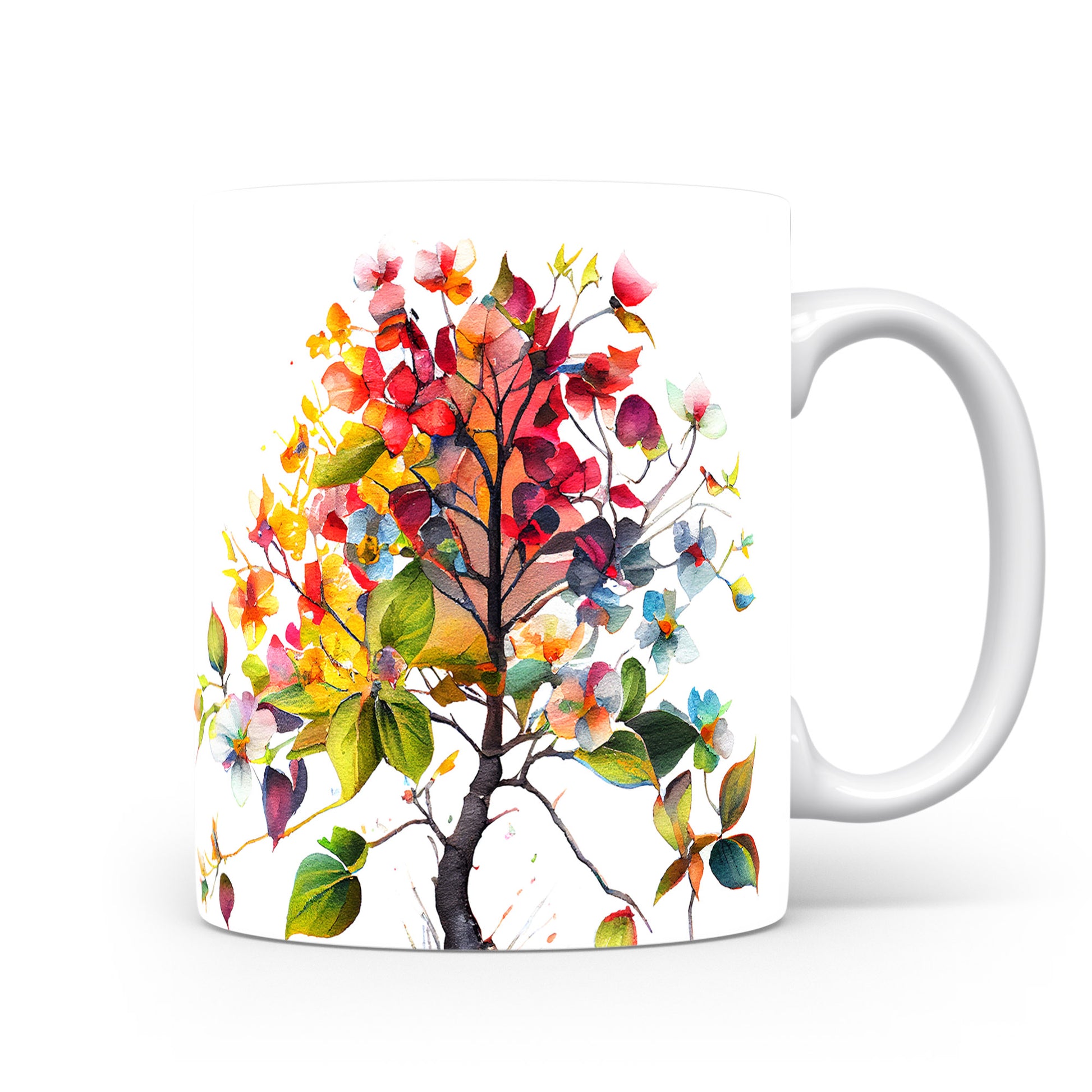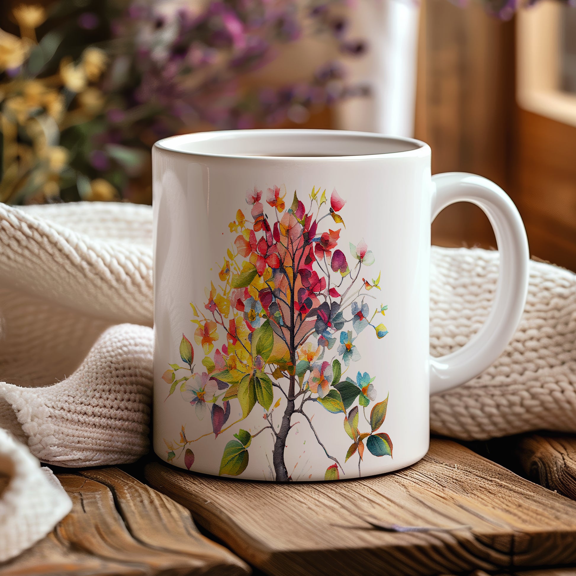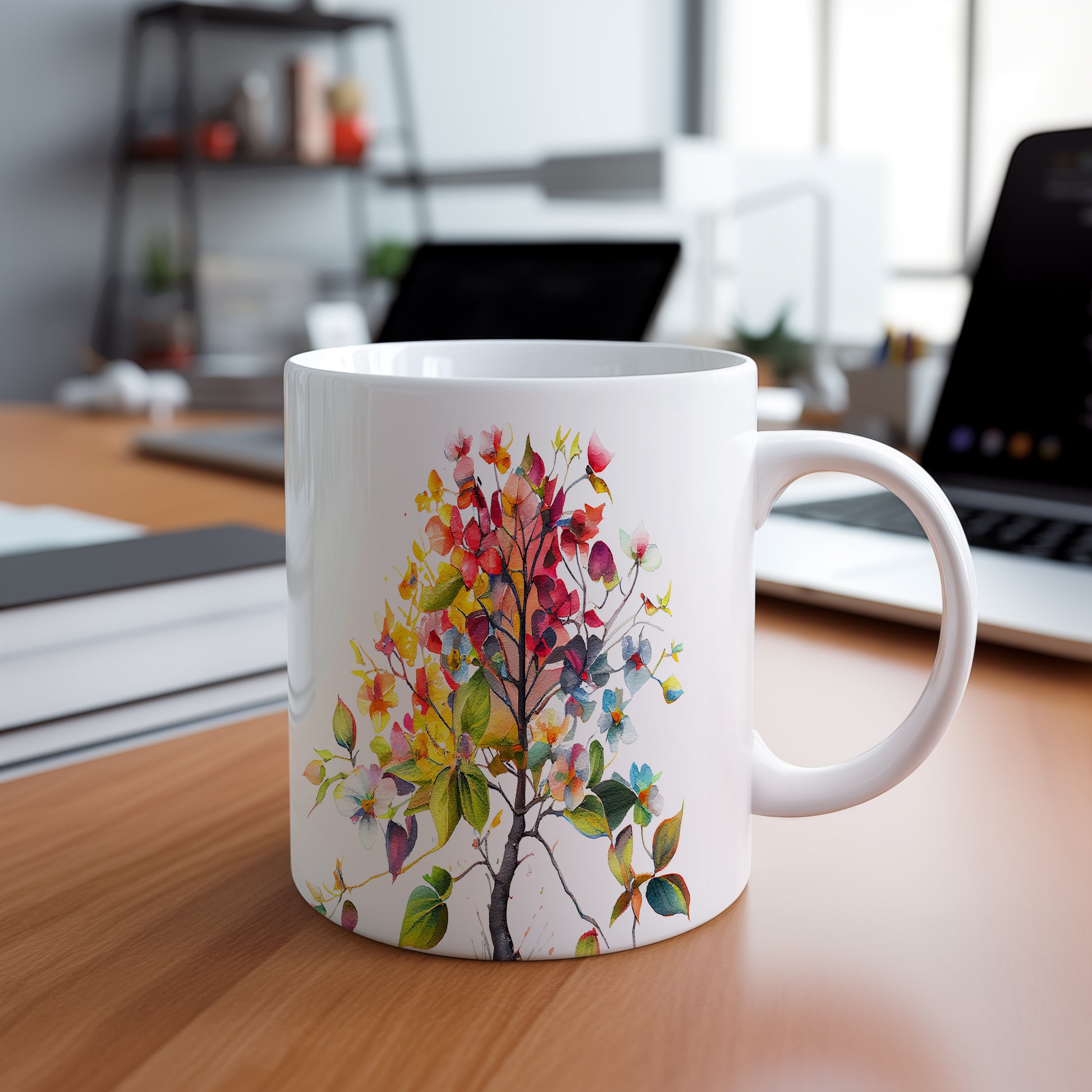 Hrnek s pestrobarevným stromem a květinami pro milovníky přírody