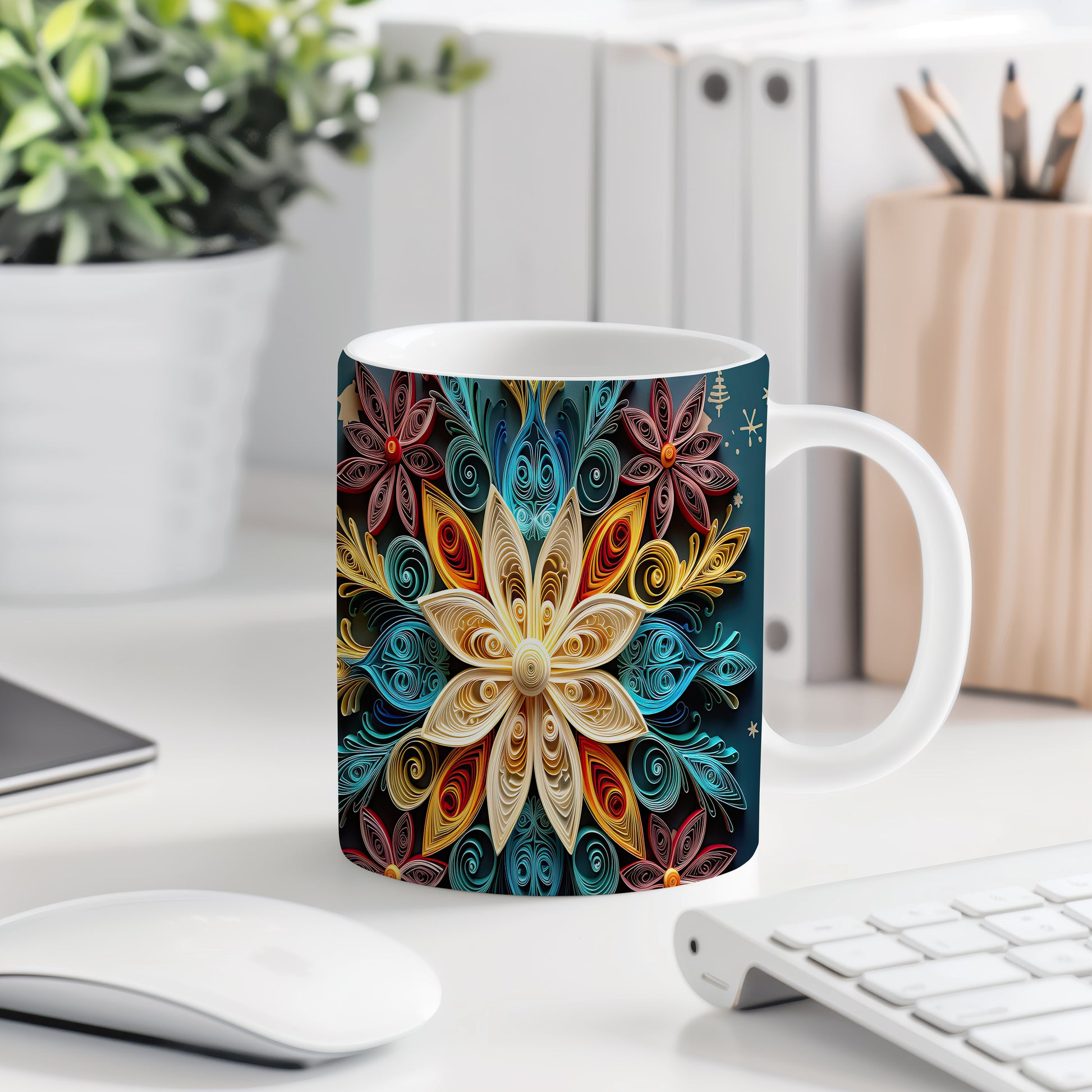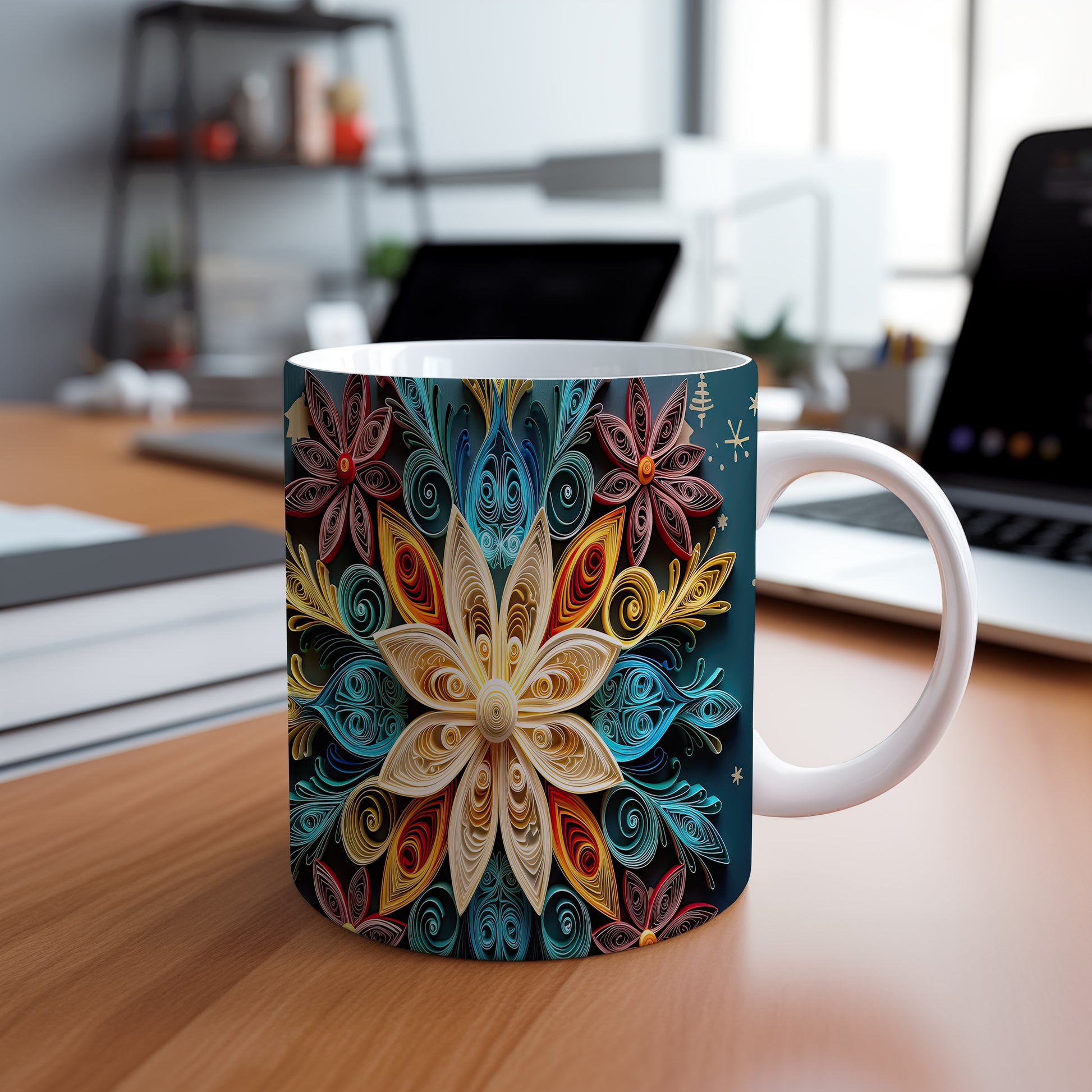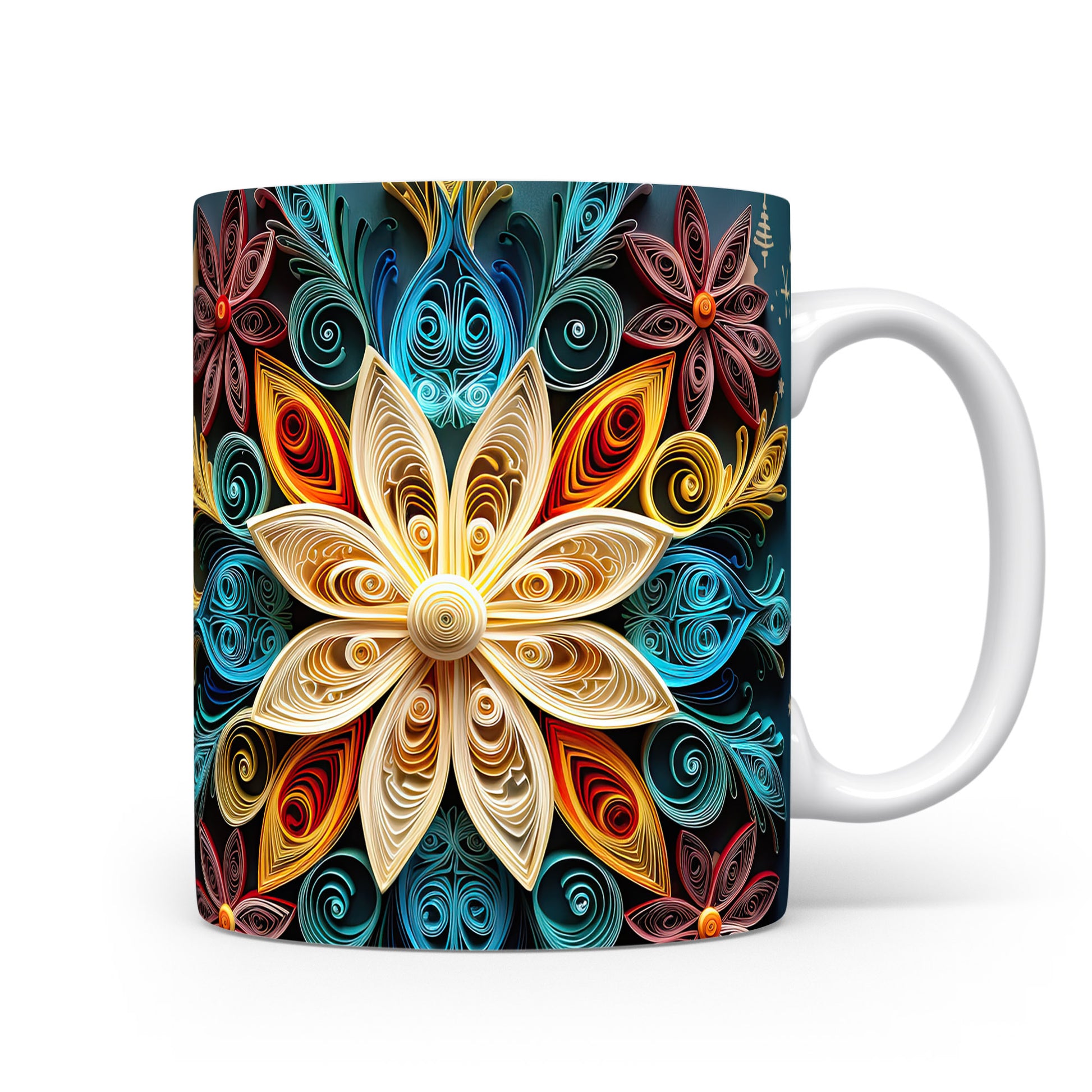Hrnek s pestrými květinovými vzory a motivem květinových ornamentů
