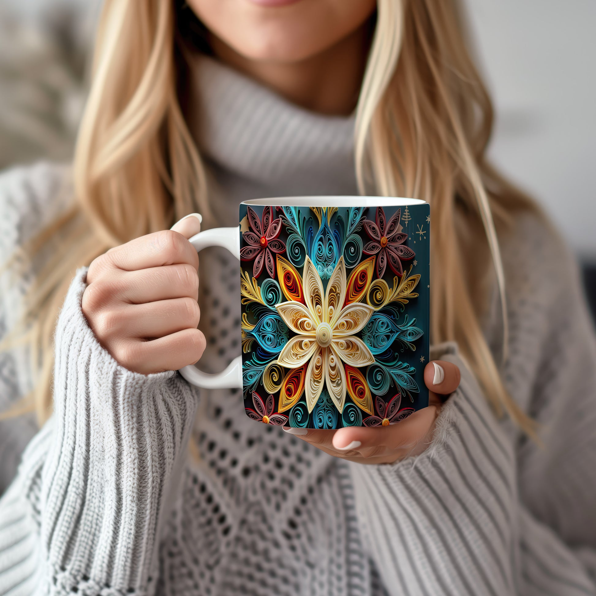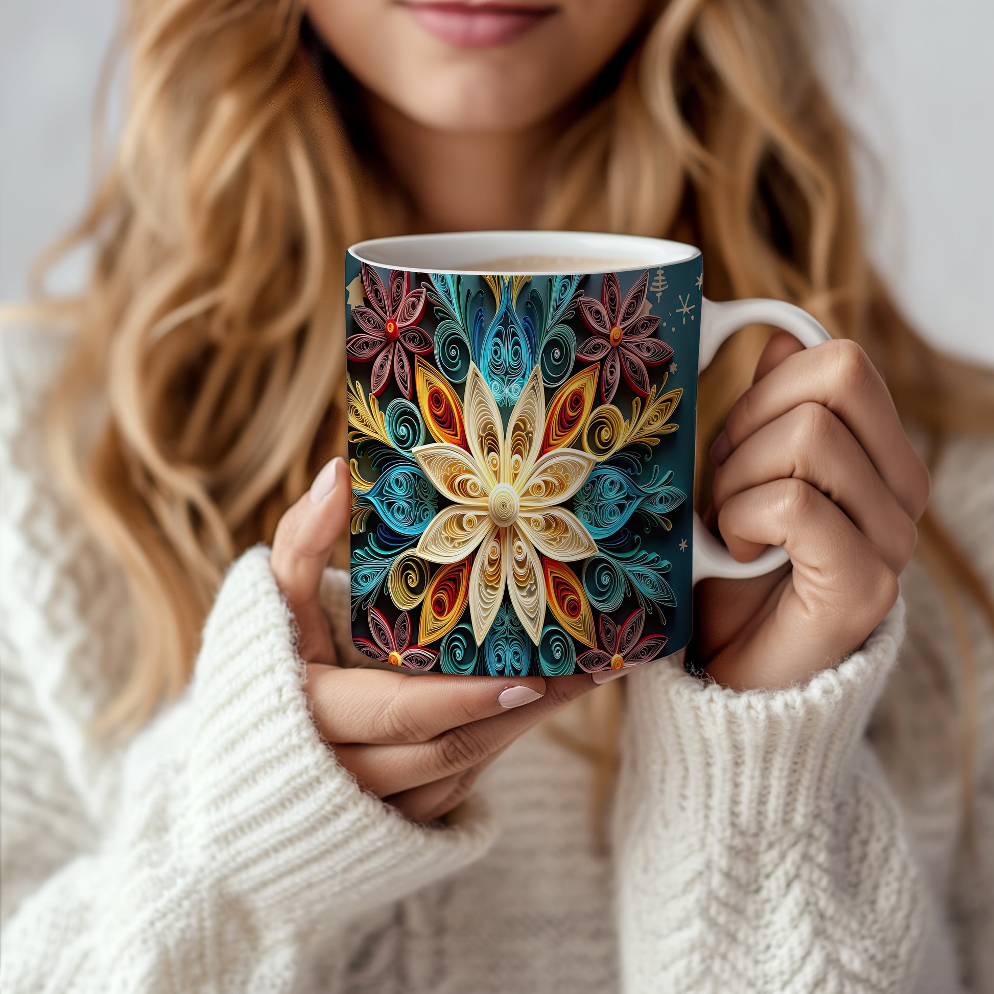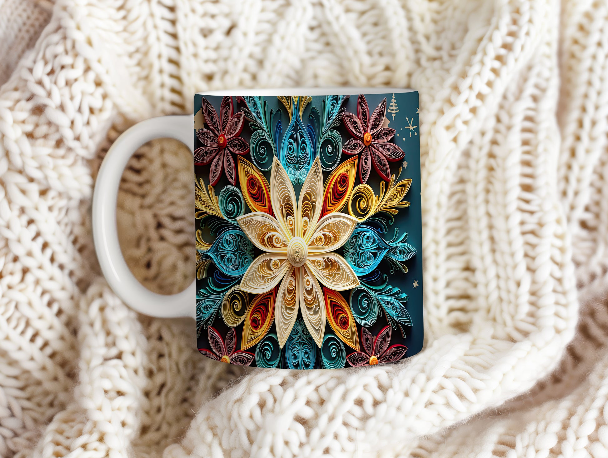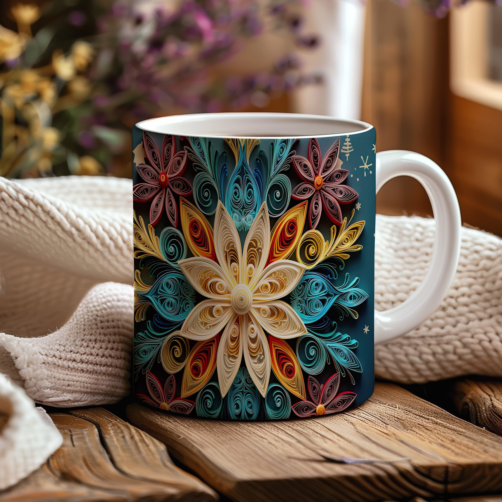 Hrnek s pestrými květinovými vzory a motivem květinových ornamentů