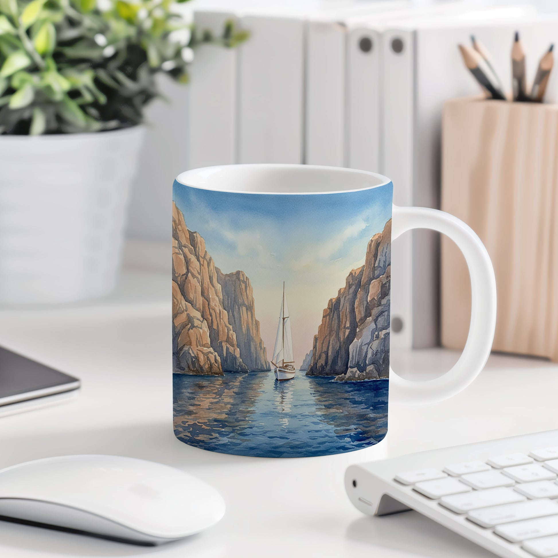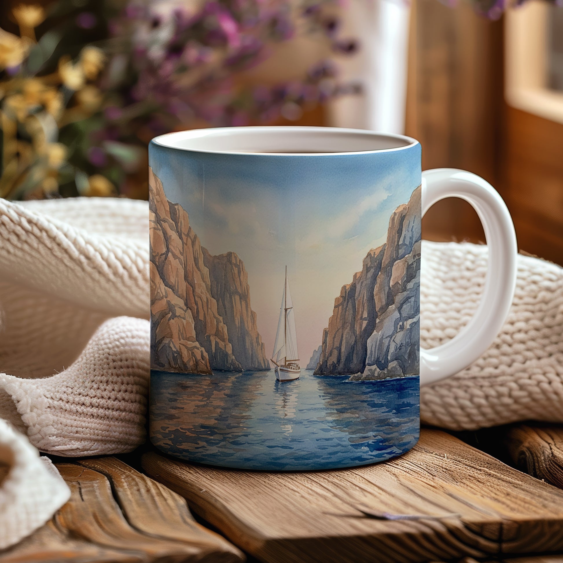 Vydejte se na klidnou plavbu mezi majestátními útesy s tímto jedinečným hrnkem. Akvarelový design přináší do vašeho dne špetku dobrodružství. Hrnek 330 ml – vhodný do myčky i mikrovlnky.
