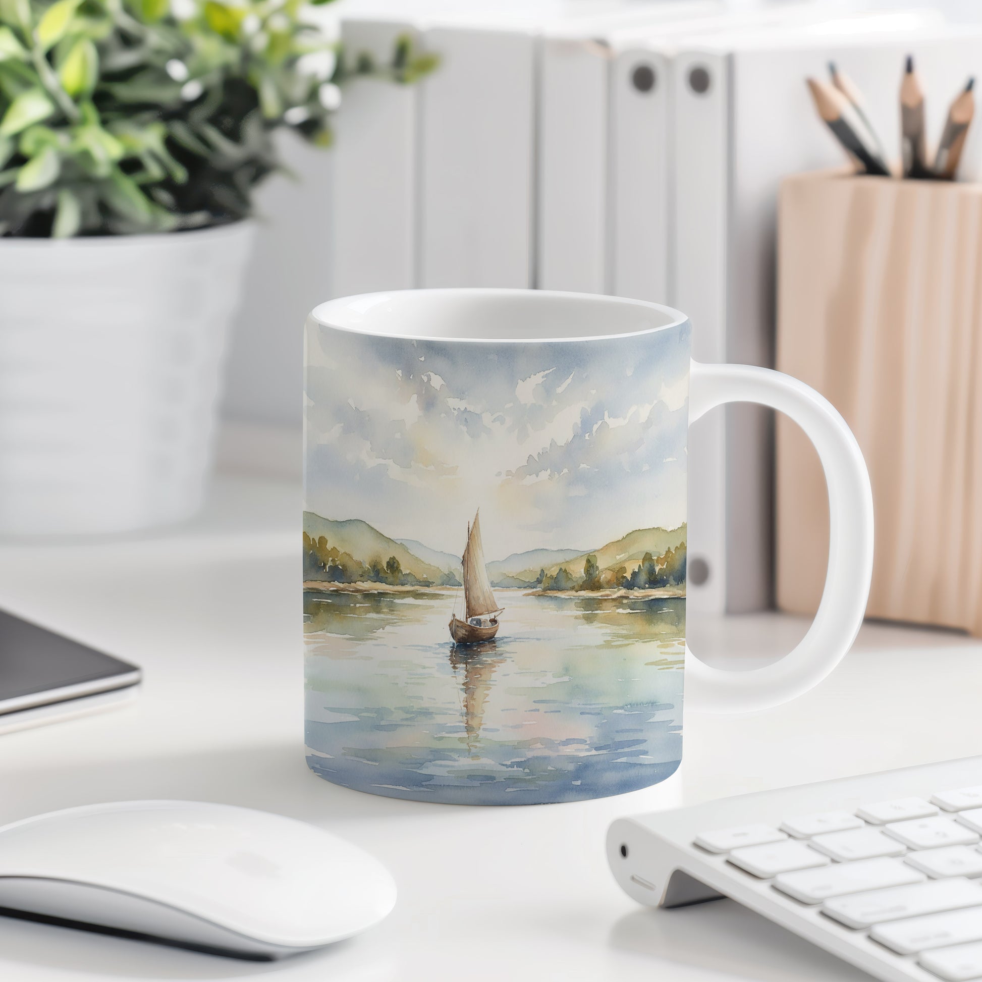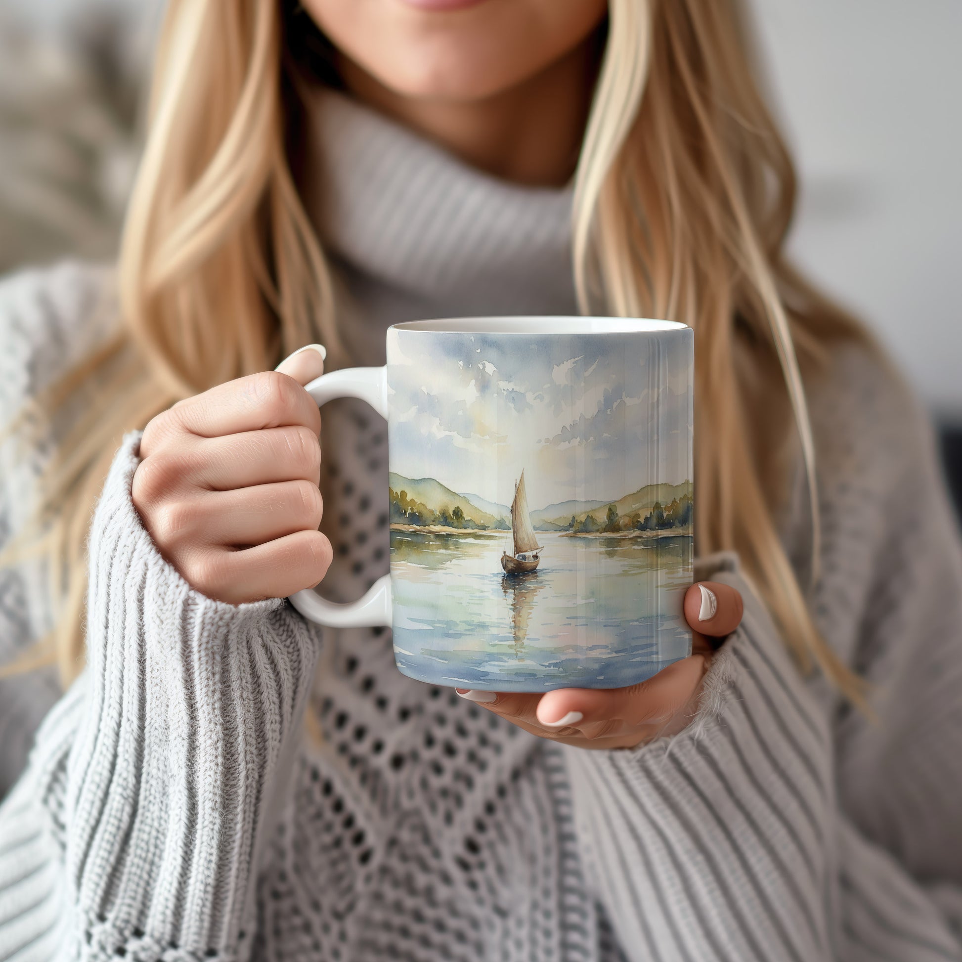 Objevte kouzlo plachetnice na klidné vodní hladině. Jemné akvarelové provedení přináší klid a harmonii. Hrnek 330 ml – vhodný do myčky i mikrovlnky.