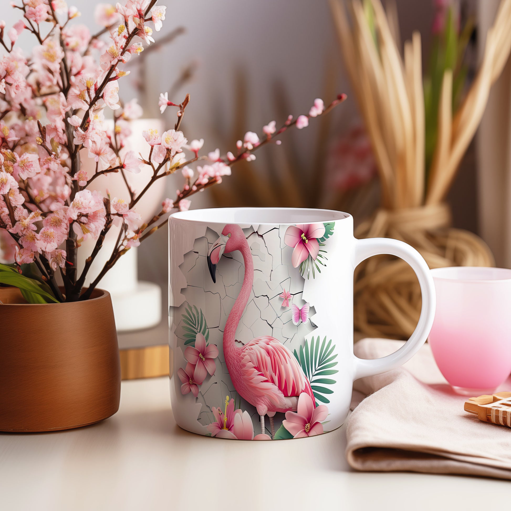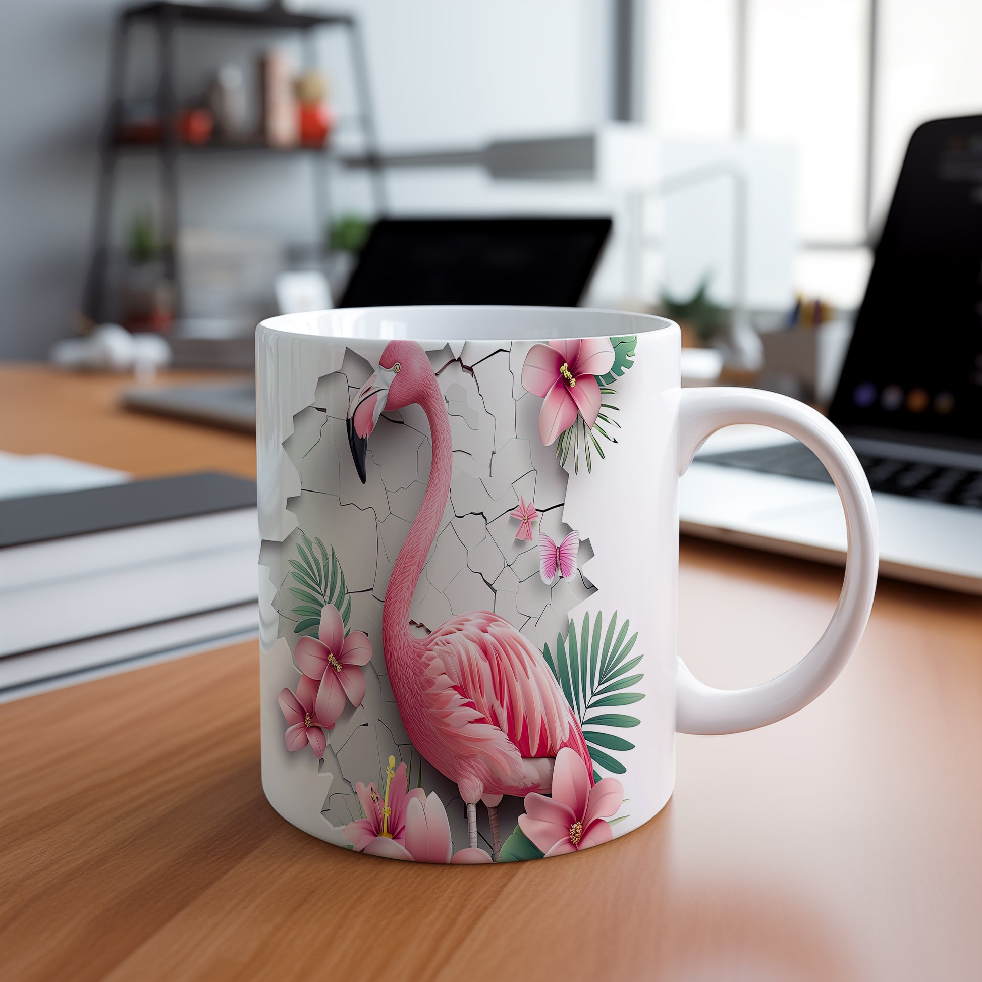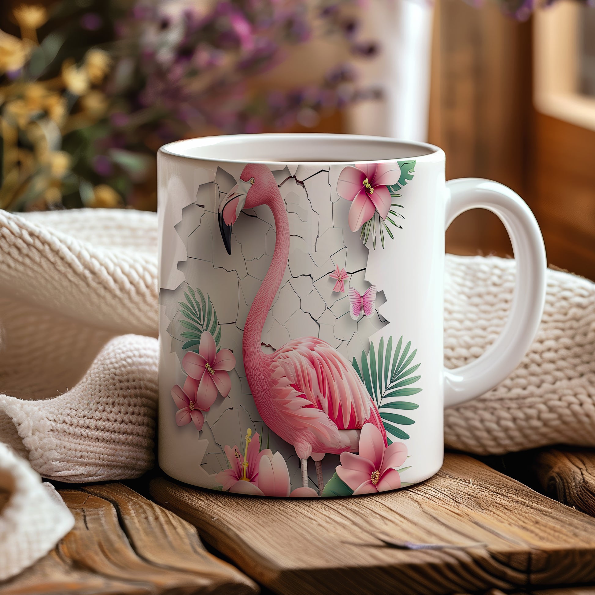 Tento hrnek zdobí krásný motiv plameňáka obklopeného květinami. Je ideální pro milovníky přírody a skvělým dárkem pro přátele nebo rodinu. Materiál: keramika. Objem: 330 ml. Vhodné do myčky i mikrovlnky. Používání tohoto hrnku přináší radost a oživí každé pití.