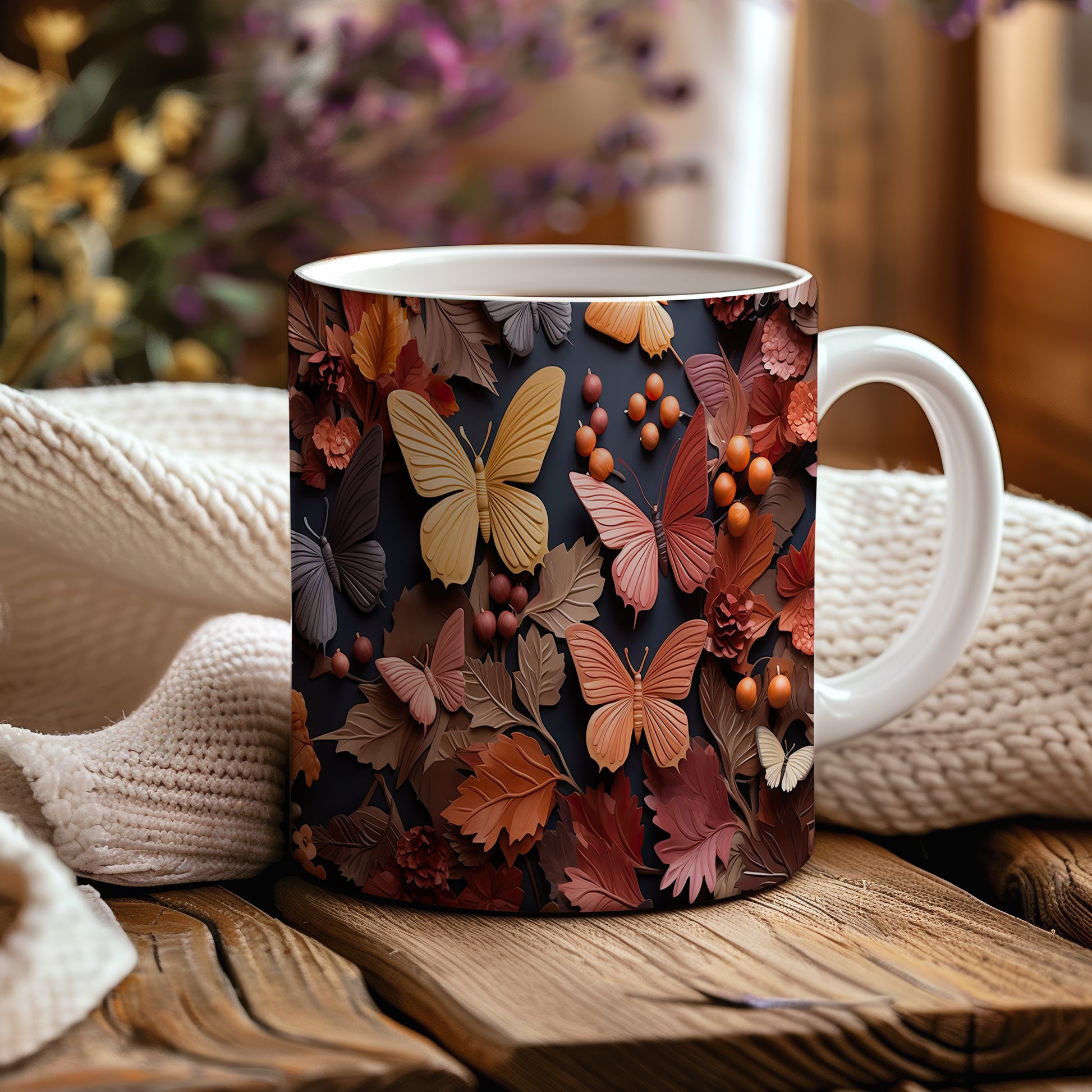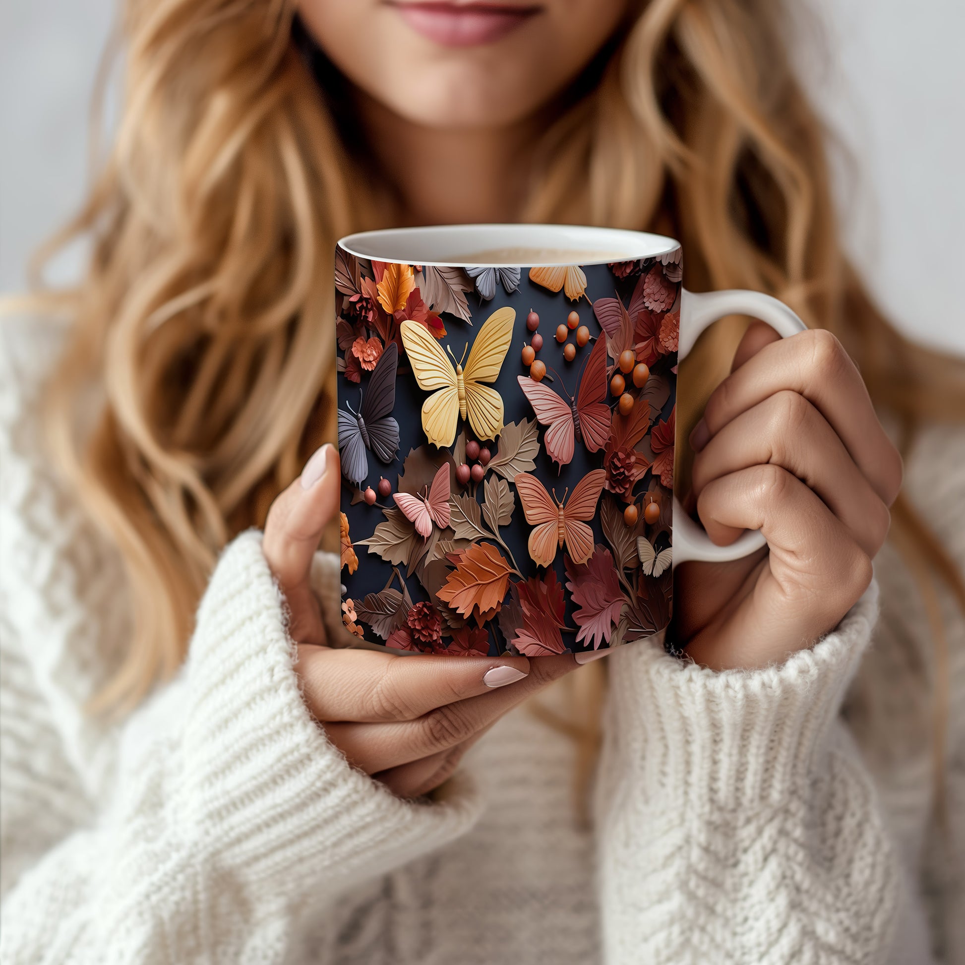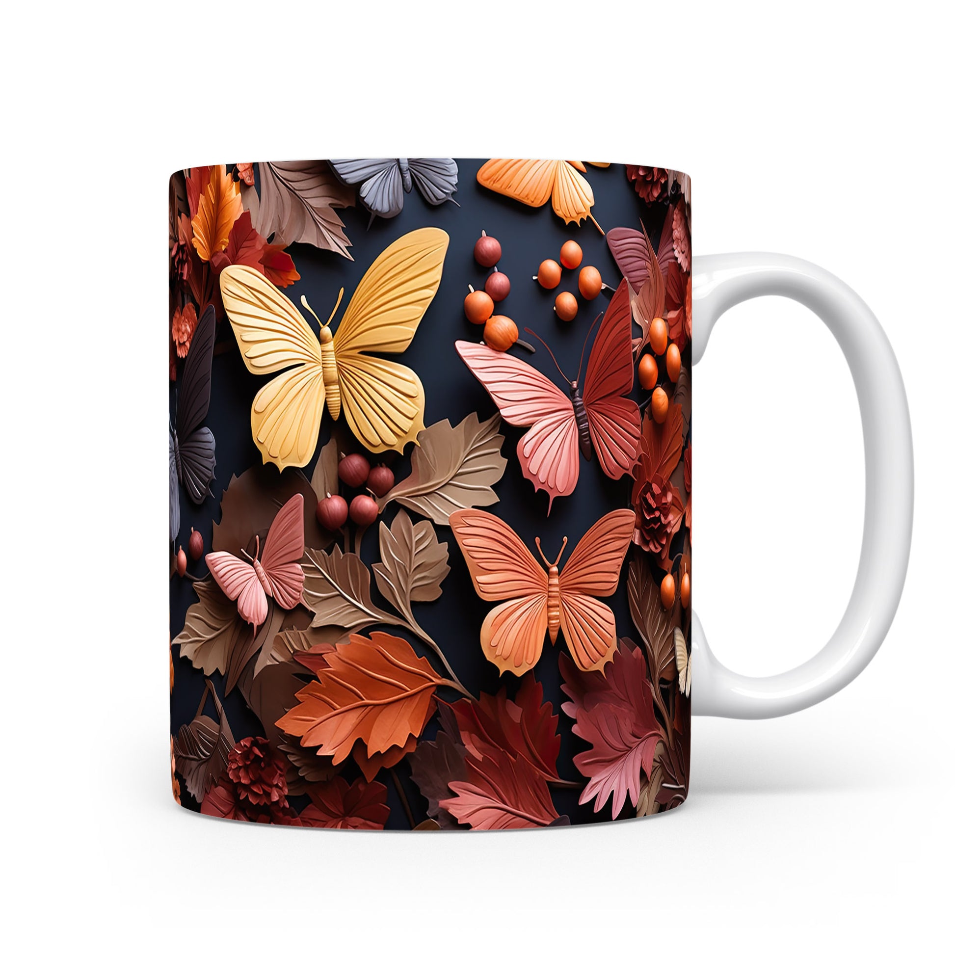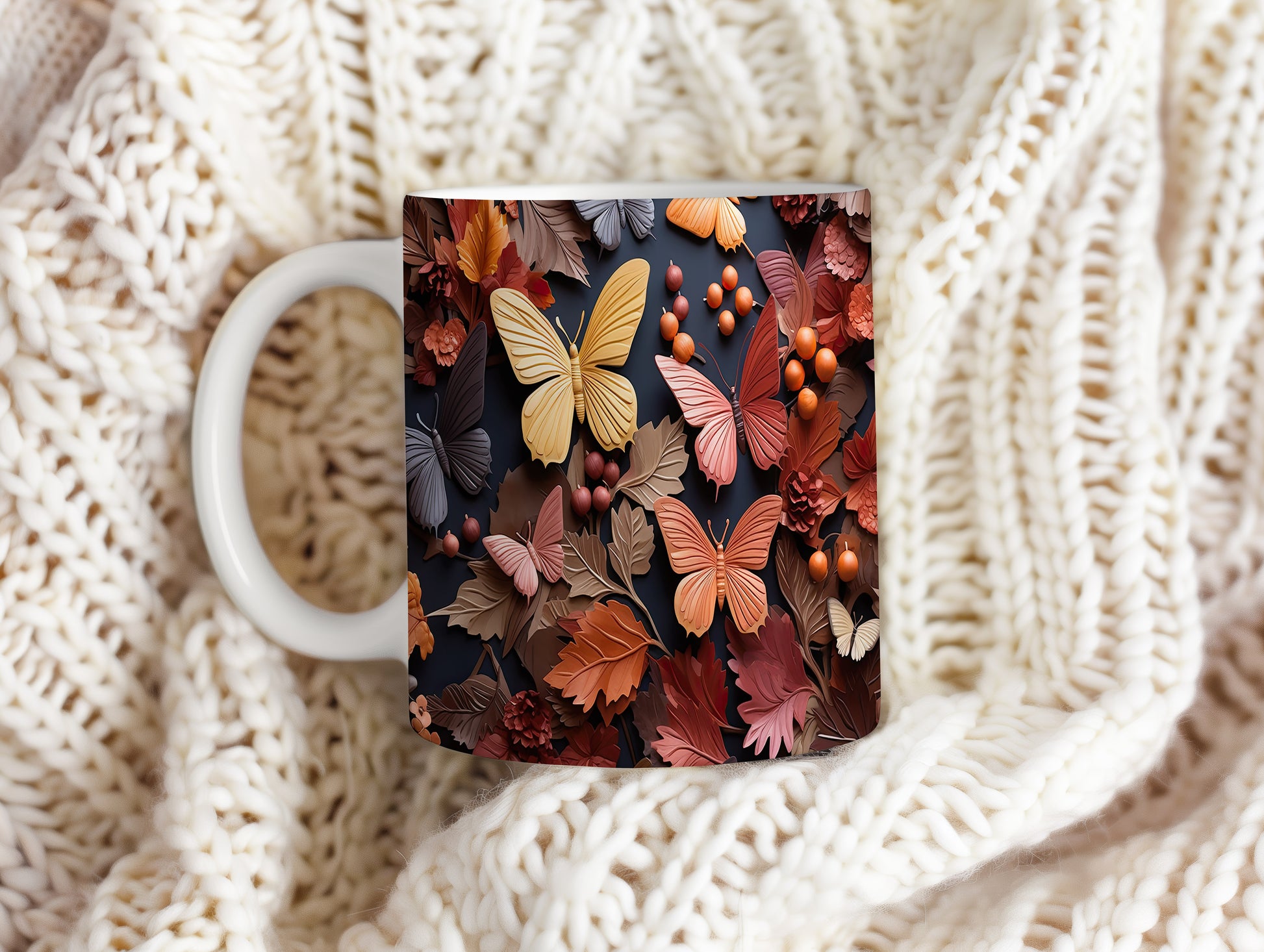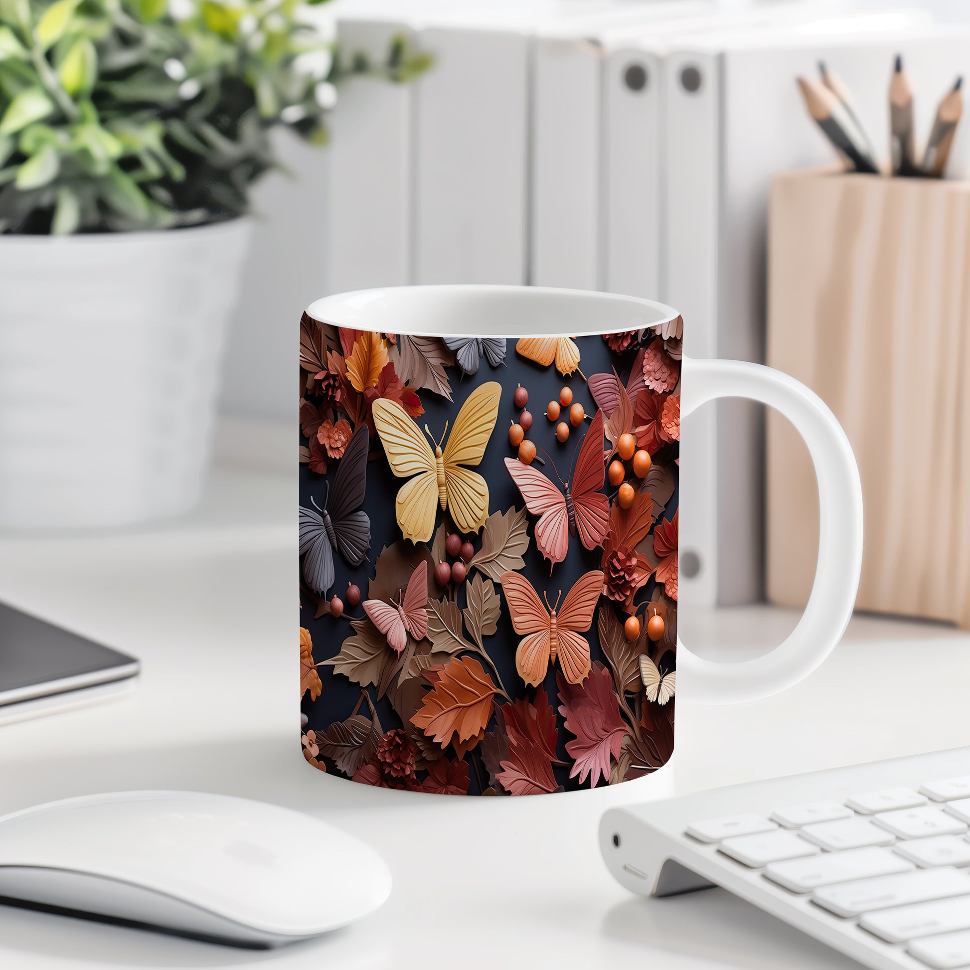 Hrnek s podzimními motýly a listy