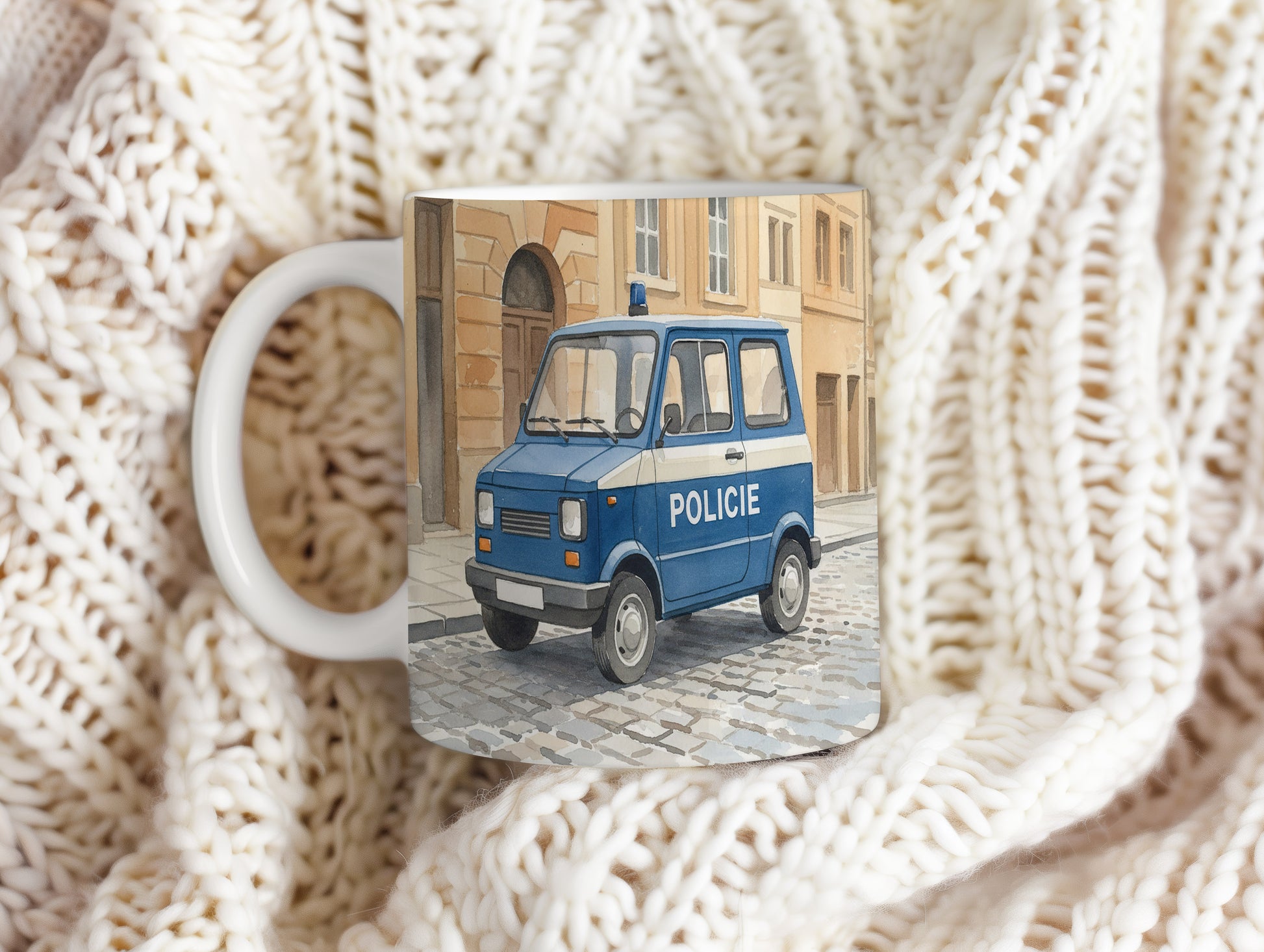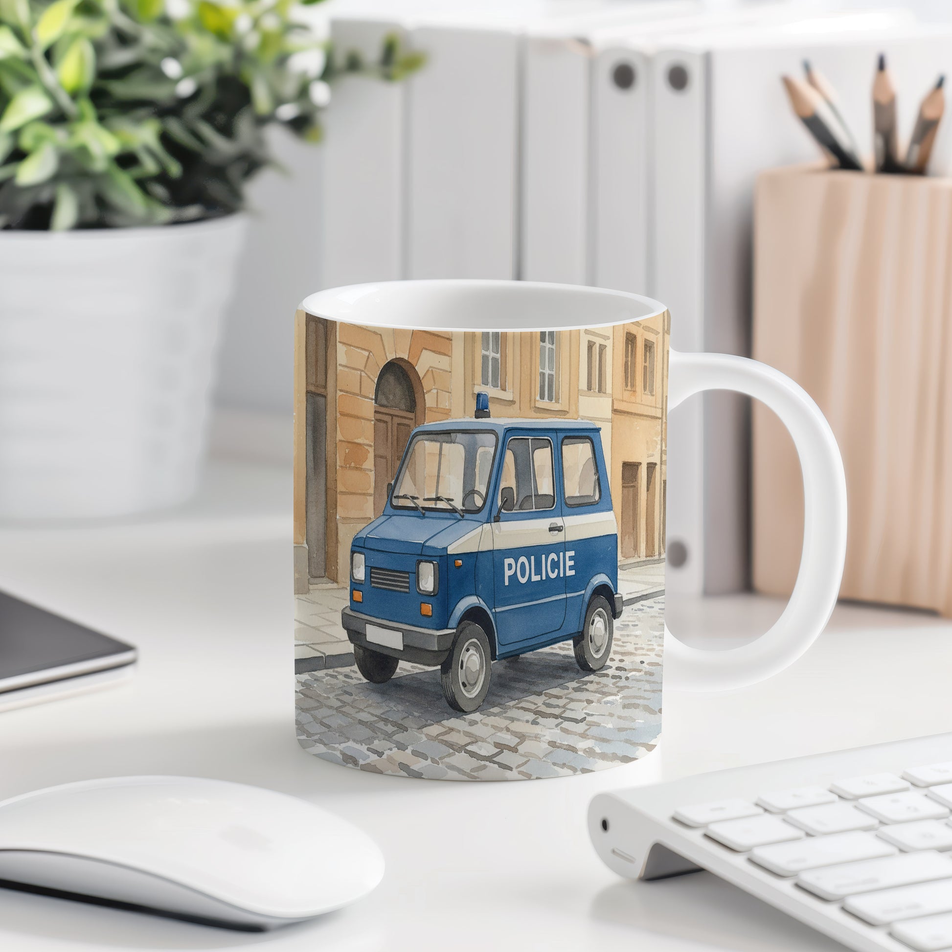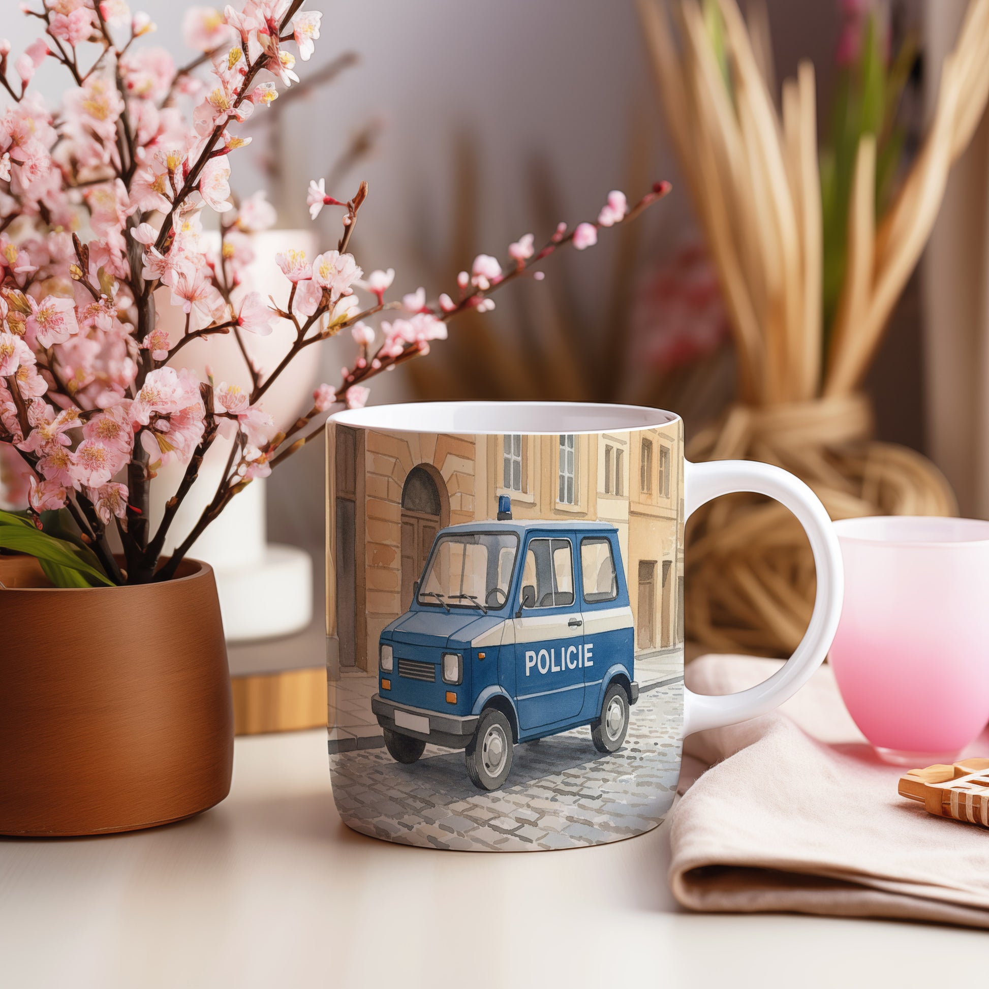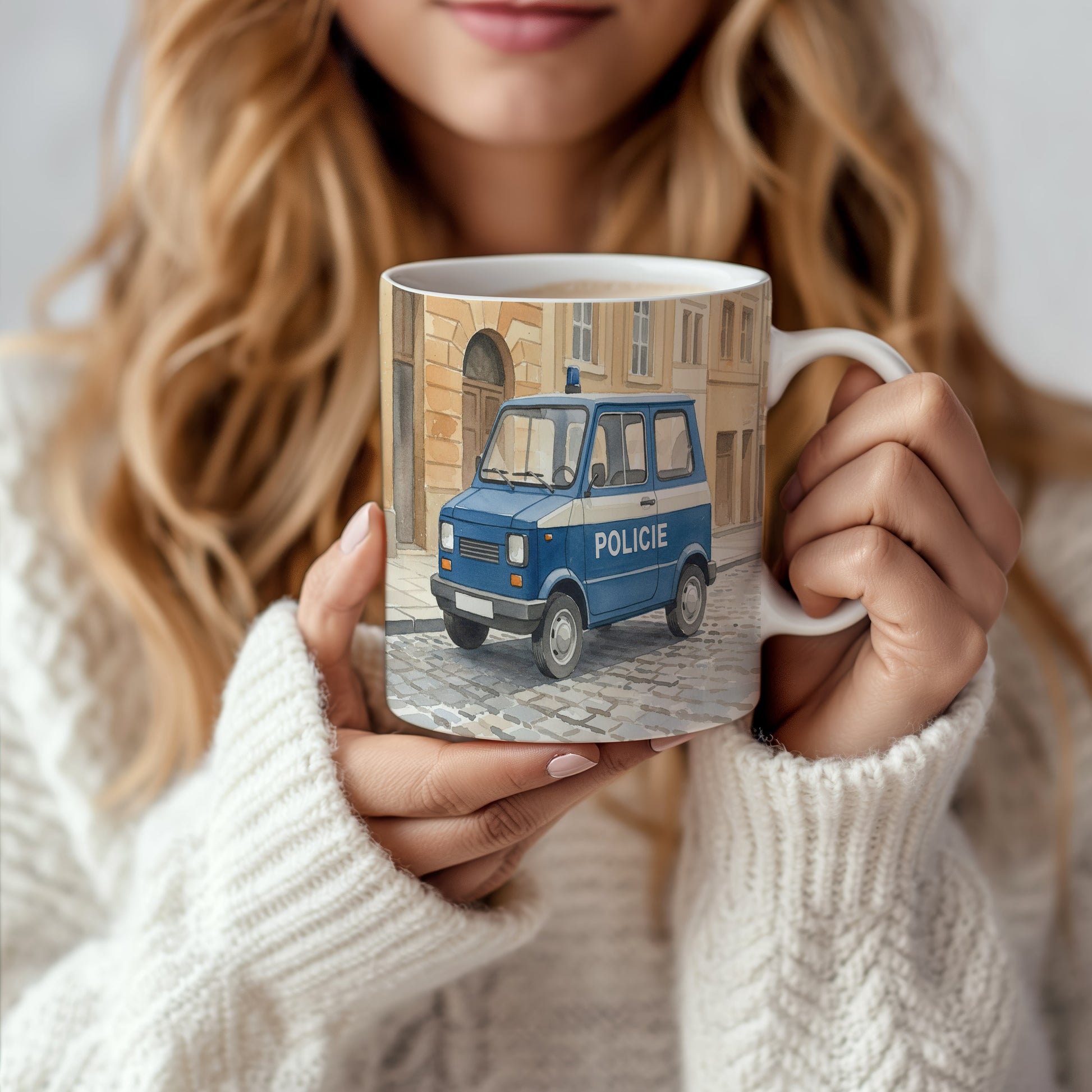 Objevte kouzlo městské historie s hrnkem, na kterém je akvarelově zachycena policejní dodávka v malebné ulici. Hrnek 330 ml – vhodný do myčky i mikrovlnky.