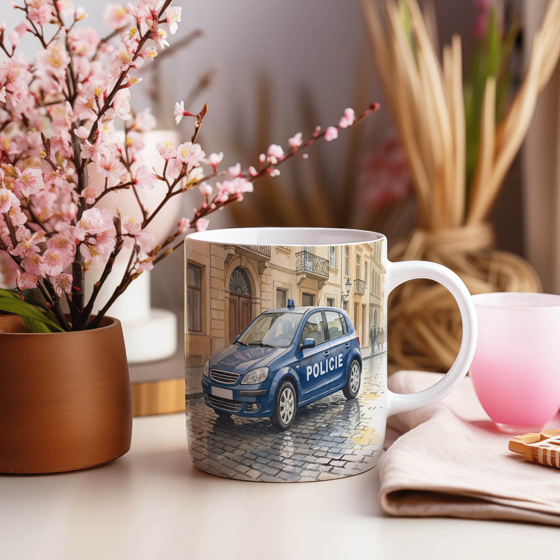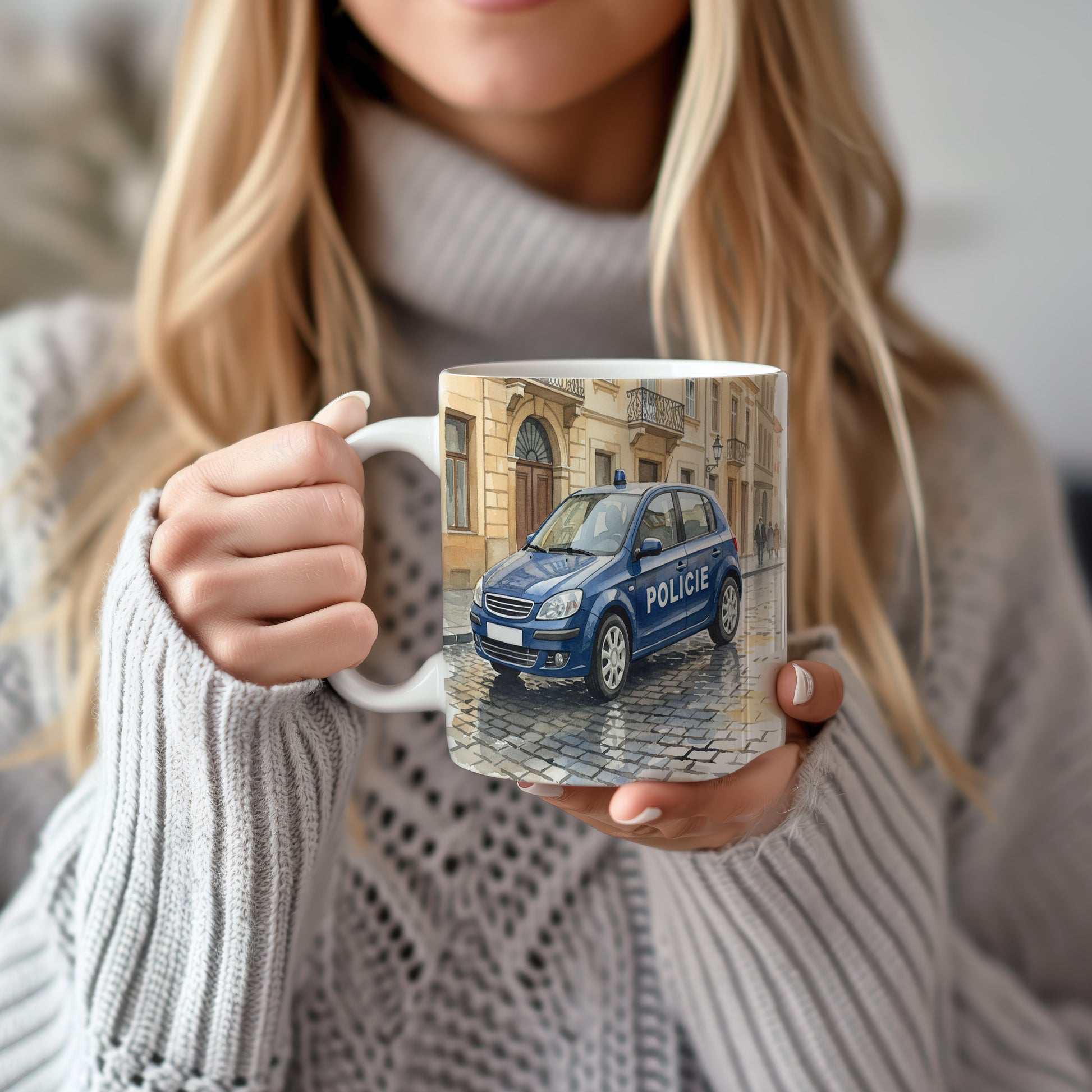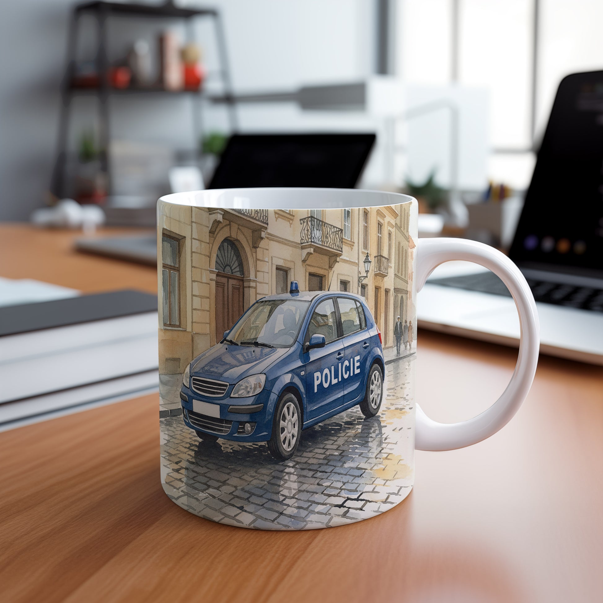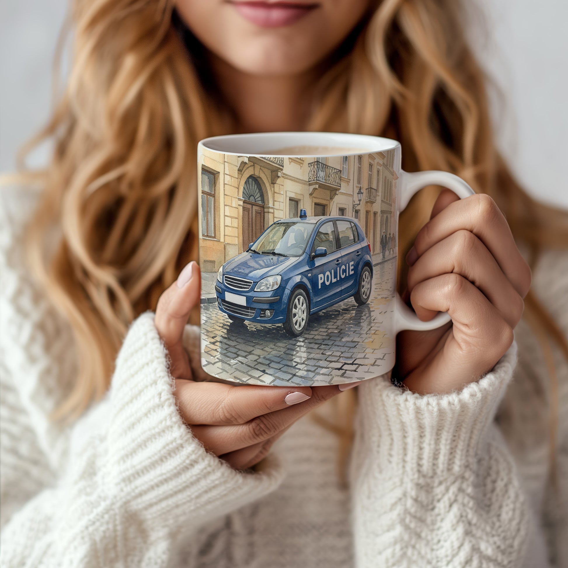 Objevte krásu akvarelu s modrým policejním autem na historickém náměstí. Ideální pro milovníky dopravy a umění. Hrnek 330 ml – vhodný do myčky i mikrovlnky.