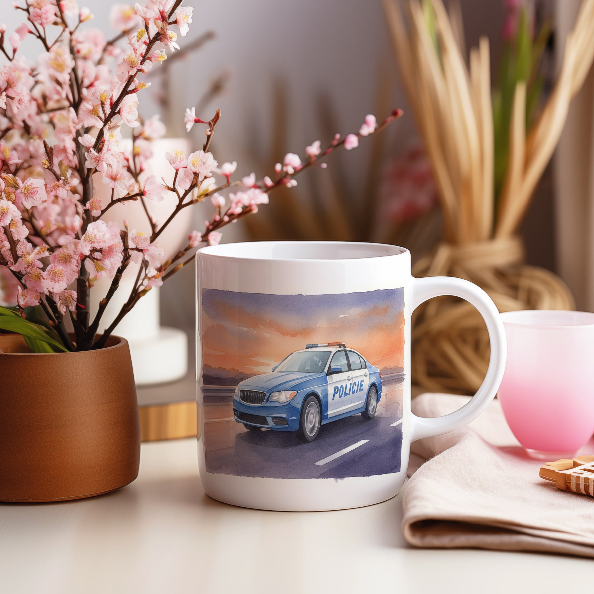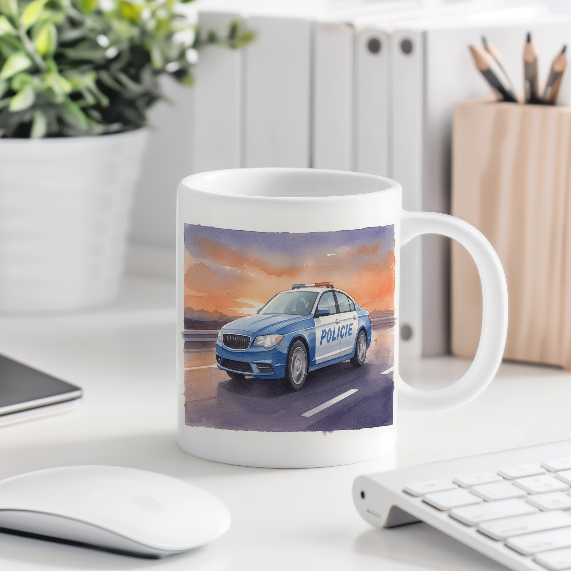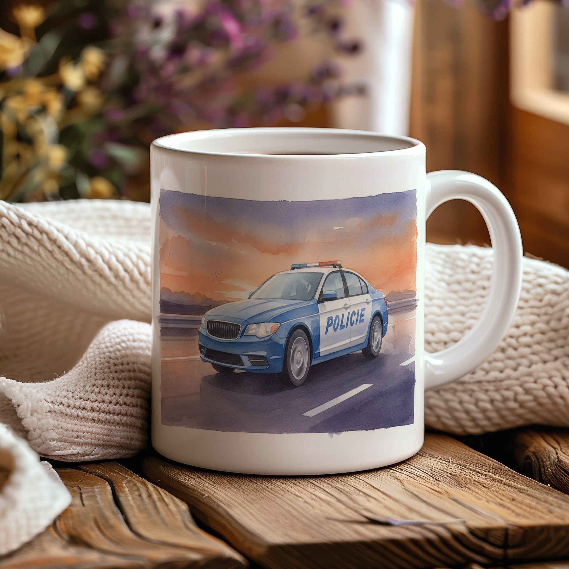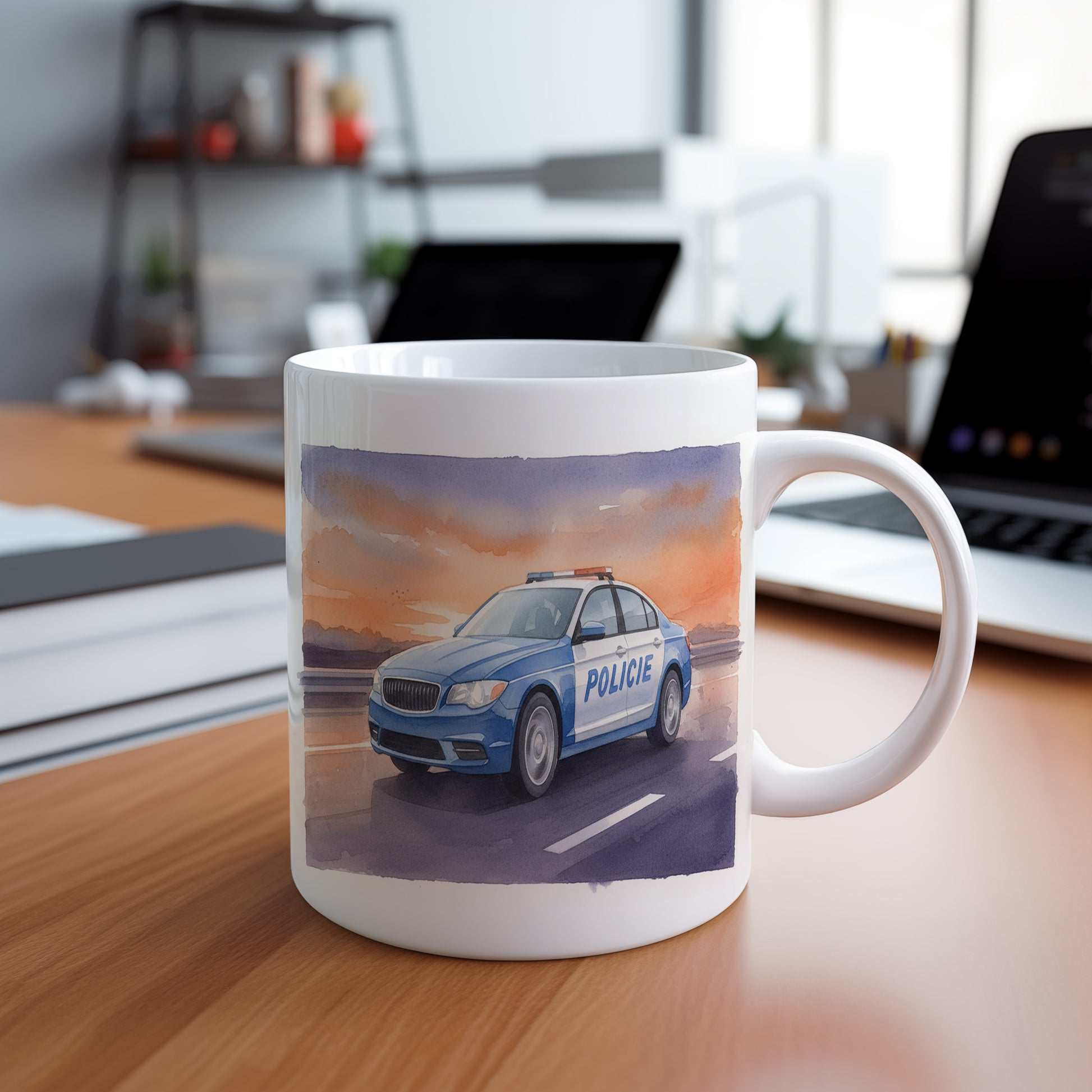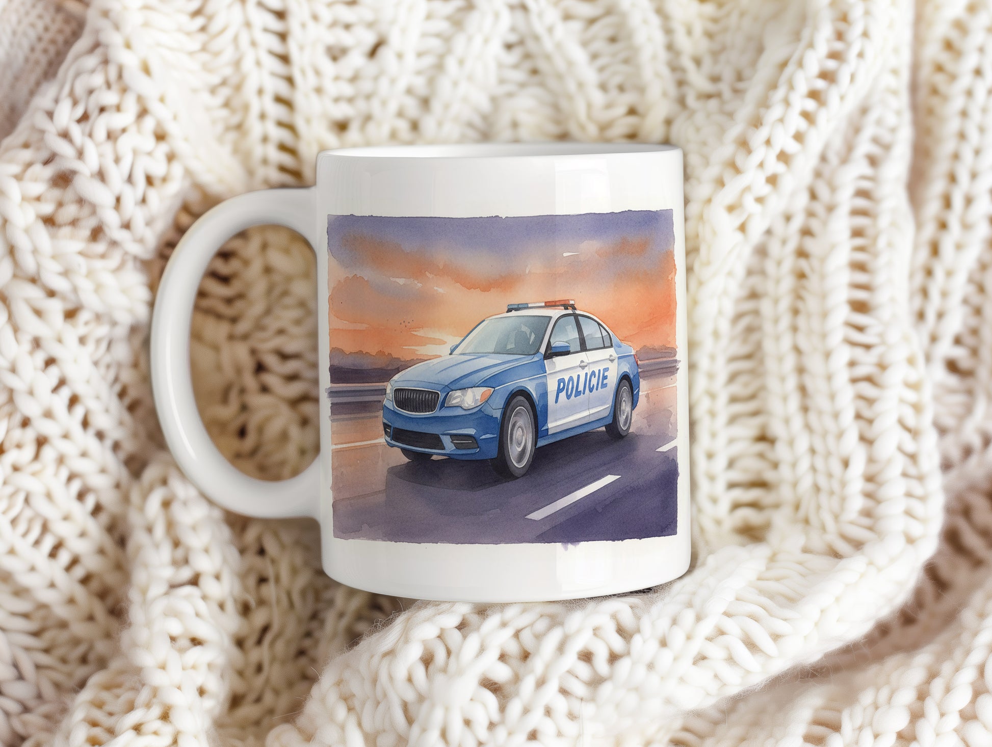 Elegantní hrnek s akvarelovým motivem policejního auta na dálnici při západu slunce. Hrnek 330 ml – vhodný do myčky i mikrovlnky.