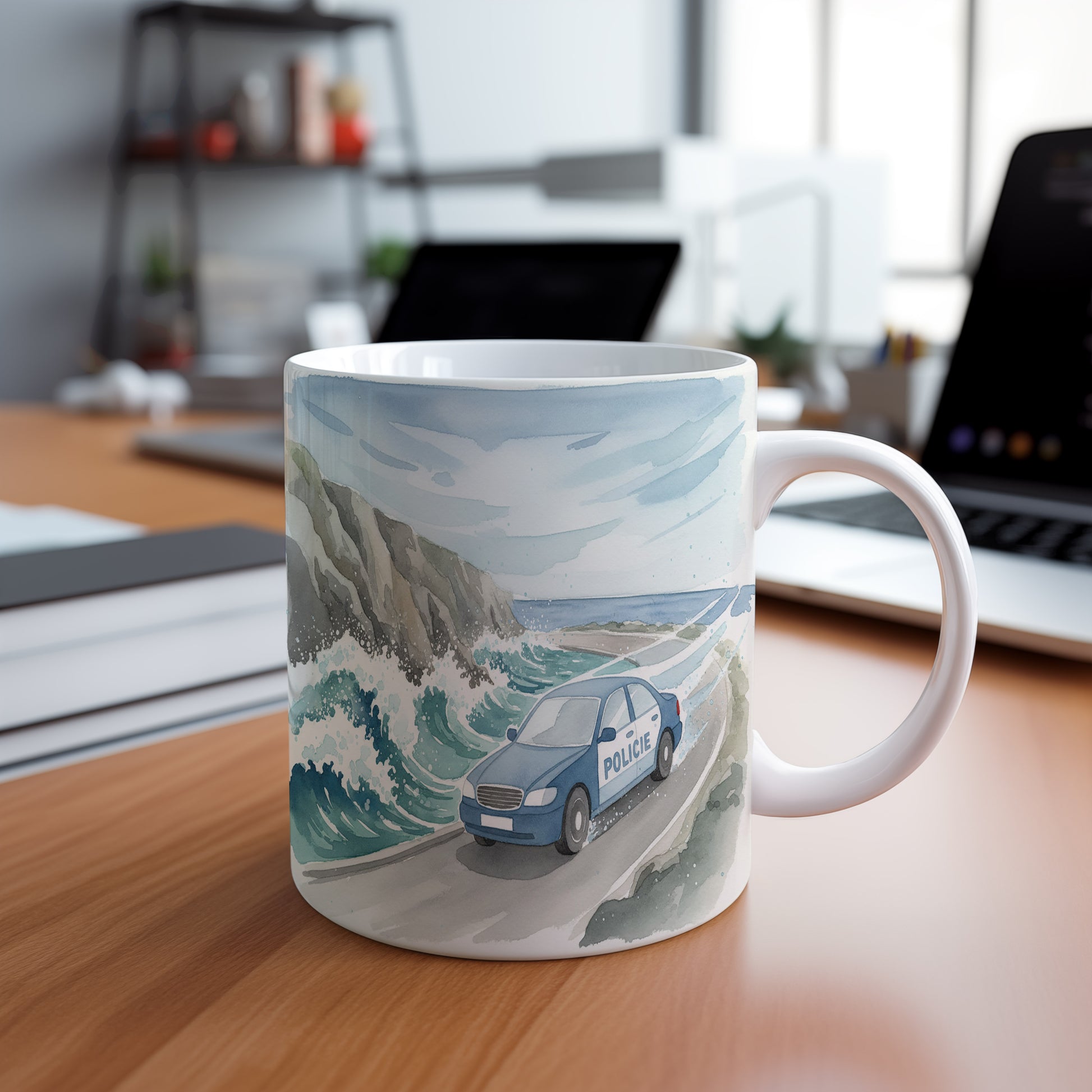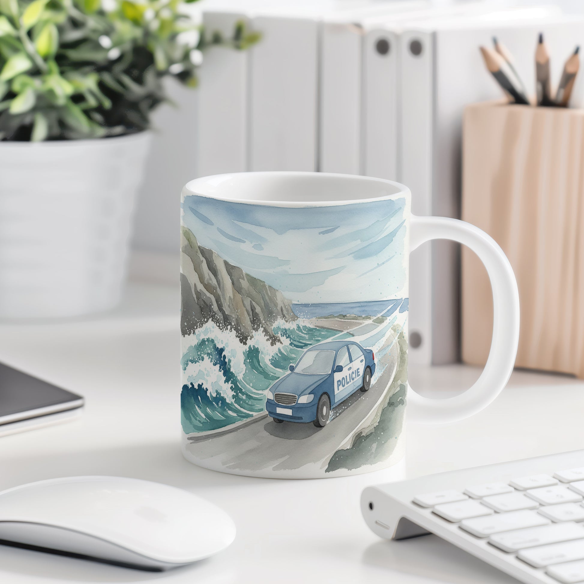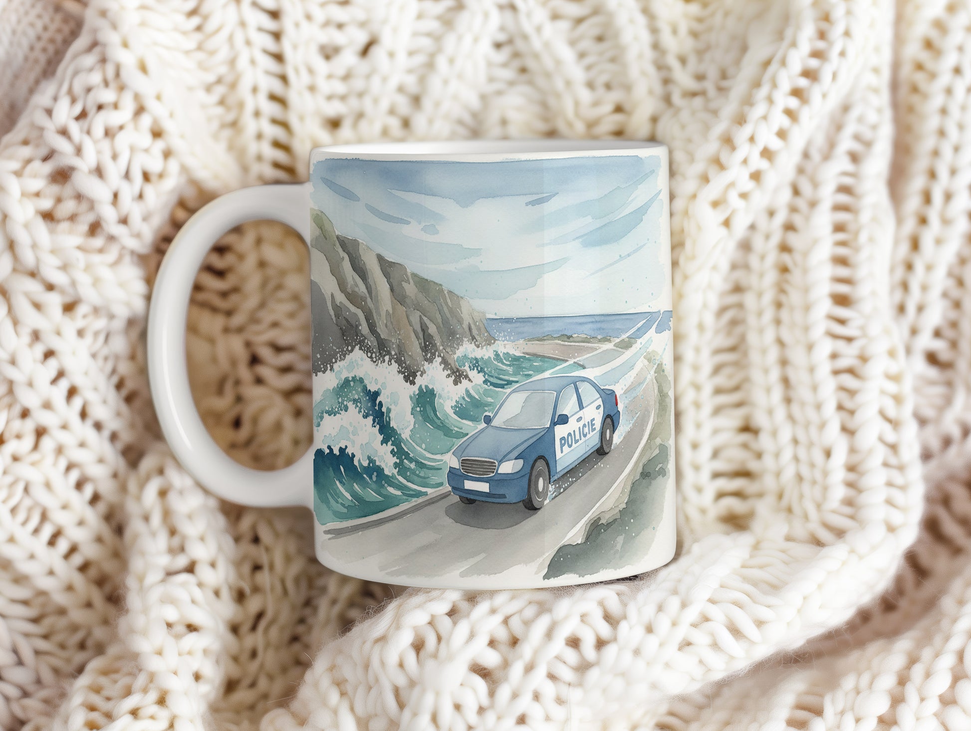 Elegantní hrnek s akvarelovým motivem policejního vozu na pobřežní silnici. Skvělý doplněk pro milovníky dobrodružství. Hrnek 330 ml – vhodný do myčky i mikrovlnky.