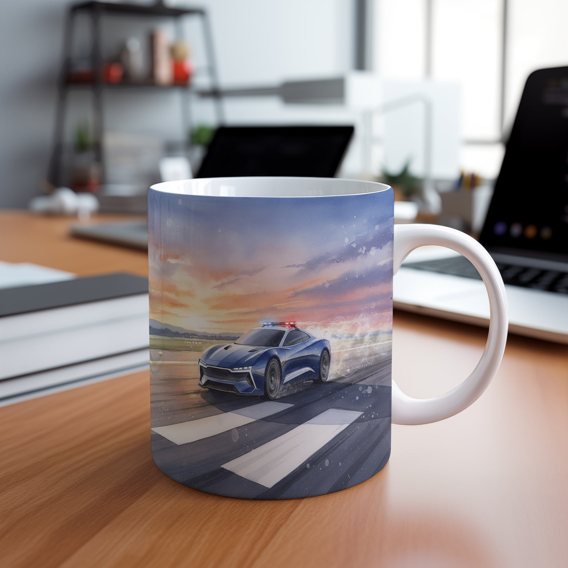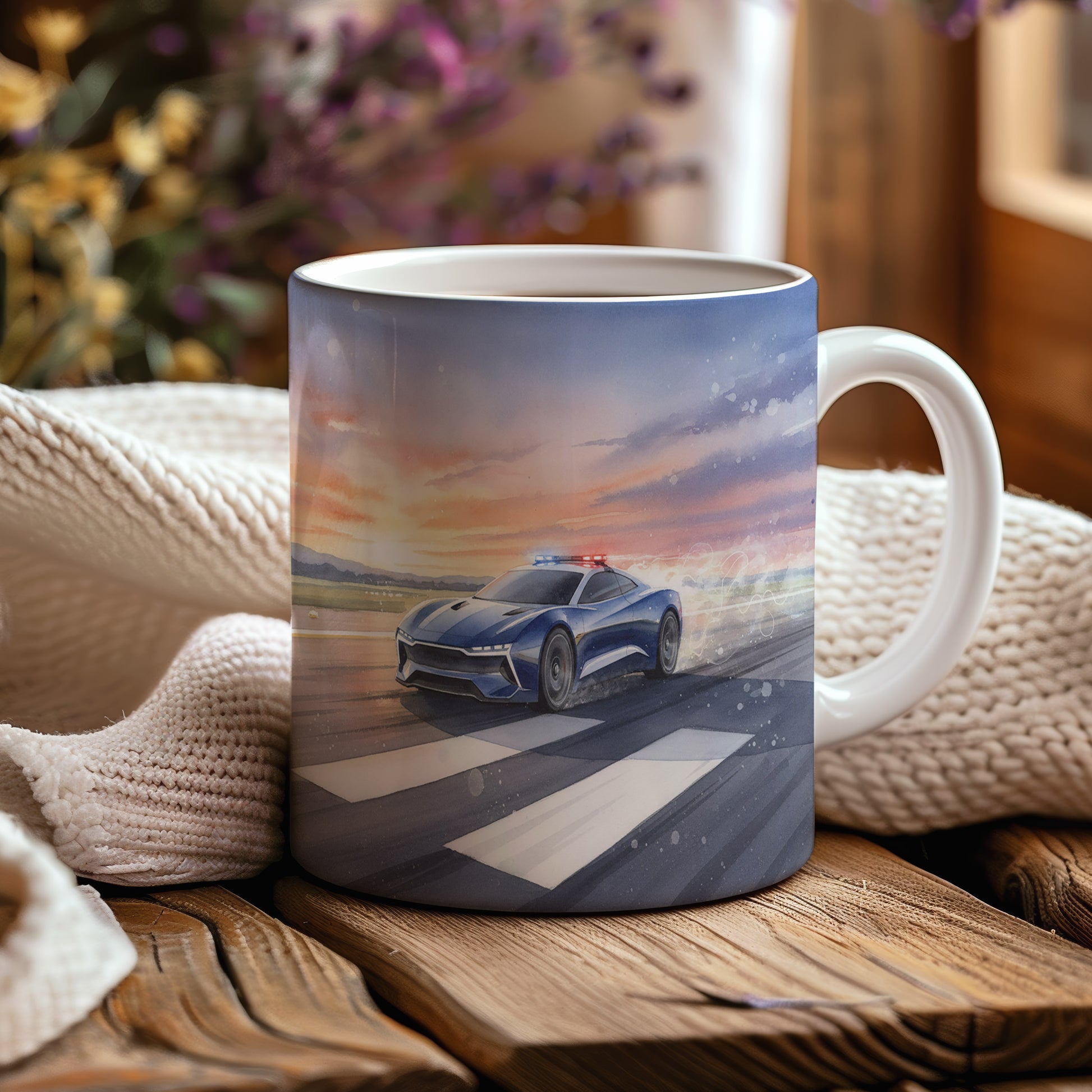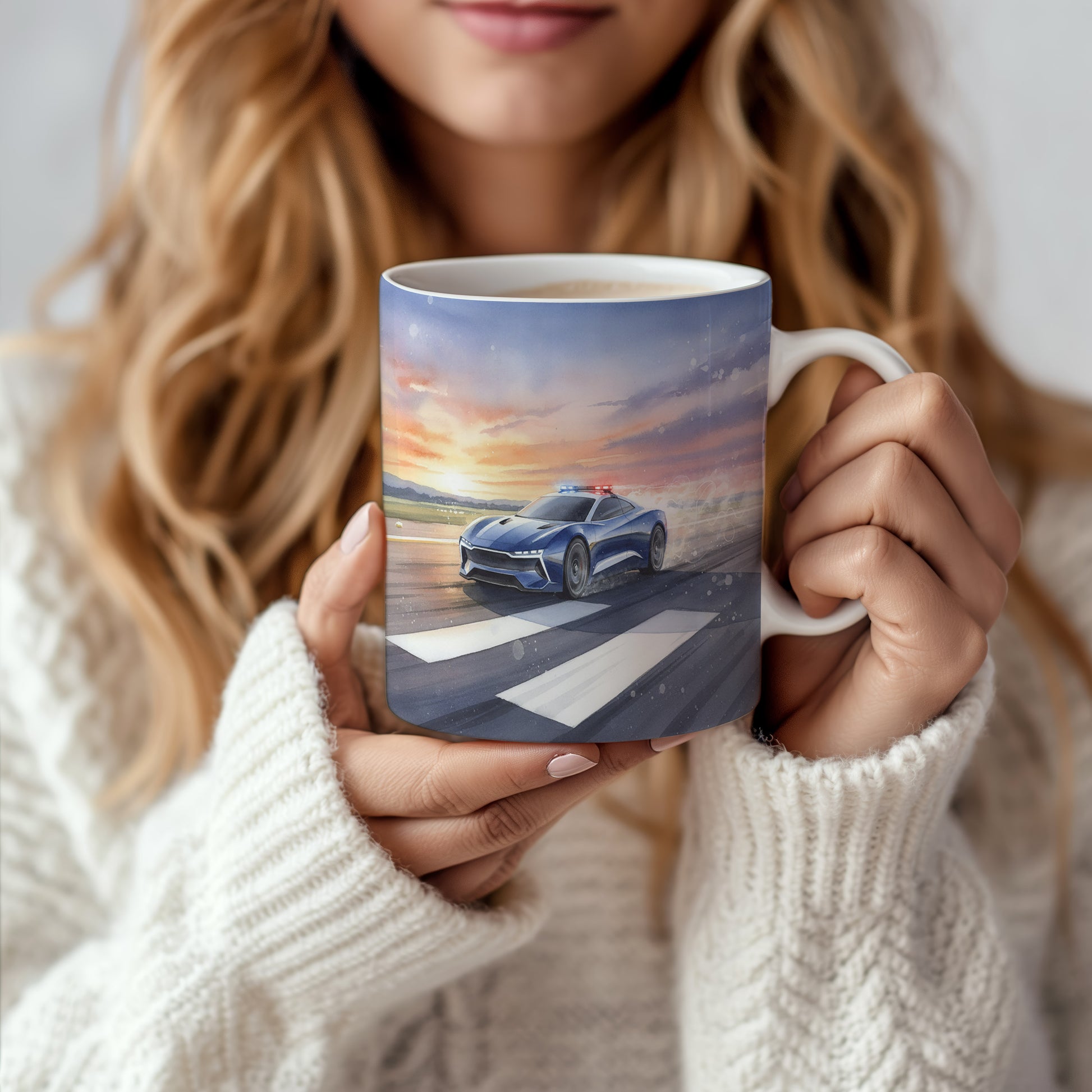 Objevte akvarelový motiv policejního auta svištícího po dráze za úsvitu. Ideální pro milovníky rychlosti a dramatických scén. Hrnek 330 ml – vhodný do myčky i mikrovlnky.