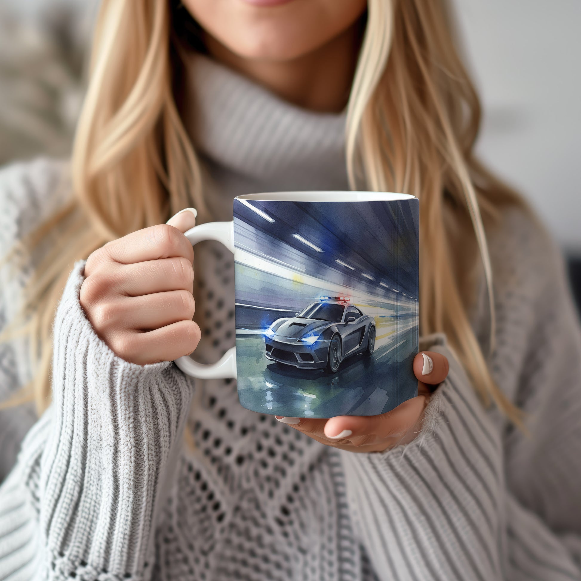 Objevte dynamiku a rychlost s hrnkem, který zobrazuje policejní superauto v akvarelovém stylu. Zářivé světla dodávají scéně napětí. Hrnek 330 ml – vhodný do myčky i mikrovlnky.