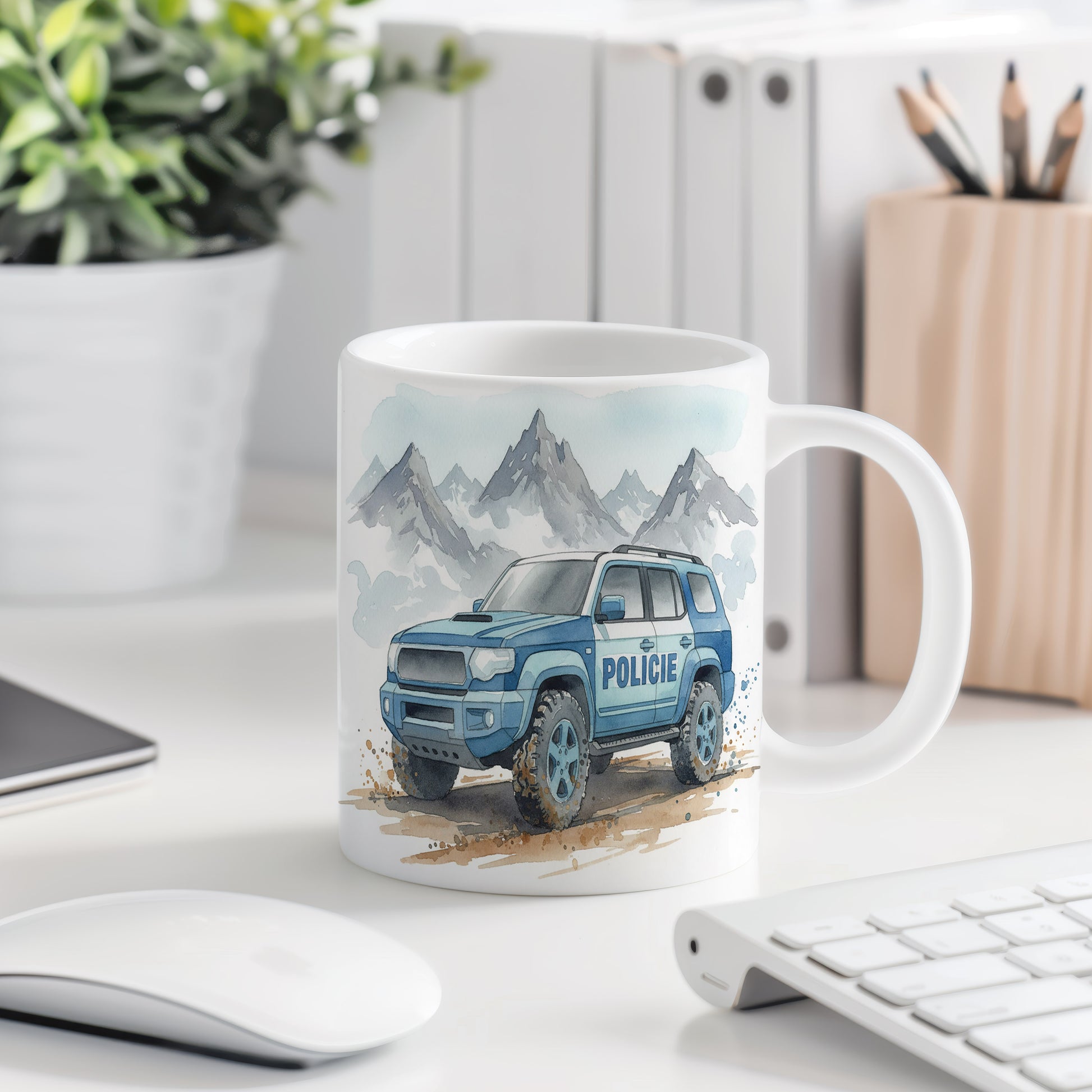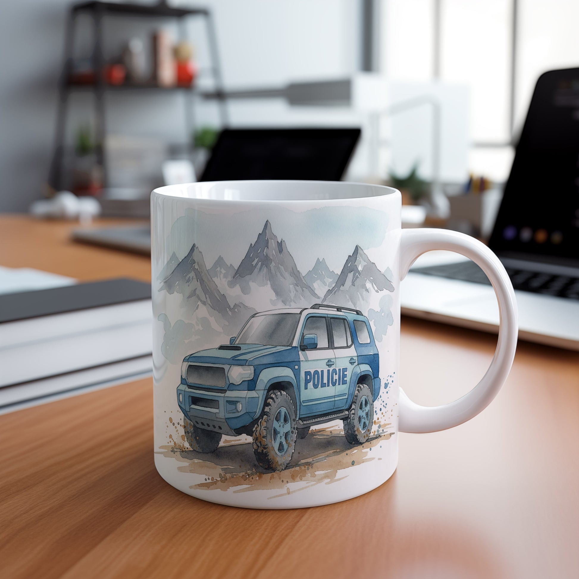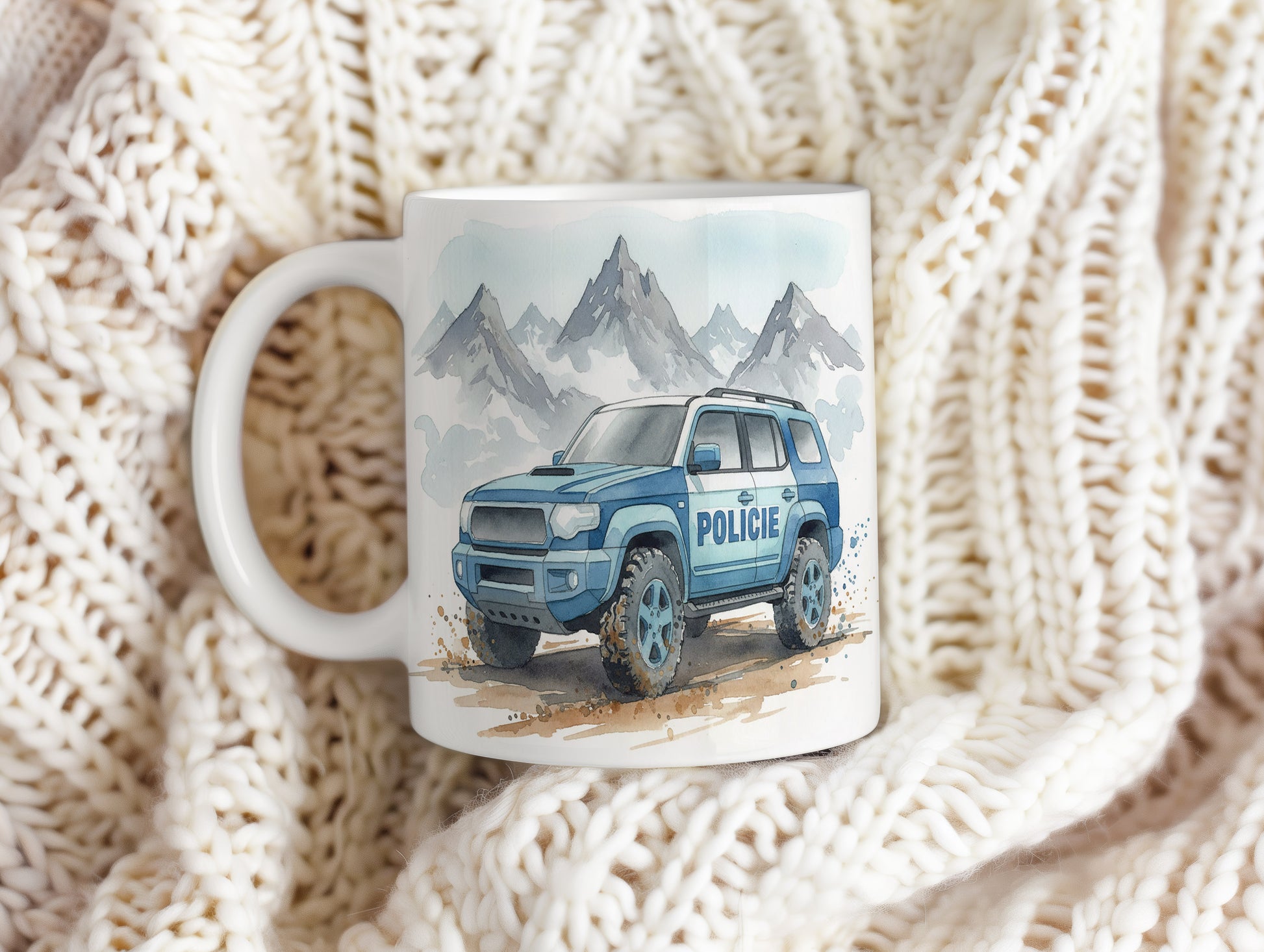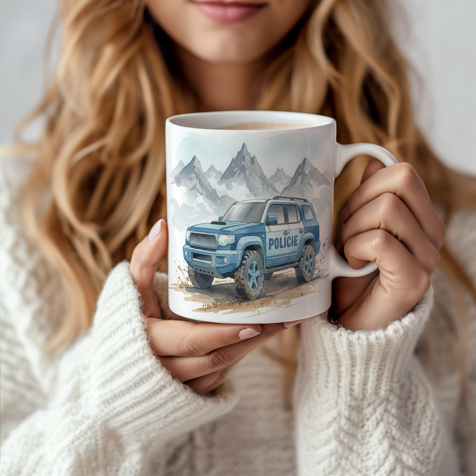 Objevte kouzlo akvarelu s hrnkem zdobeným policejním SUV na horských cestách. Ideální pro milovníky dobrodružství a elegance. Hrnek 330 ml – vhodný do myčky i mikrovlnky.