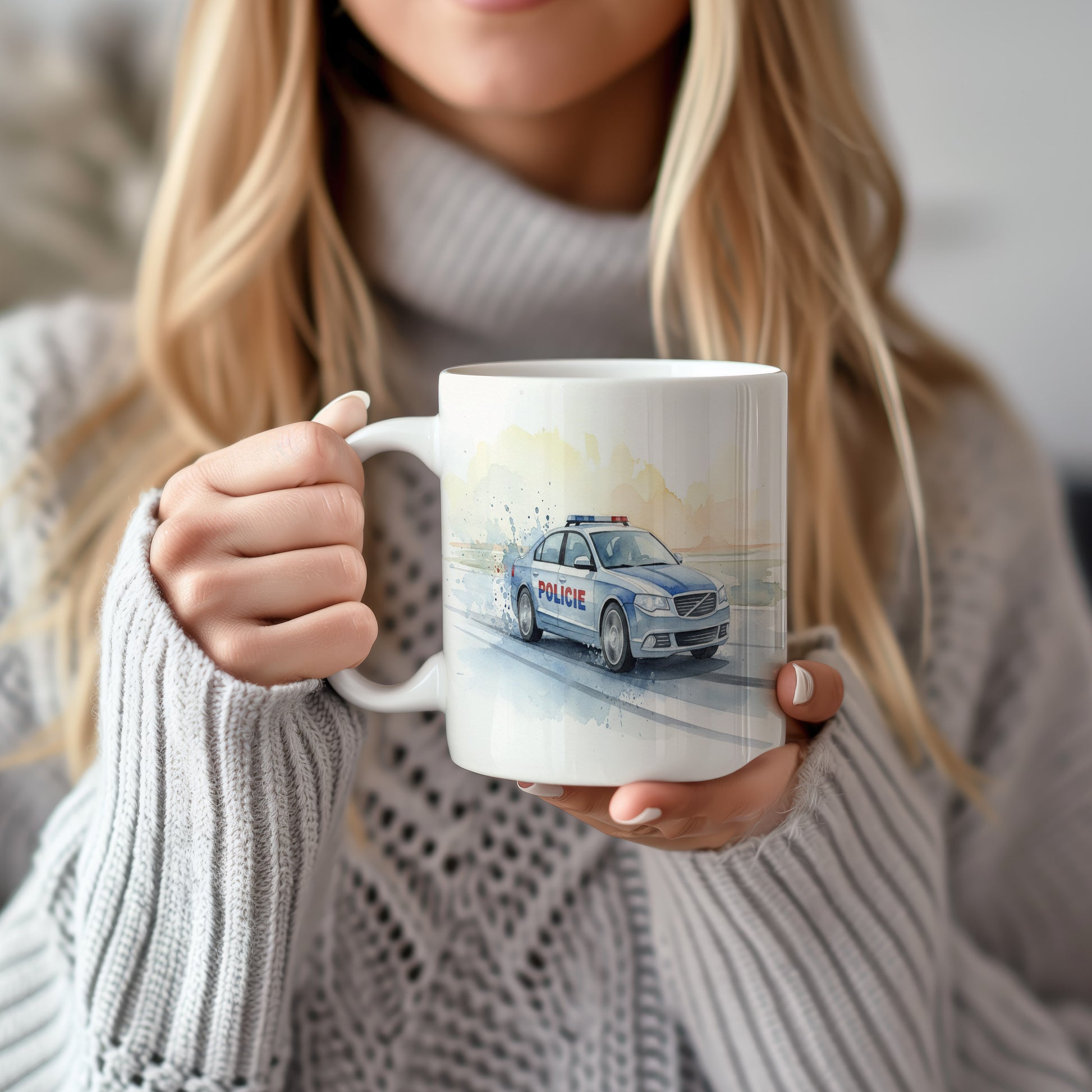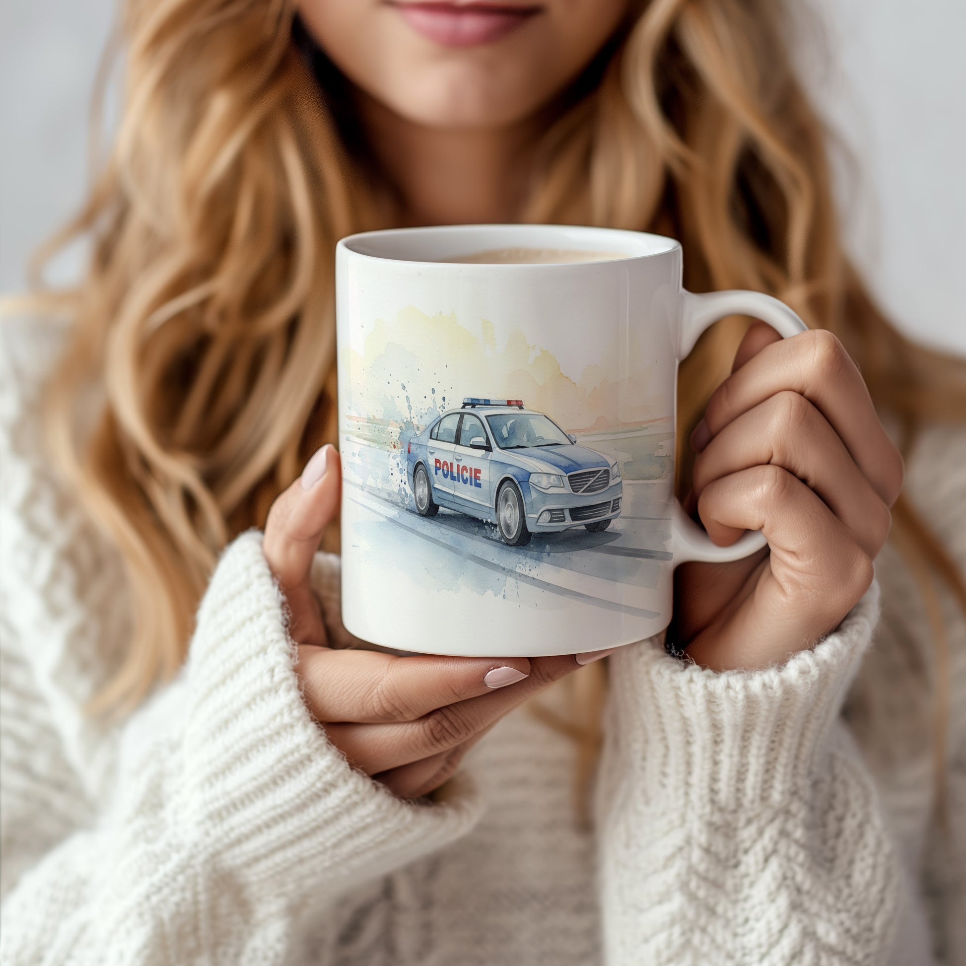 Hrnek s policejním vozem v akvarelu