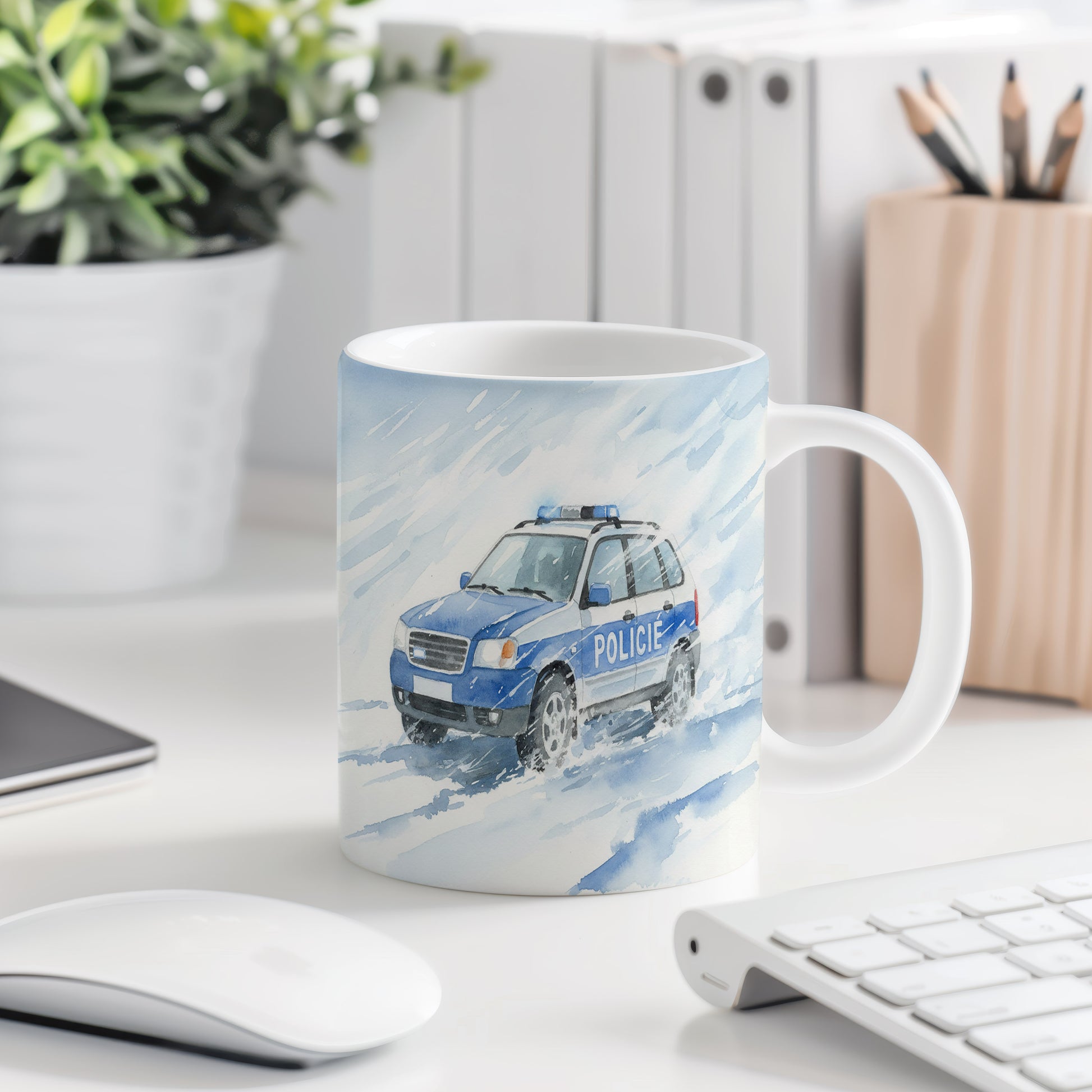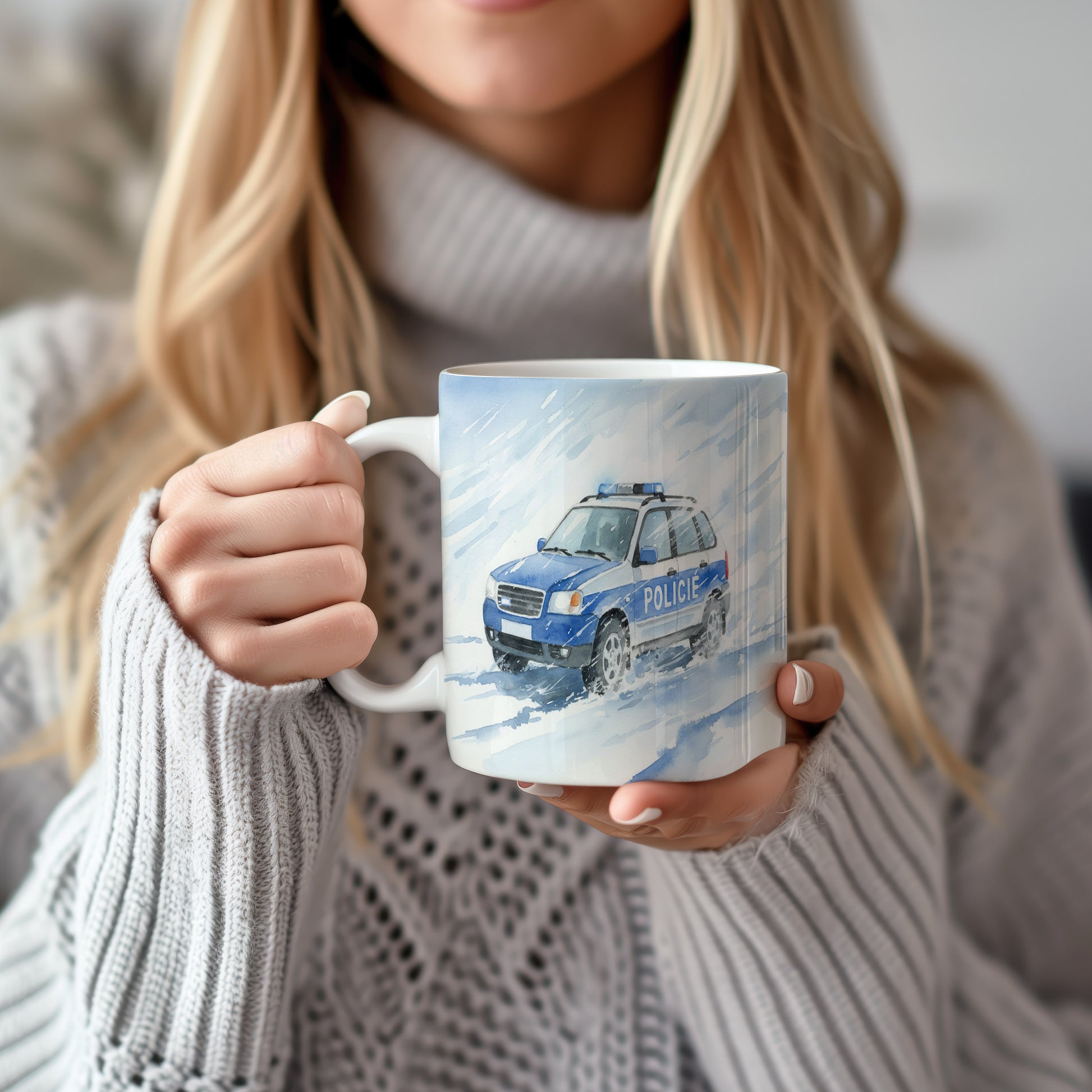 Akvarelový hrnek s dynamickým motivem policejního vozu projíždějícího sněhovou bouří. Ideální pro milovníky akce. Hrnek 330 ml – vhodný do myčky i mikrovlnky.