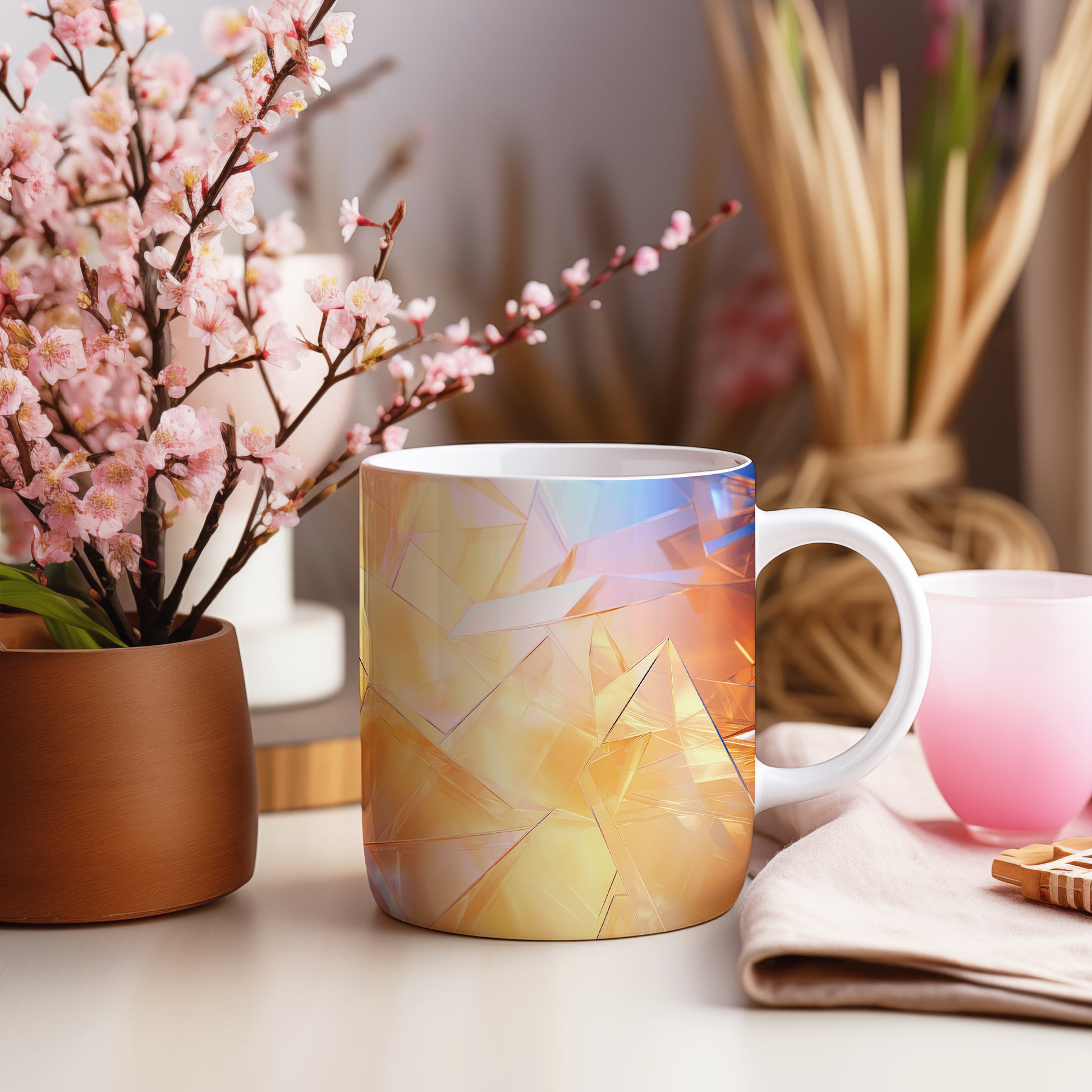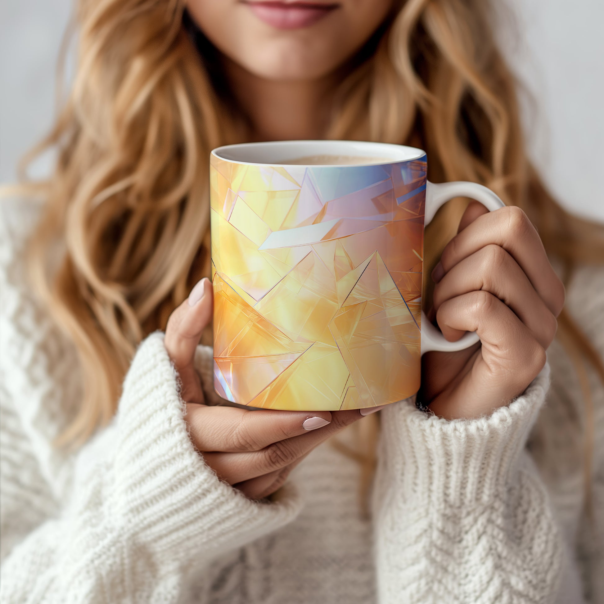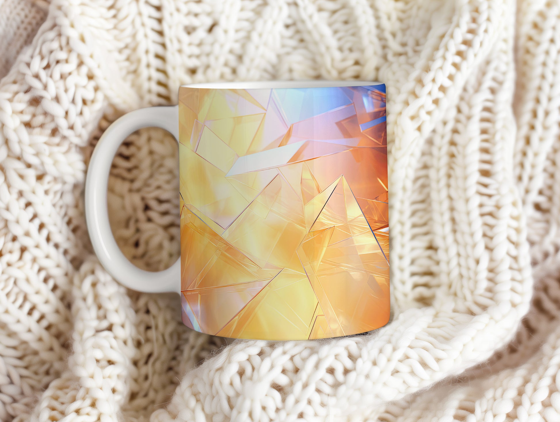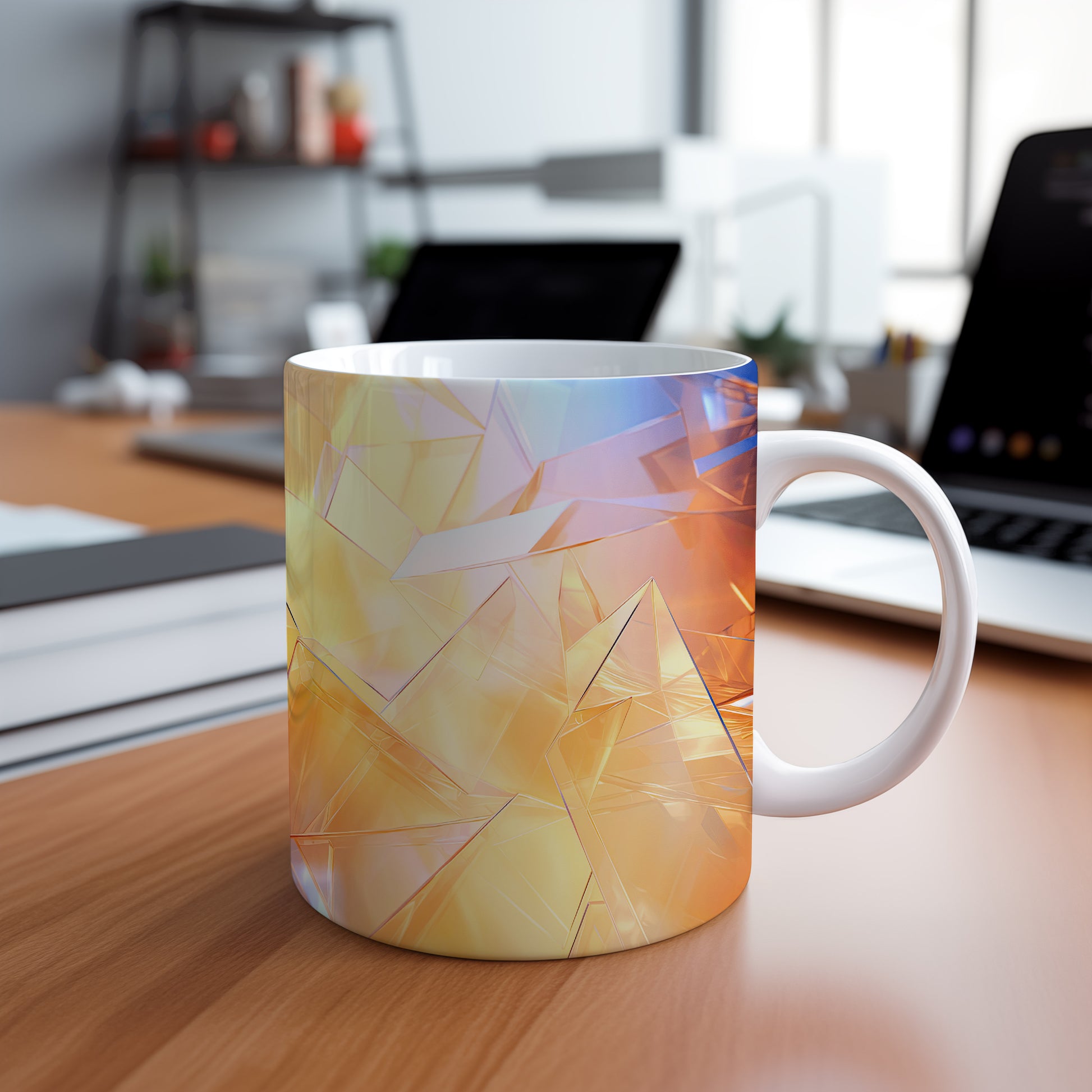 Hrnek s polygonální mozaikou v oranžových a modrých tónech