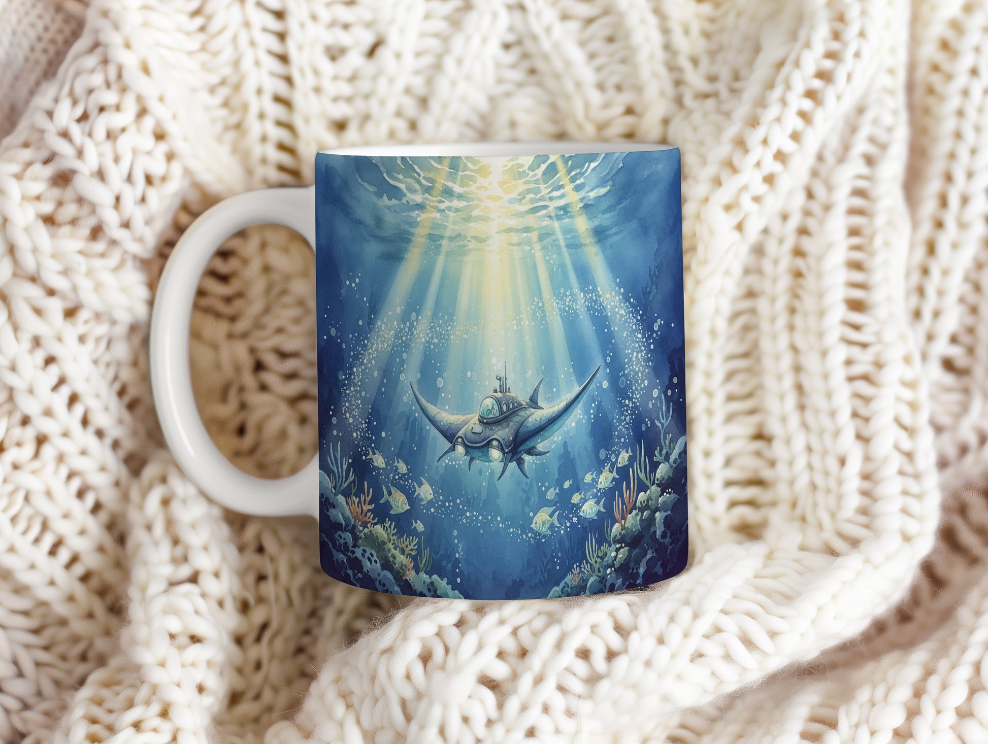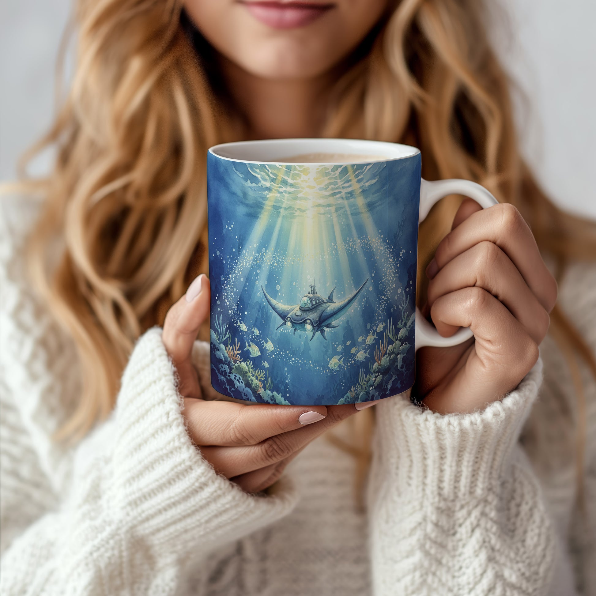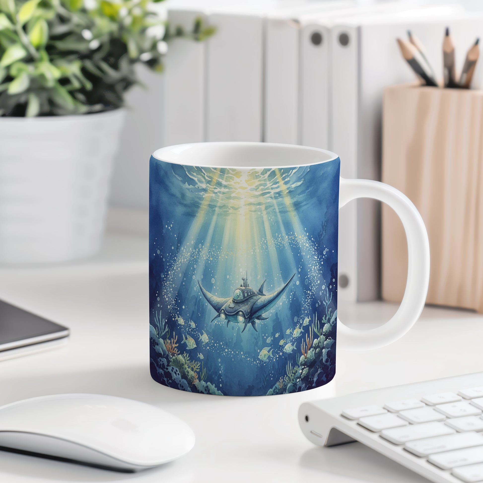 Objevte podmořský svět s tímto hrnkem s akvarelem futuristické ponorky, která se vznáší mezi korály. Hrnek 330 ml – vhodný do myčky i mikrovlnky.