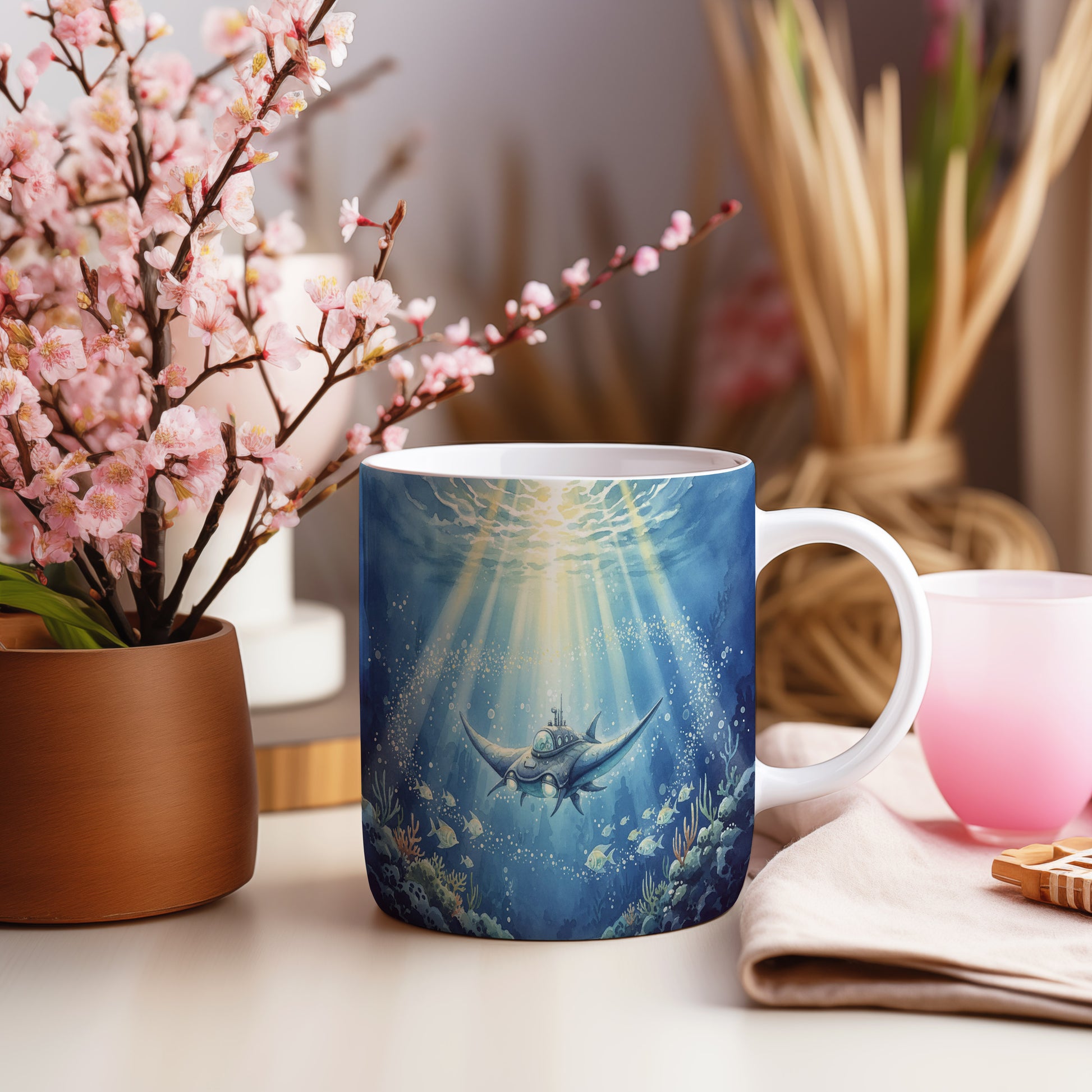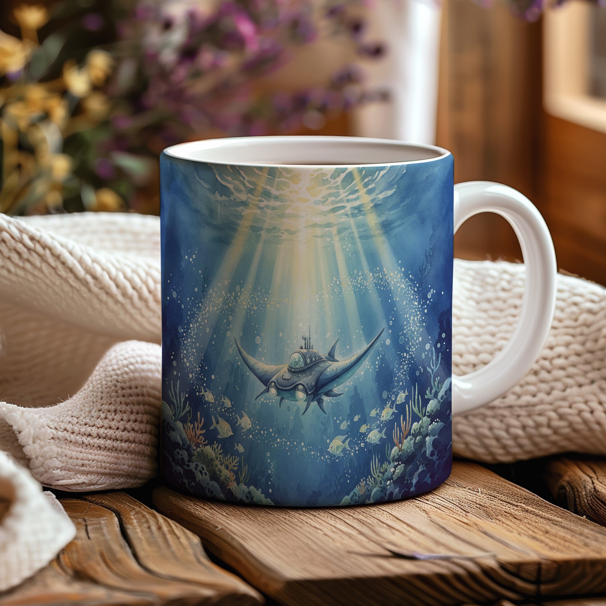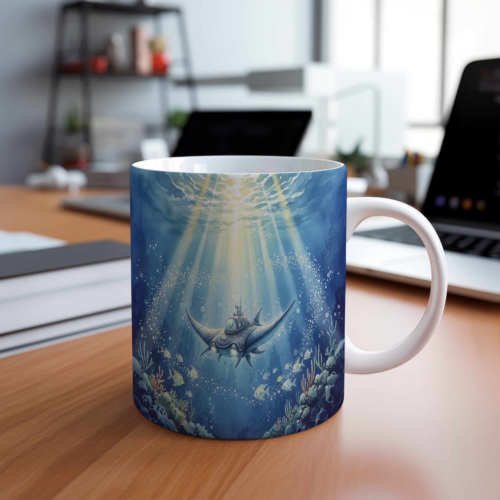 Objevte podmořský svět s tímto hrnkem s akvarelem futuristické ponorky, která se vznáší mezi korály. Hrnek 330 ml – vhodný do myčky i mikrovlnky.