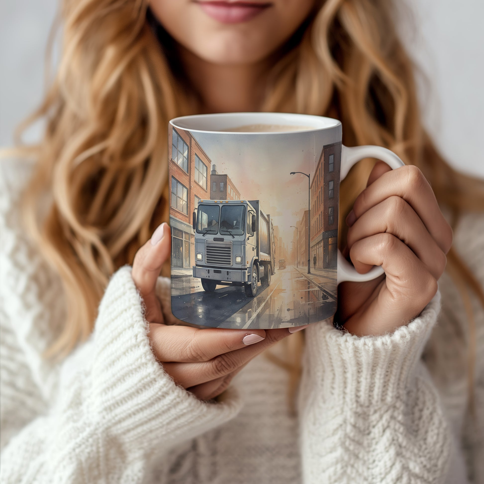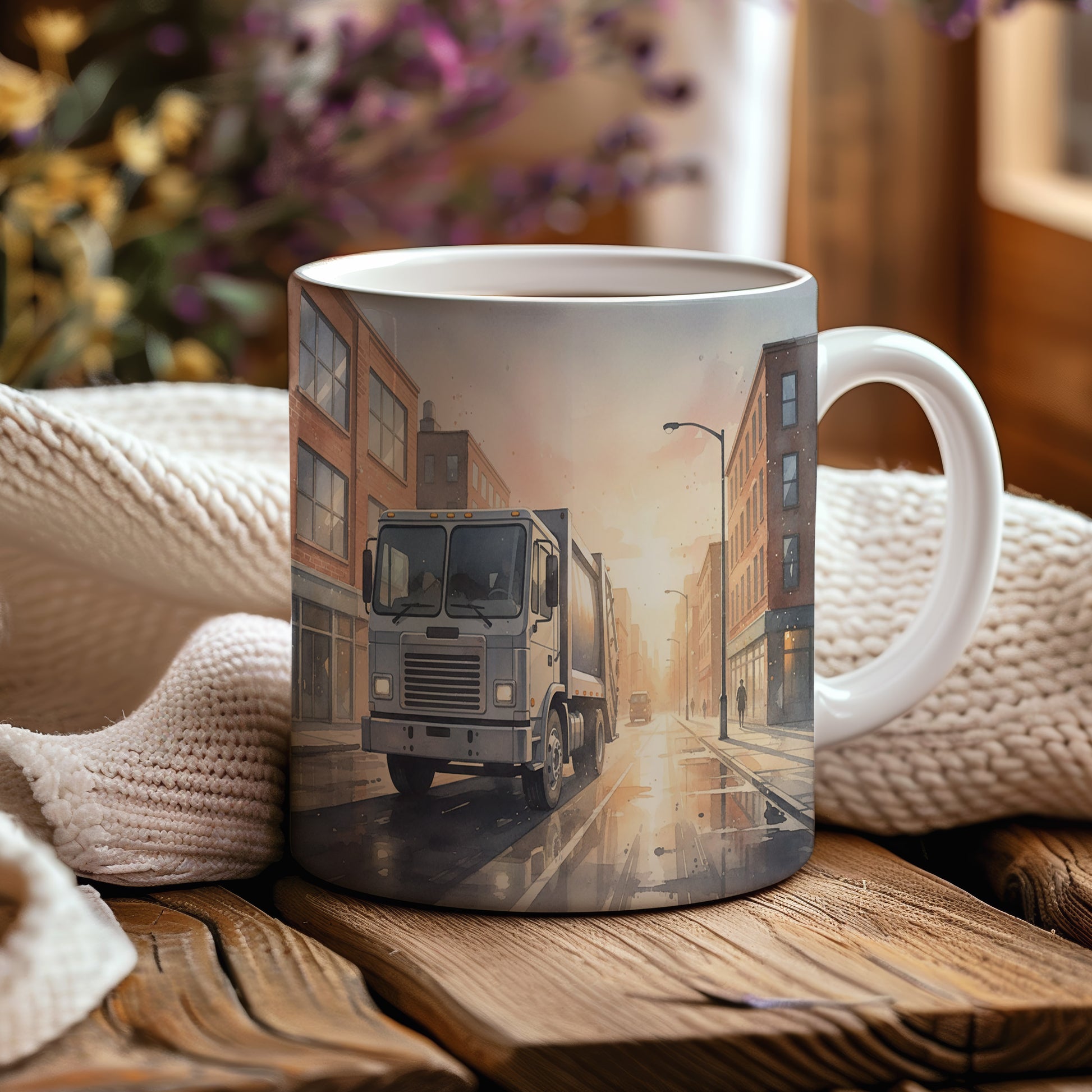 Objevte kouzlo města s akvarelovým motivem popelářského vozu projíždějícího ulicemi při západu slunce. Hrnek 330 ml – vhodný do myčky i mikrovlnky.