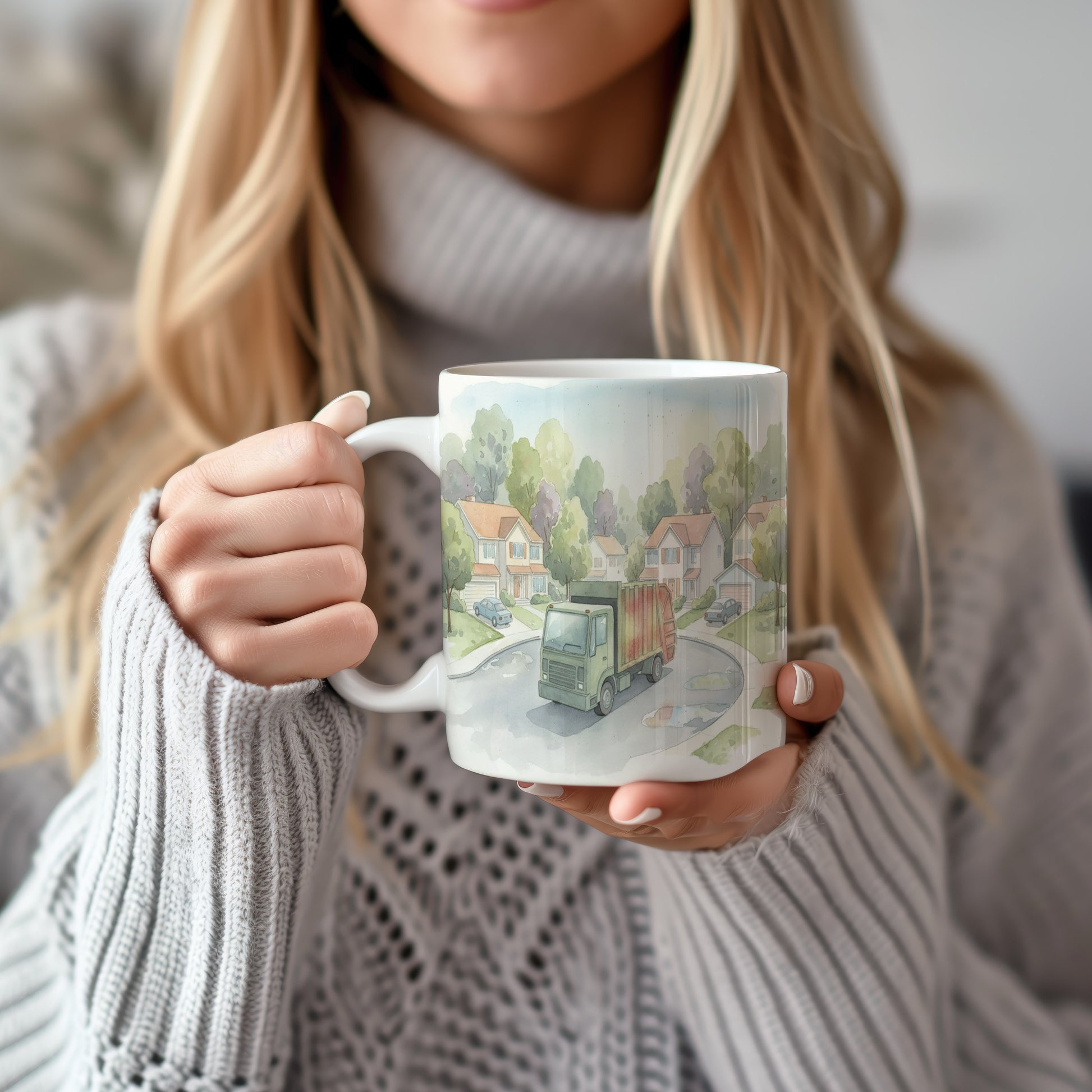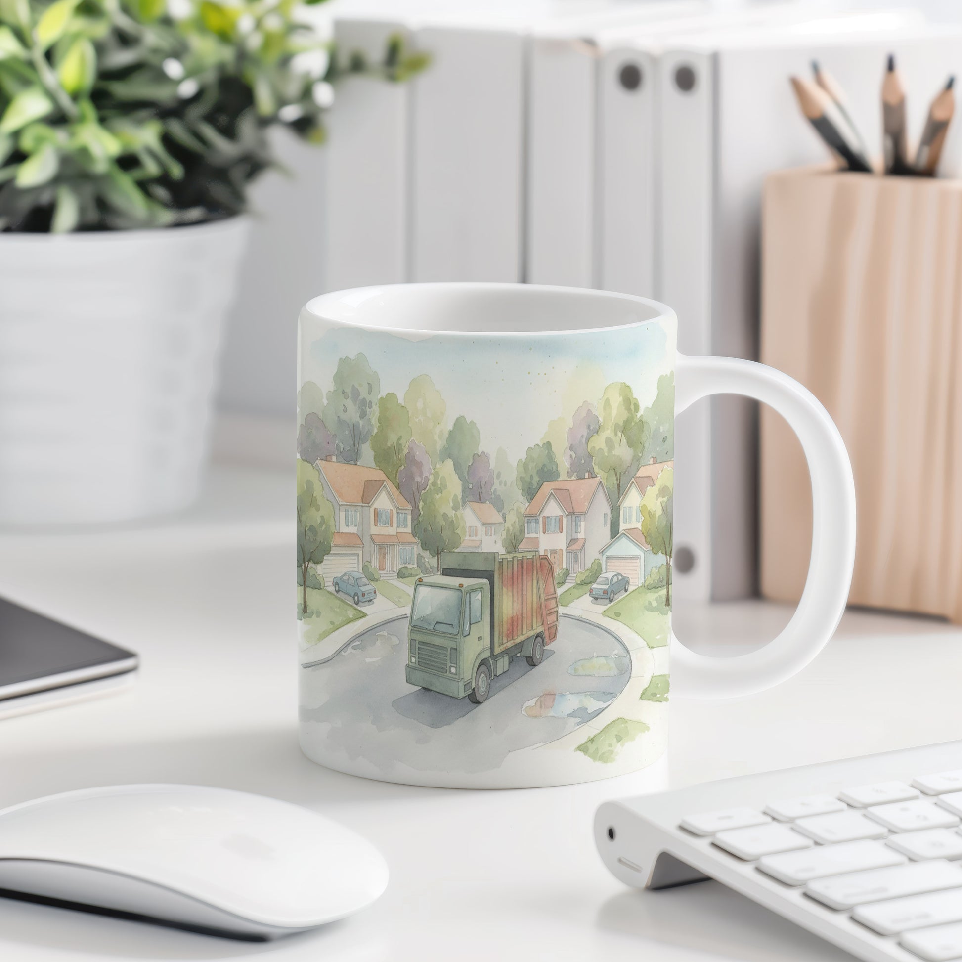 Akvarelový motiv popelářského vozu projíždějícího klidnou předměstskou ulicí. Jemné barvy dodávají scéně nostalgický nádech. Hrnek 330 ml – vhodný do myčky i mikrovlnky.