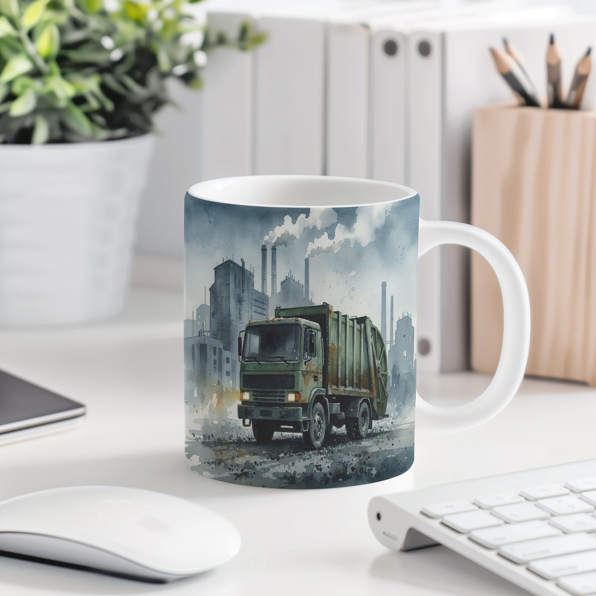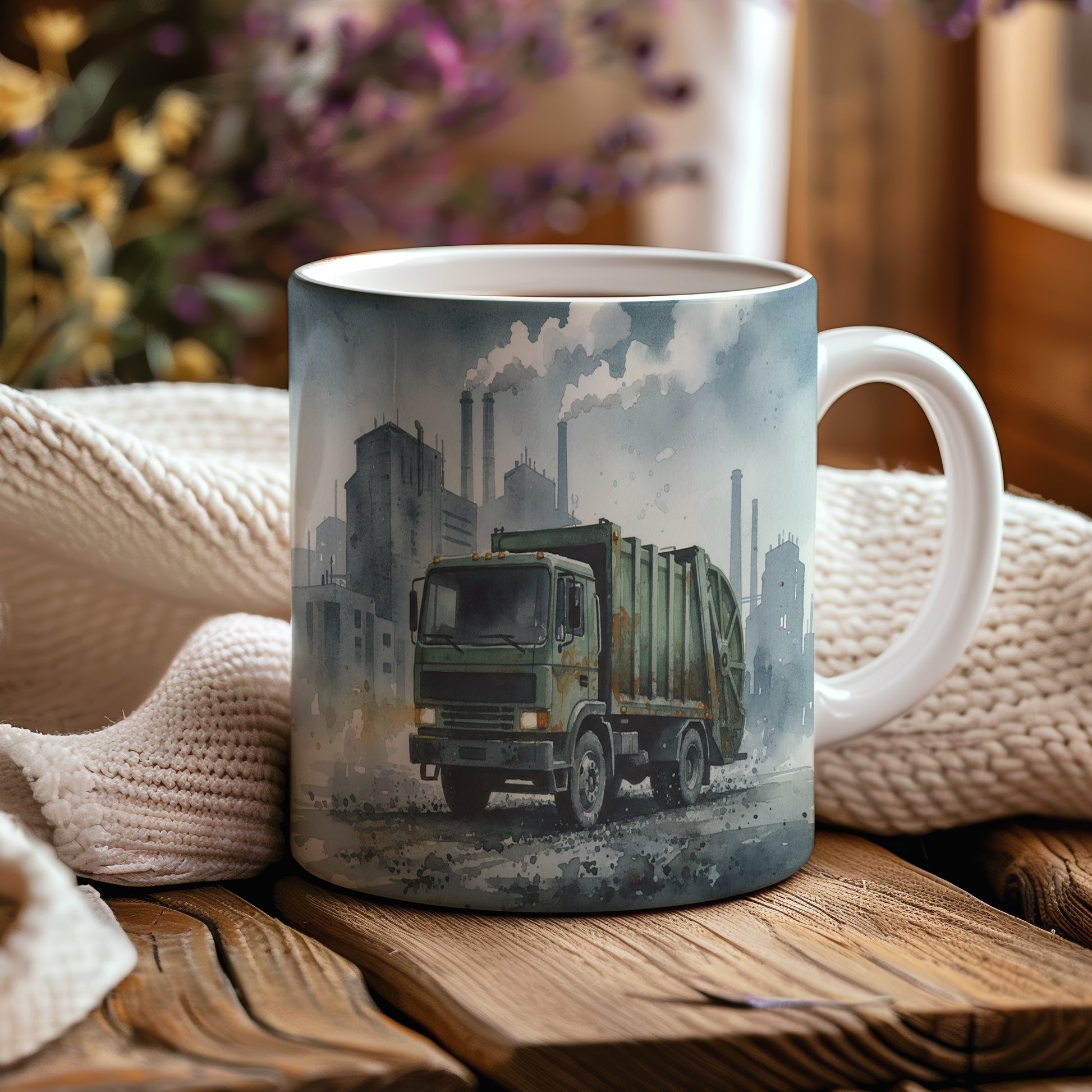 Objevte kouzlo městského života s tímto hrnkem, který zobrazuje popelářský vůz v průmyslové zóně. Akvarelový motiv dodává scéně živost. Hrnek 330 ml – vhodný do myčky i mikrovlnky.
