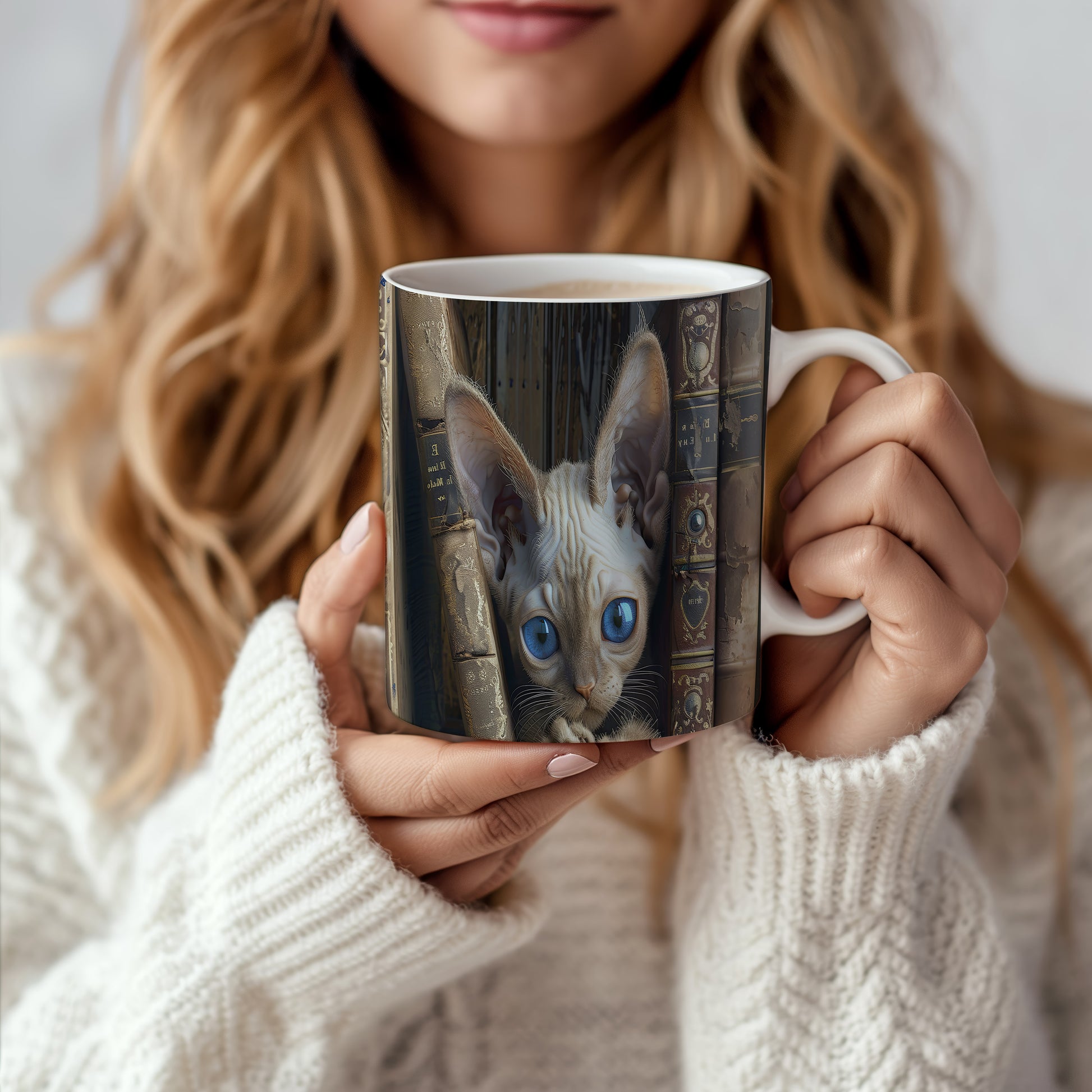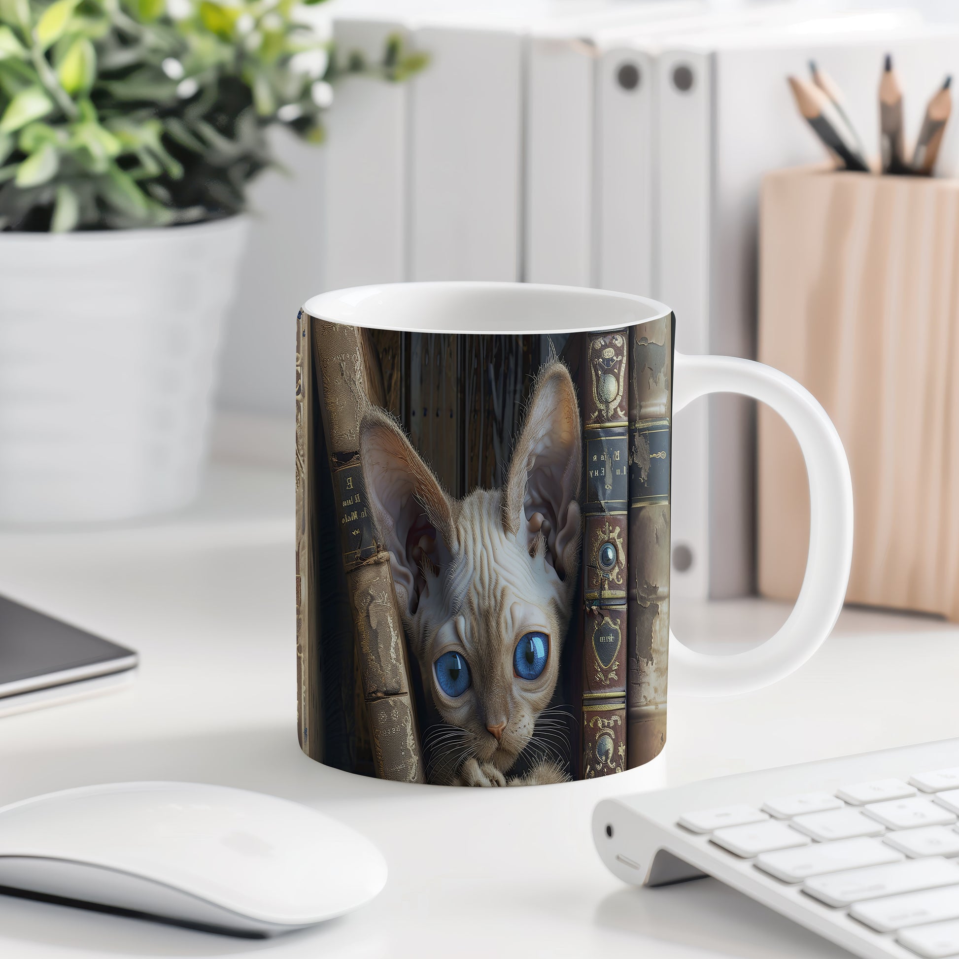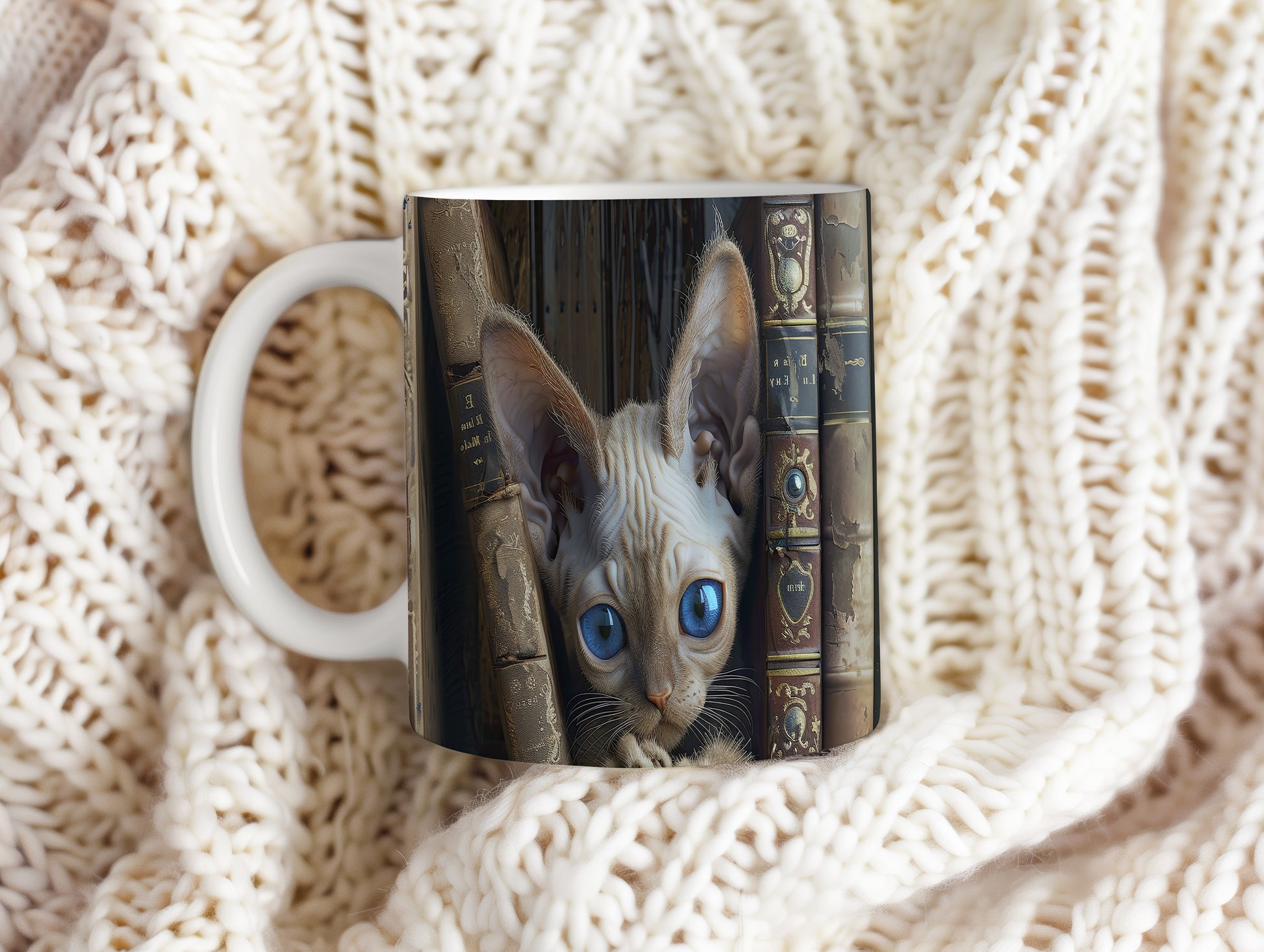 Tento hrnek zobrazuje detailní portrét kočky, která se ukrývá mezi starými knihami. Je ideální pro milovníky koček a knih, skvělý tip na dárek pro každého knihomola. Materiál: keramika. Objem: 330 ml. Vhodné do myčky i mikrovlnky. Používání tohoto hrnku přináší radost z každého doušku a potěšení z oblíbeného motivu.