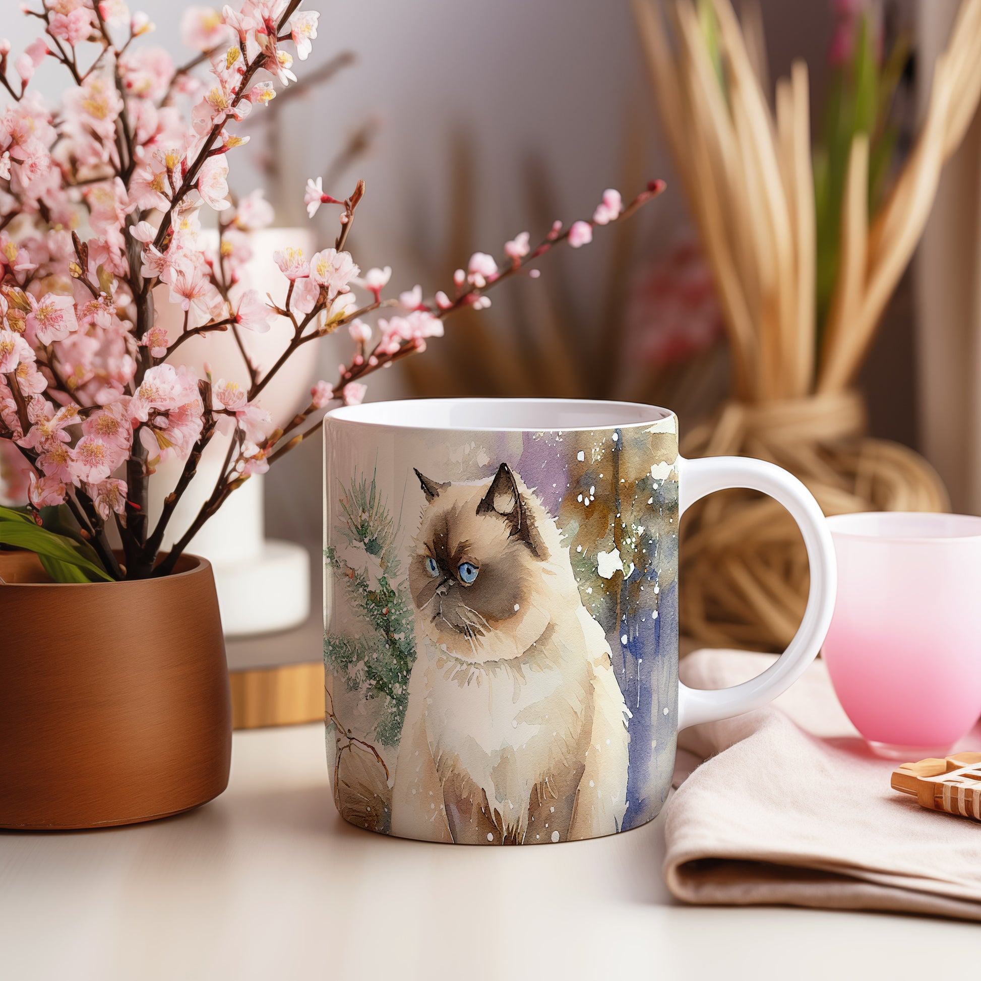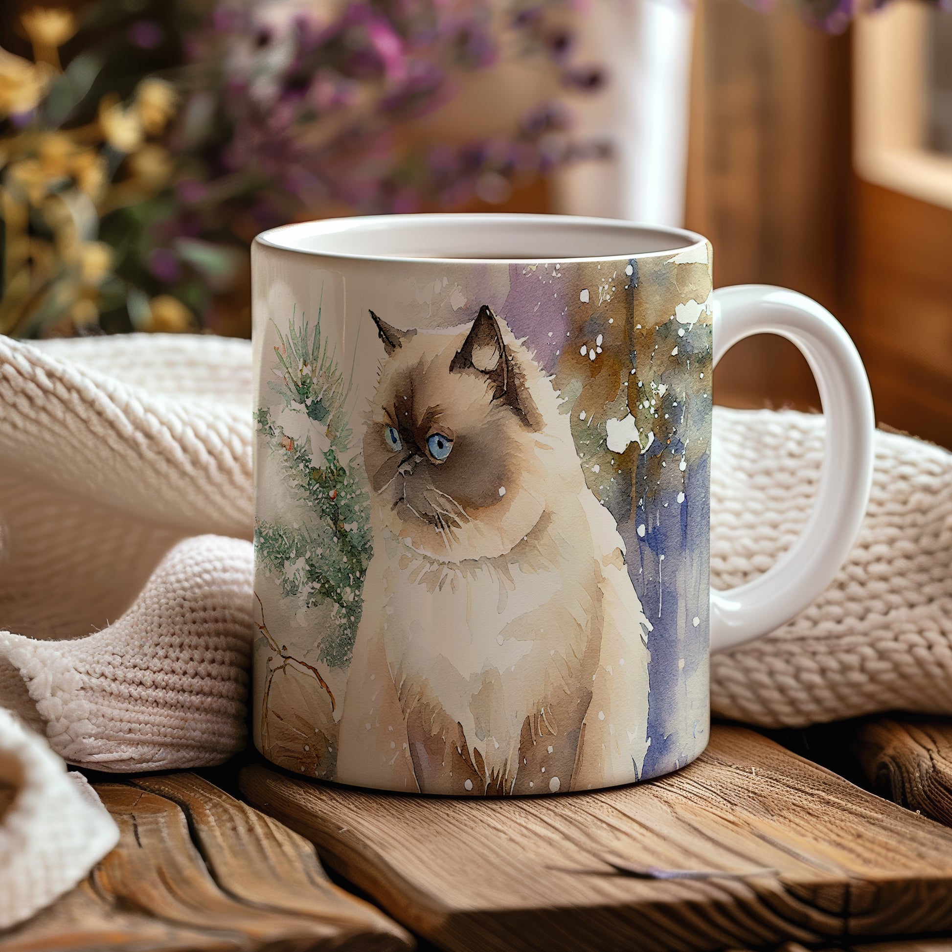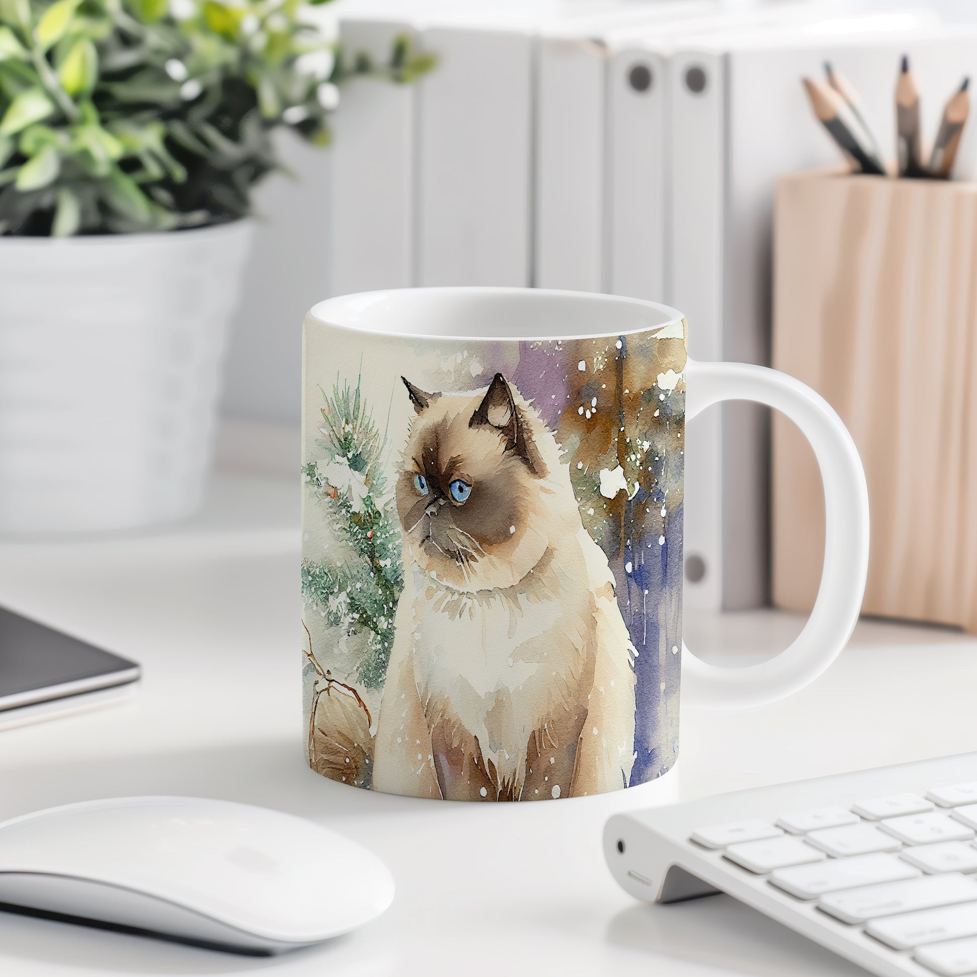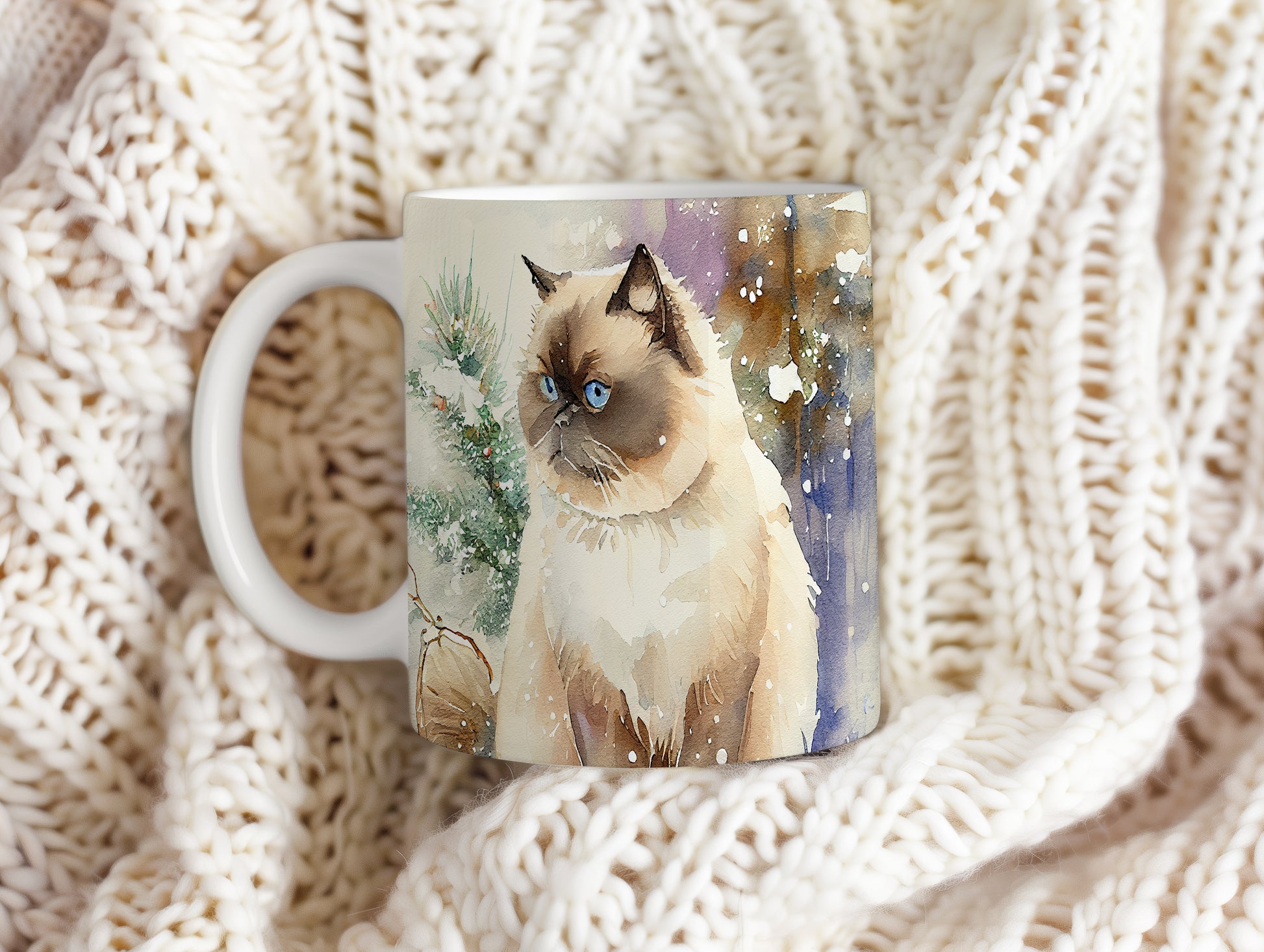 Hrnek s portrétem kočky v zasněžené krajině
