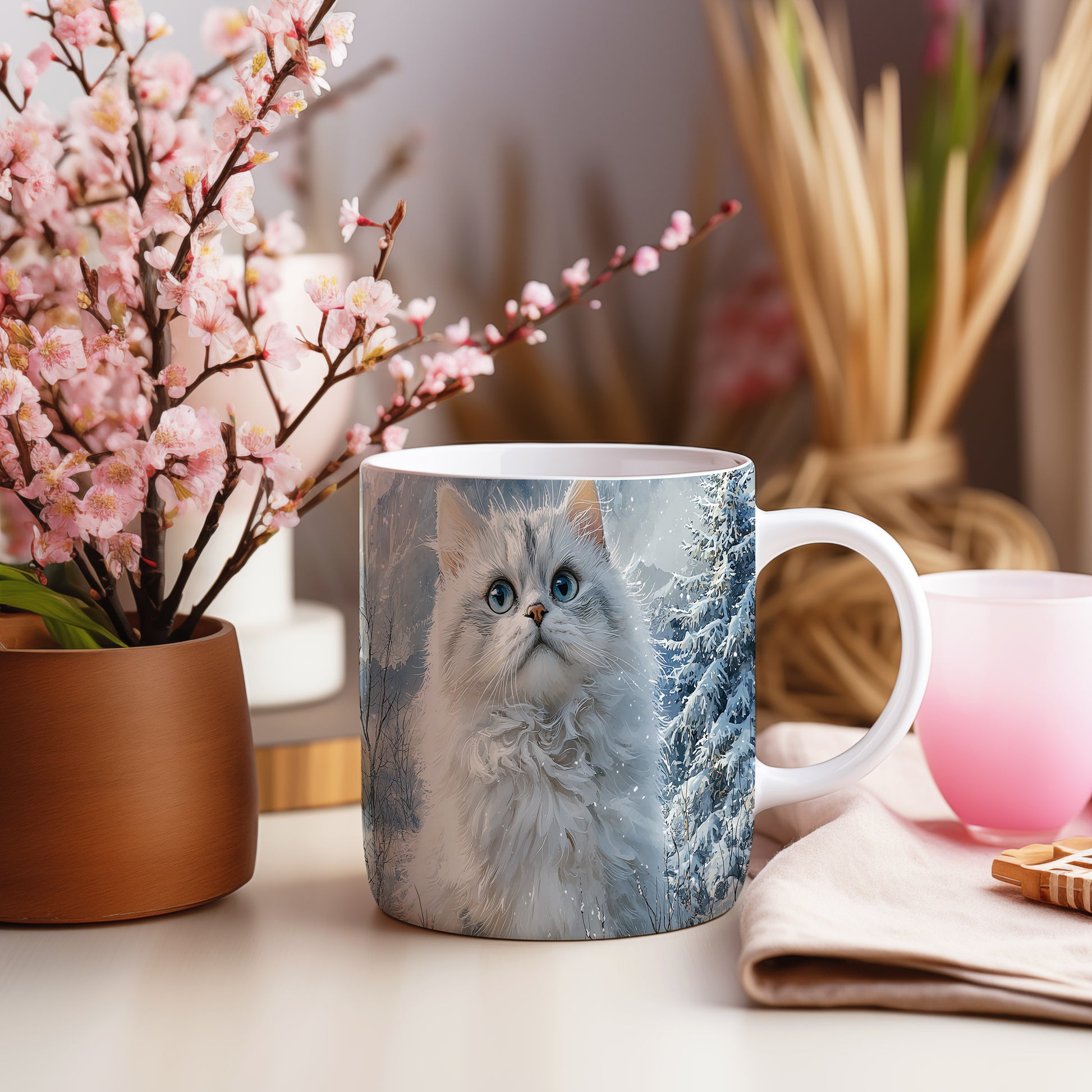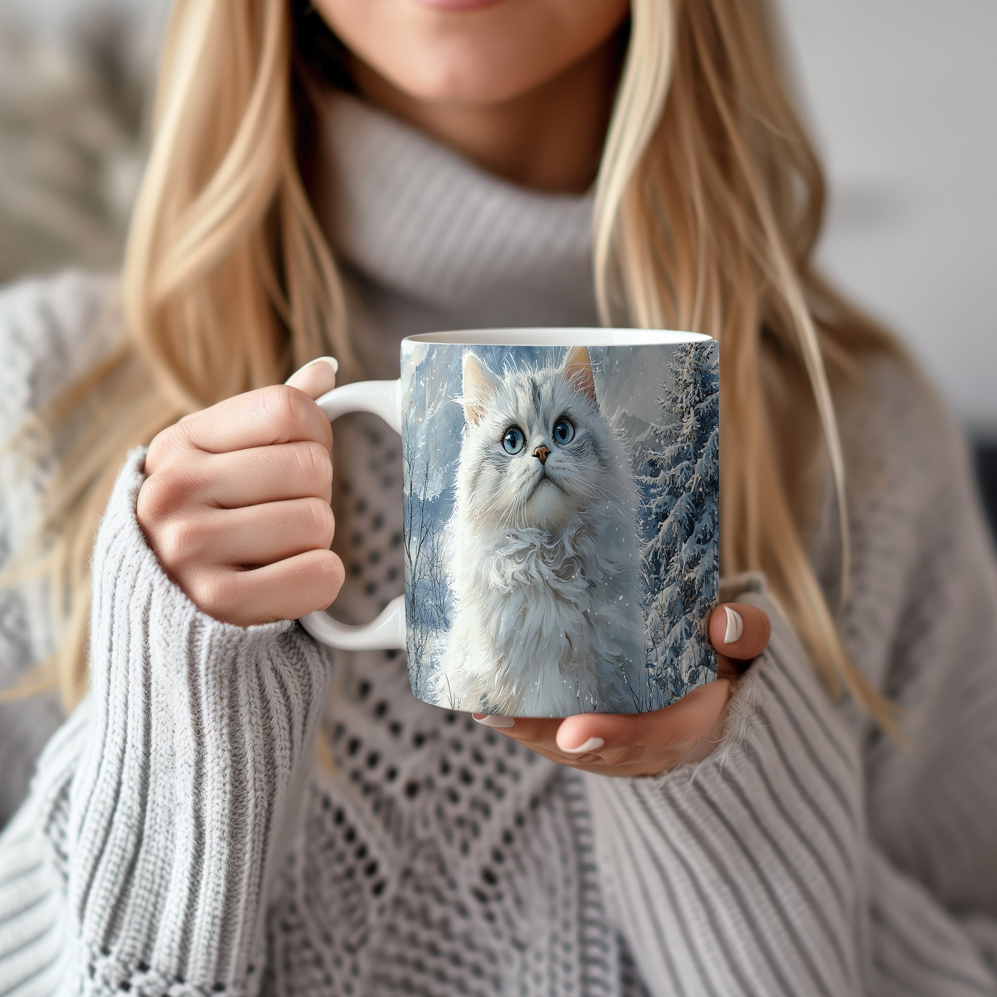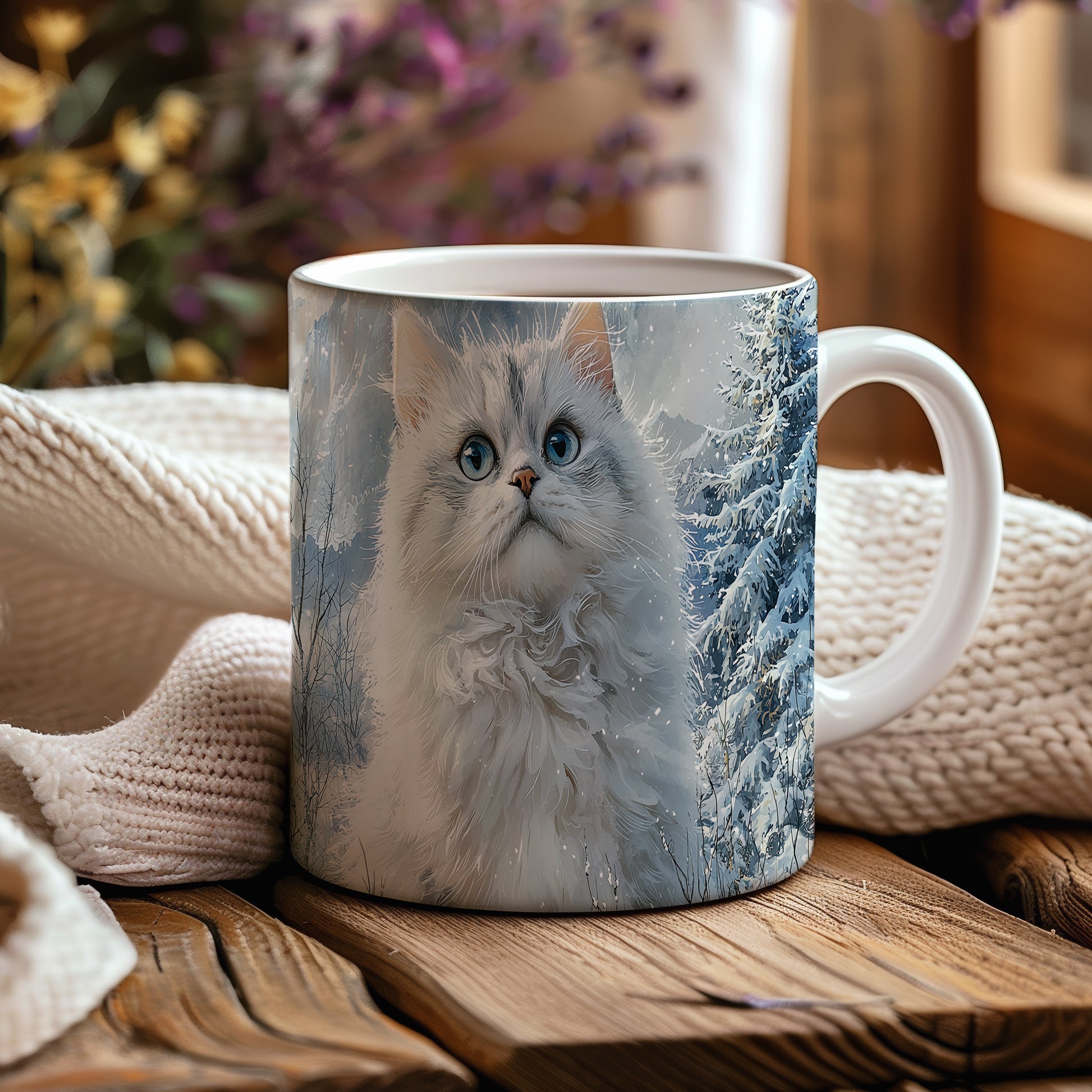 Tento hrnek je zdoben realistickým portrétem kočky s modrýma očima. Je ideální pro milovníky koček a skvělým dárkem pro každého, kdo ocení krásu zimní přírody. Materiál: keramika. Objem: 330 ml. Vhodné do myčky i mikrovlnky. Díky svému designu přináší do každodenního pití špetku elegance a radosti.
