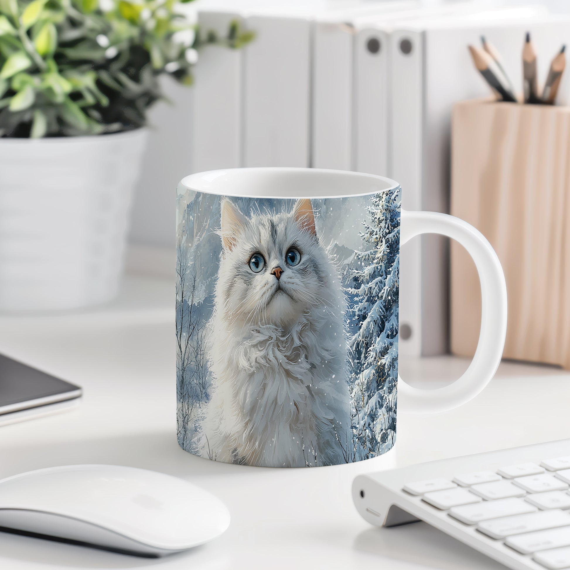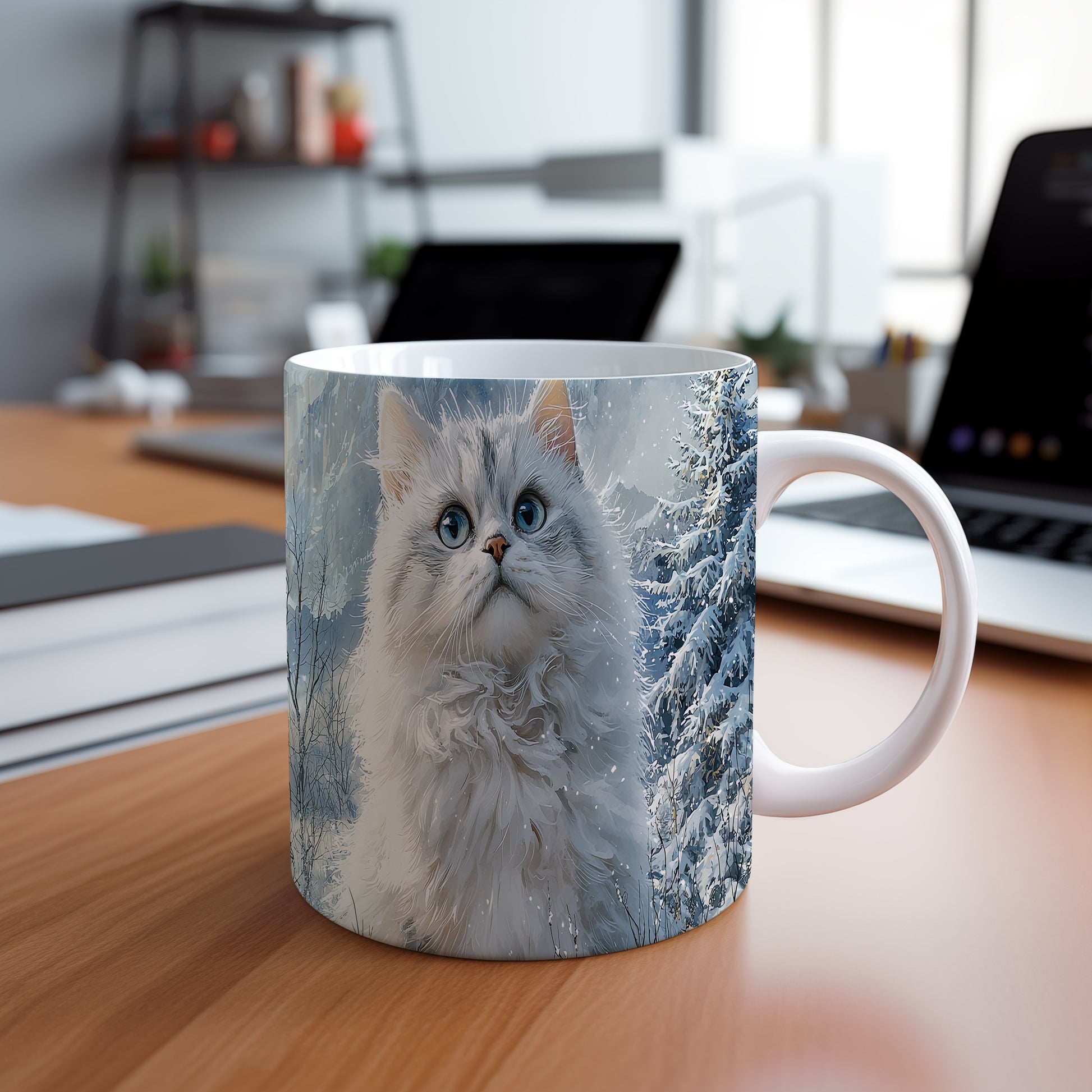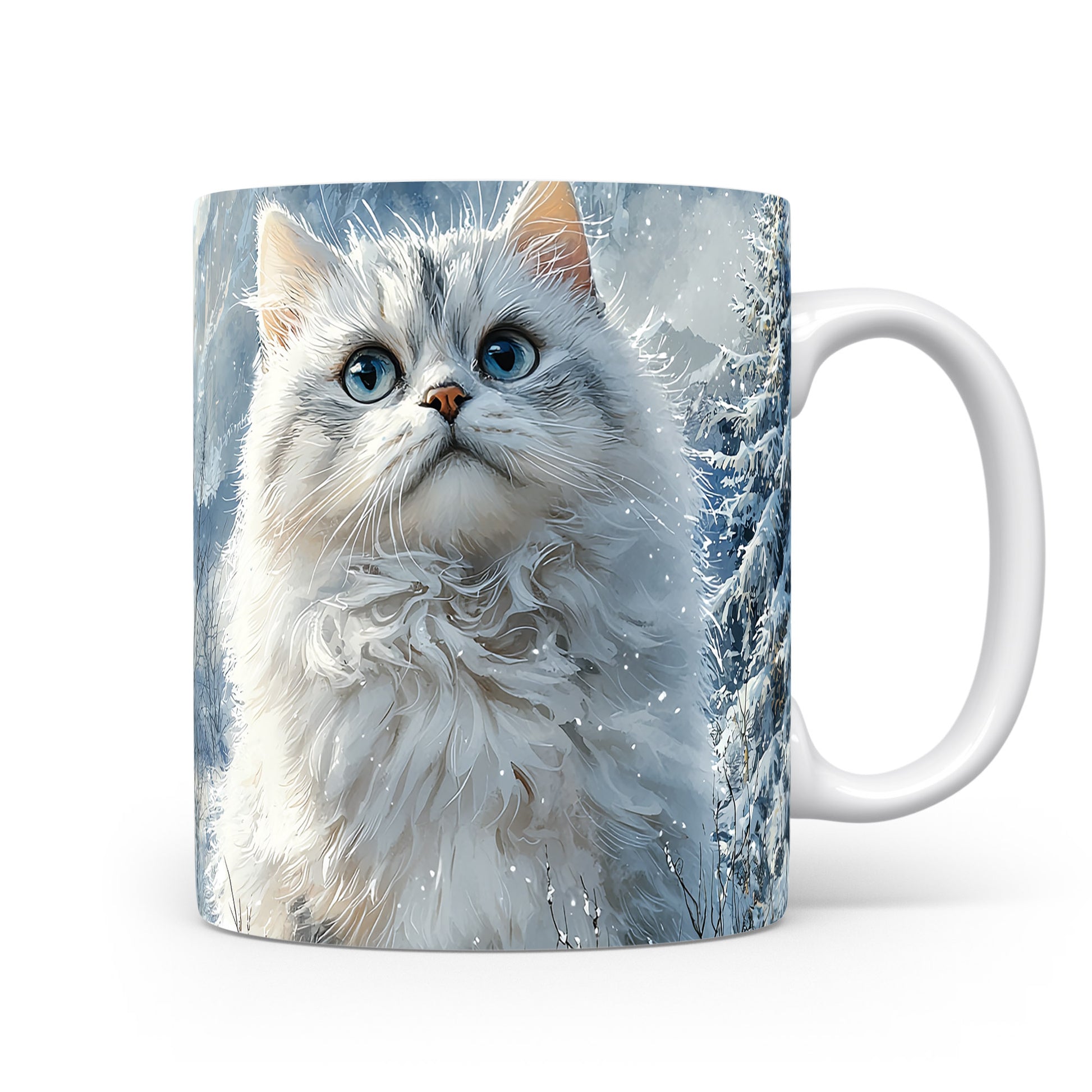 Tento hrnek je zdoben realistickým portrétem kočky s modrýma očima. Je ideální pro milovníky koček a skvělým dárkem pro každého, kdo ocení krásu zimní přírody. Materiál: keramika. Objem: 330 ml. Vhodné do myčky i mikrovlnky. Díky svému designu přináší do každodenního pití špetku elegance a radosti.