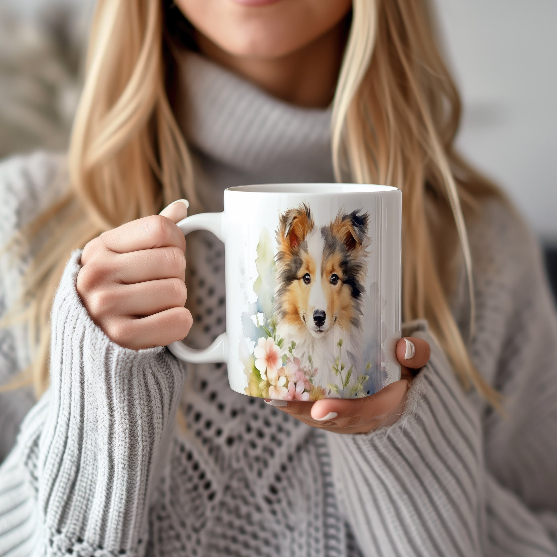 Hrnek s portrétem kolie mezi květinami – modrými detaily