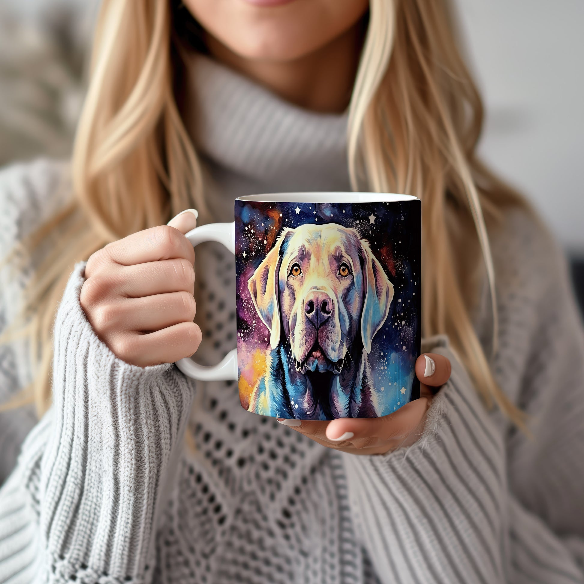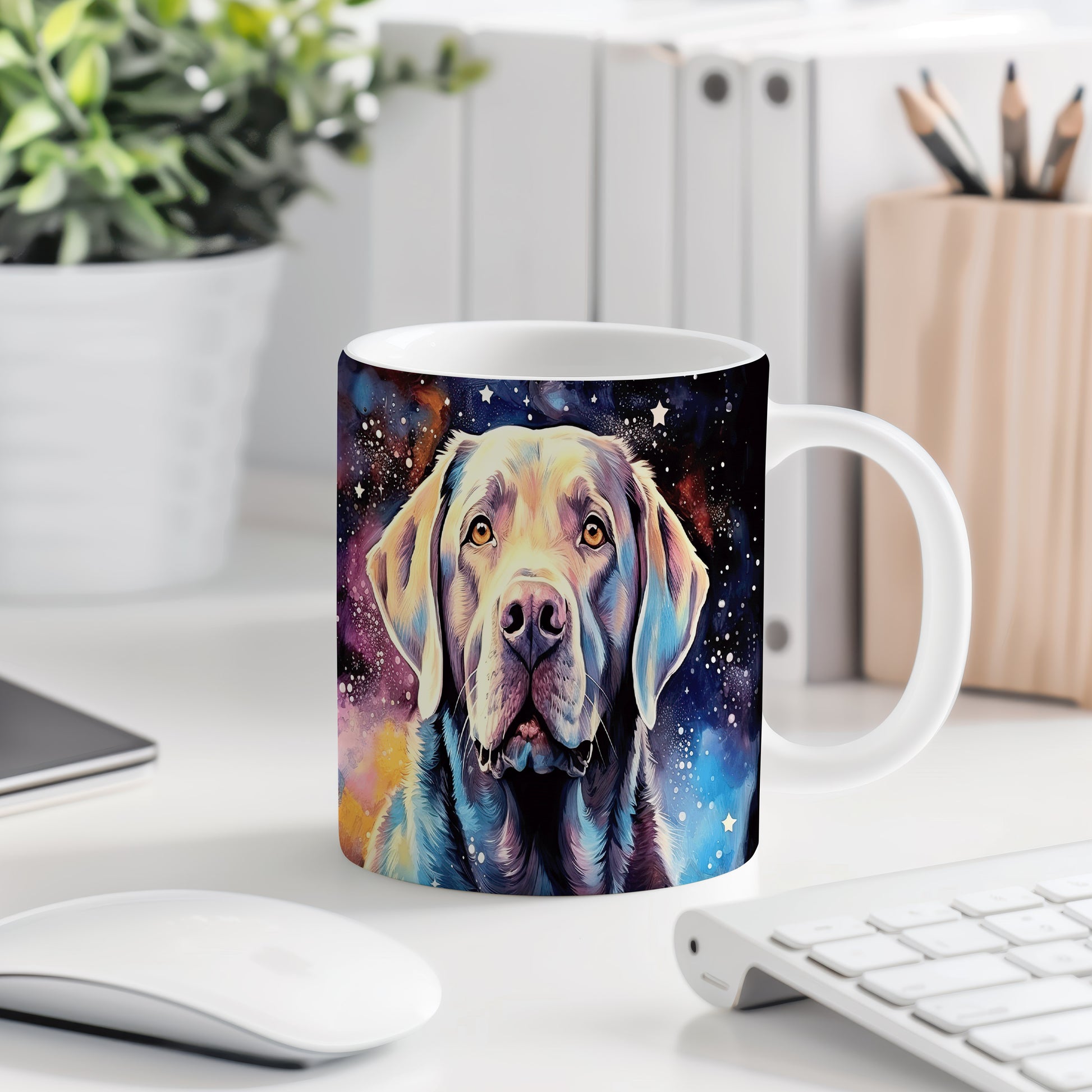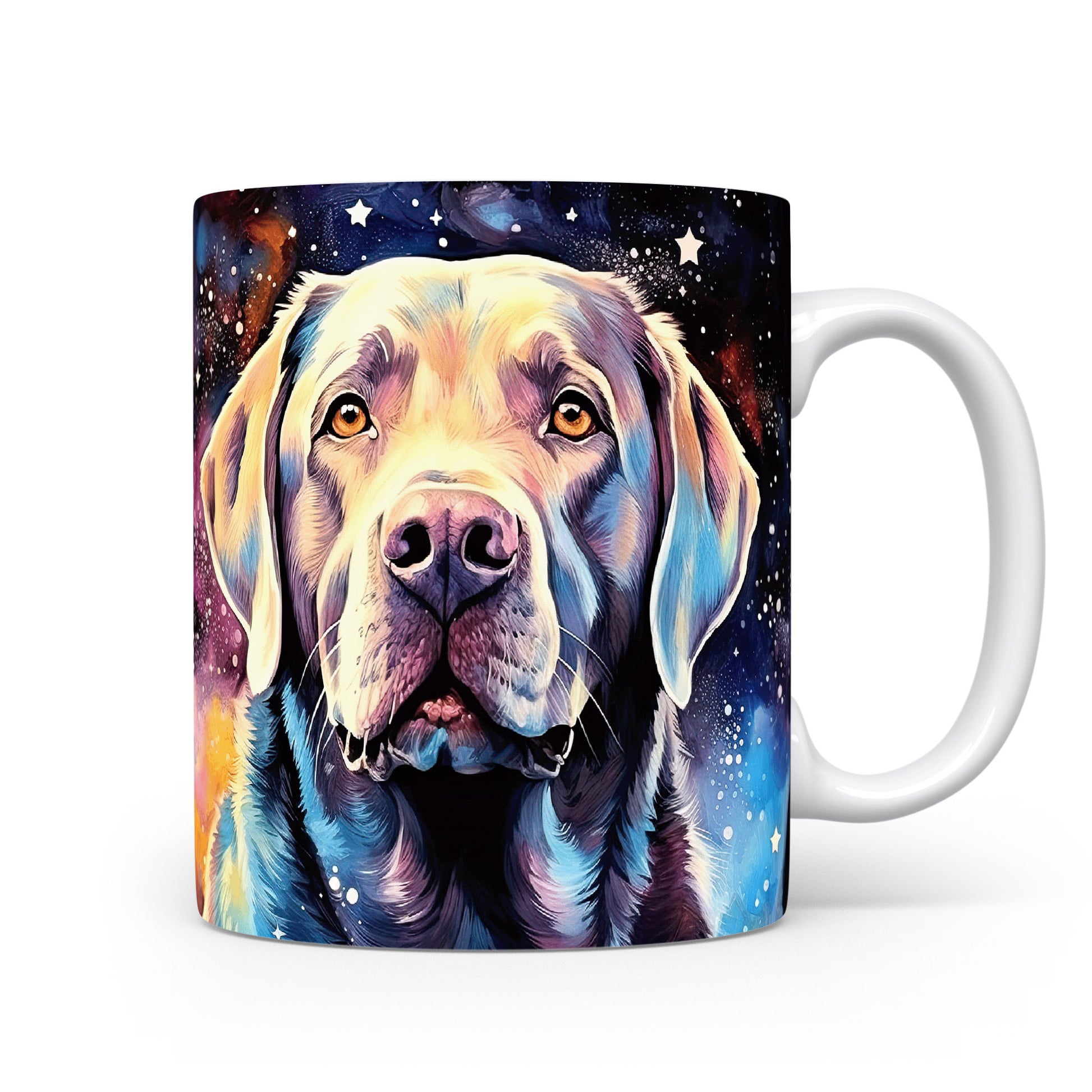 Hrnek s portrétem labradora v kosmickém stylu