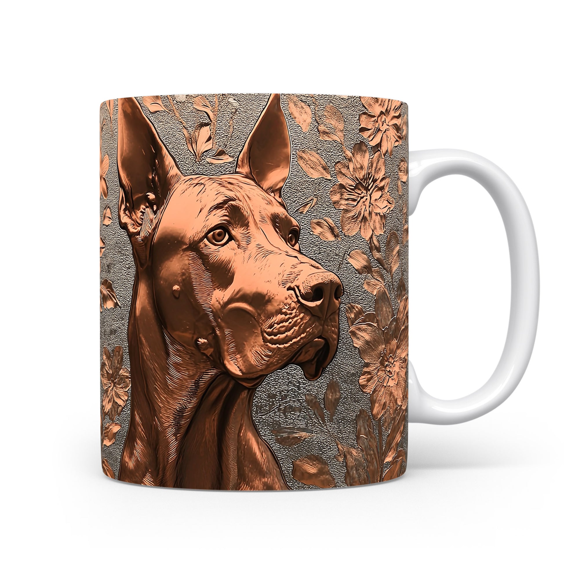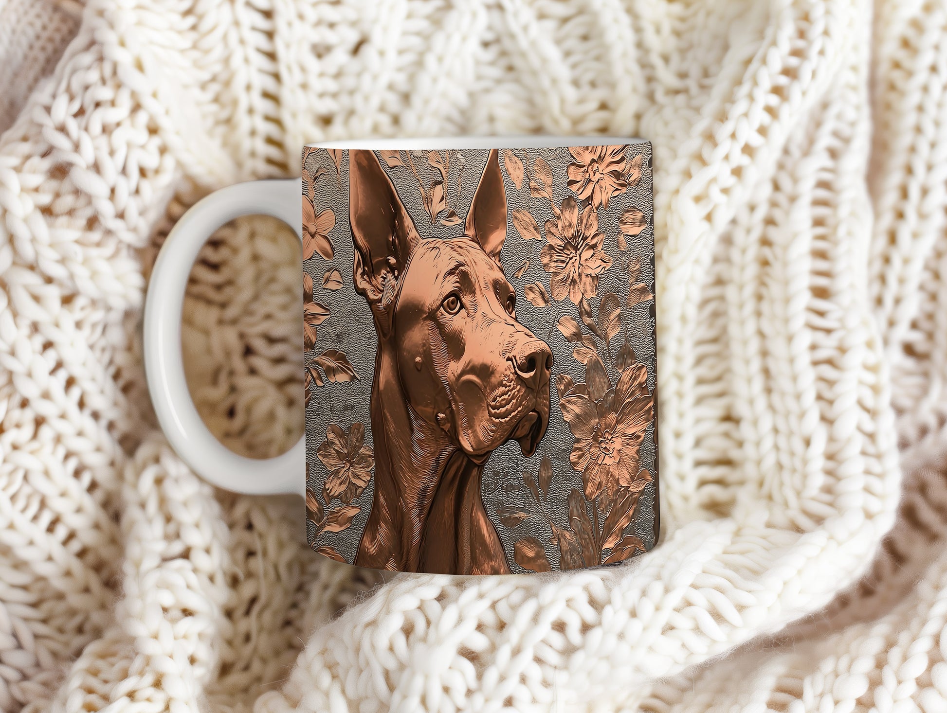 Hrnek s psí hlavou a květinovým pozadím a 3D efektem