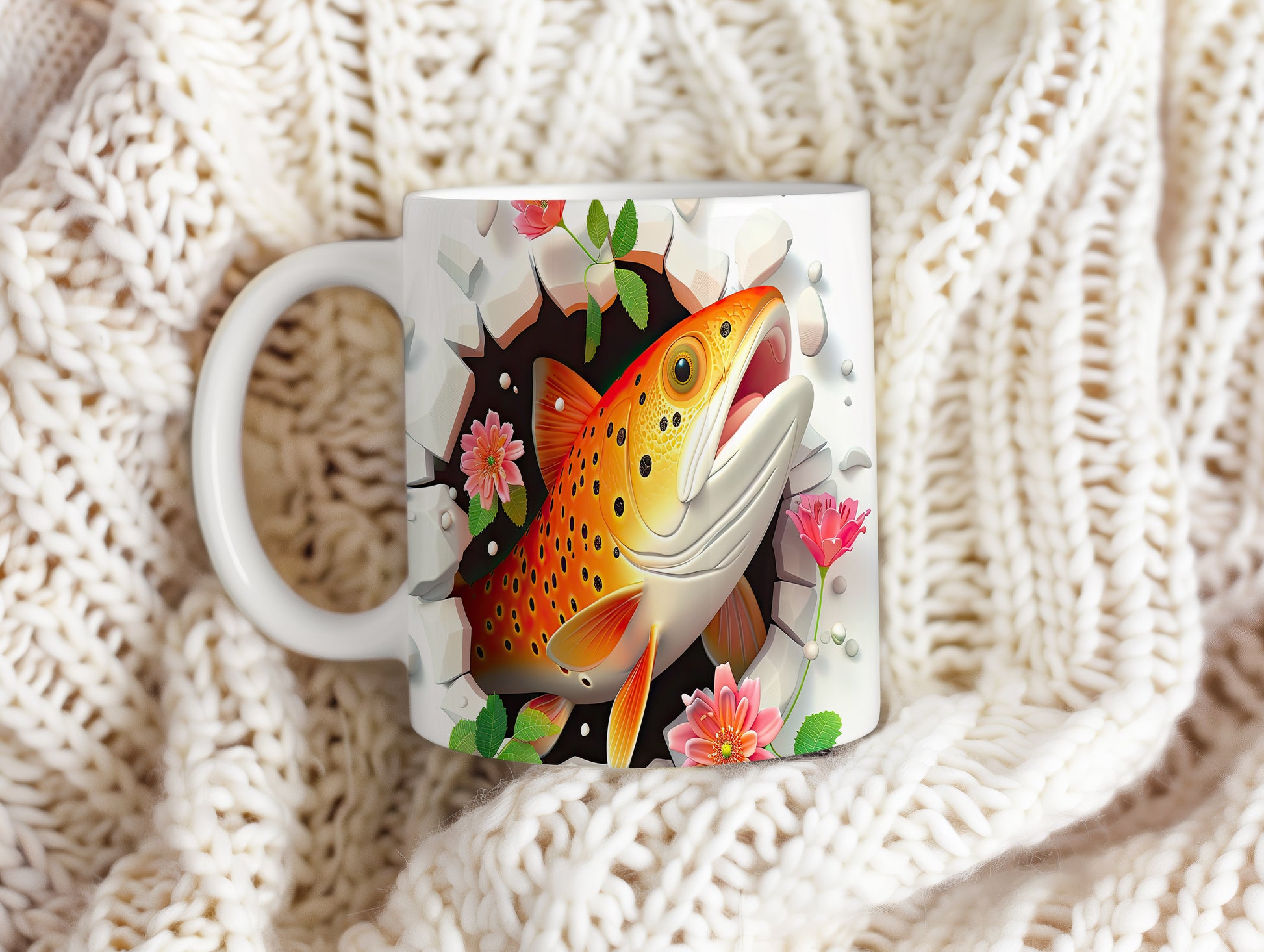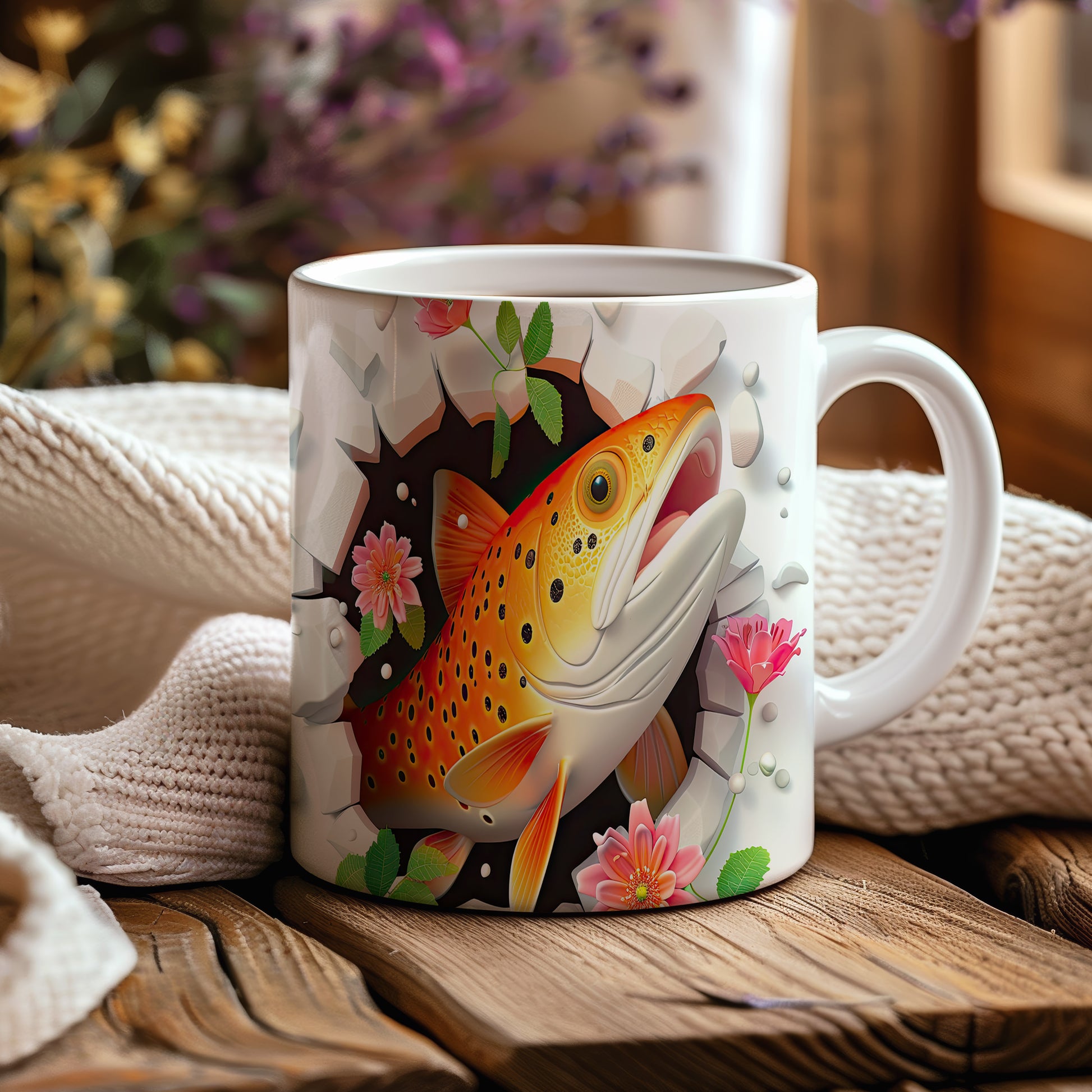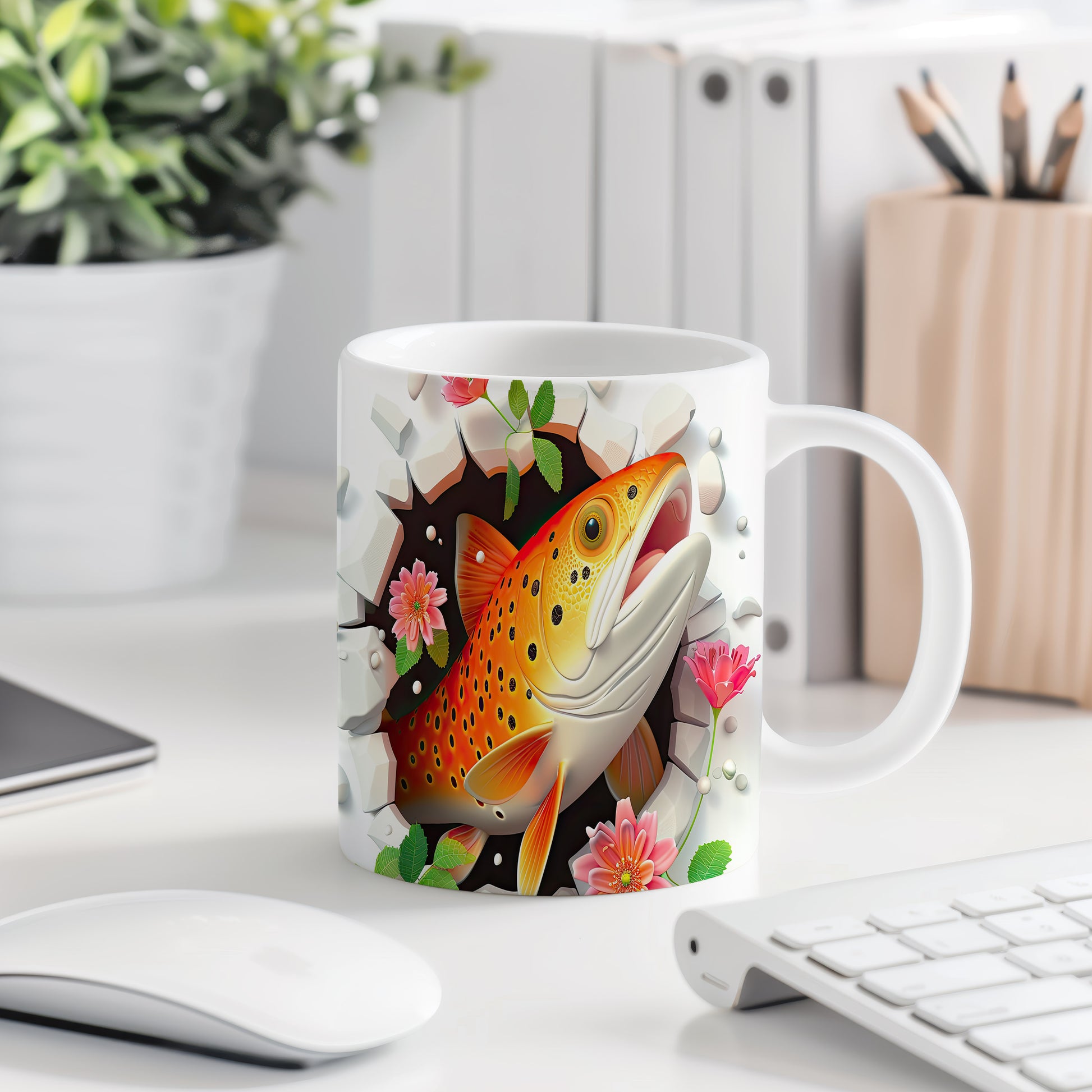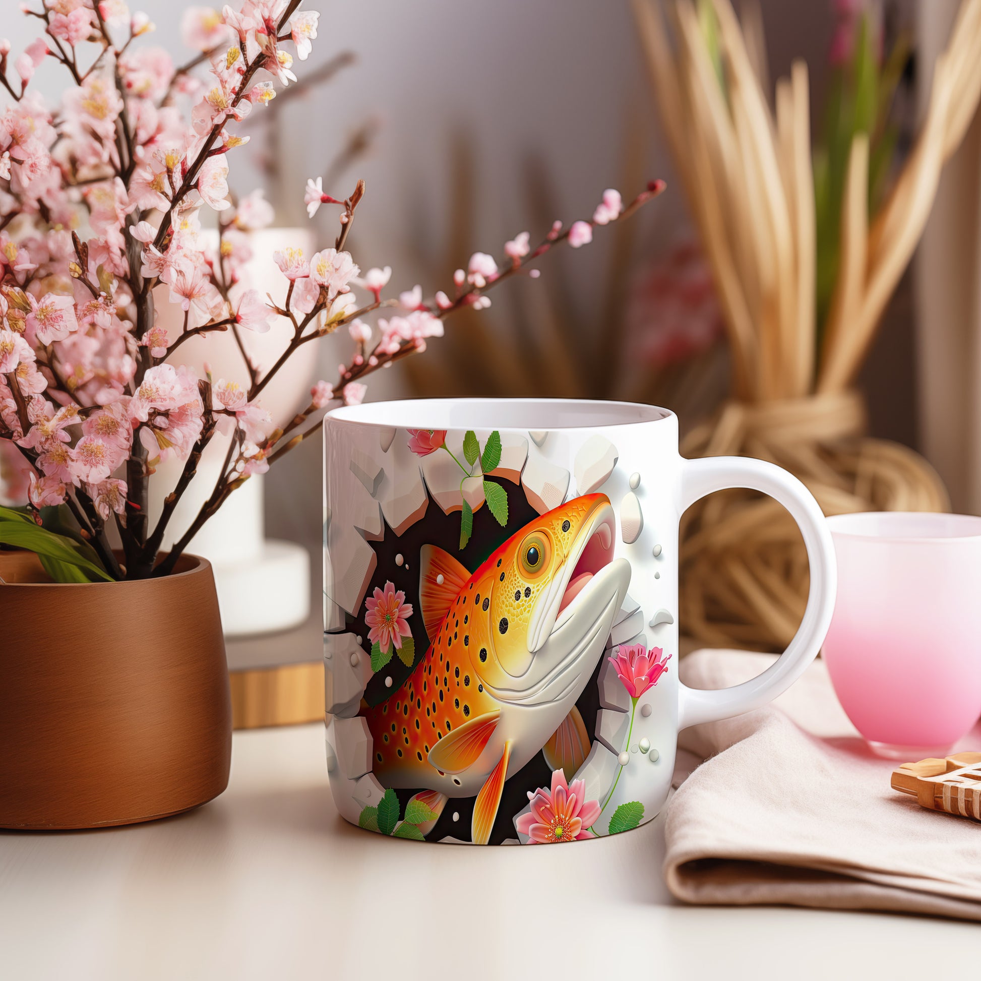 Hrnek s pstruhem a květinami